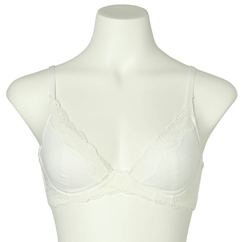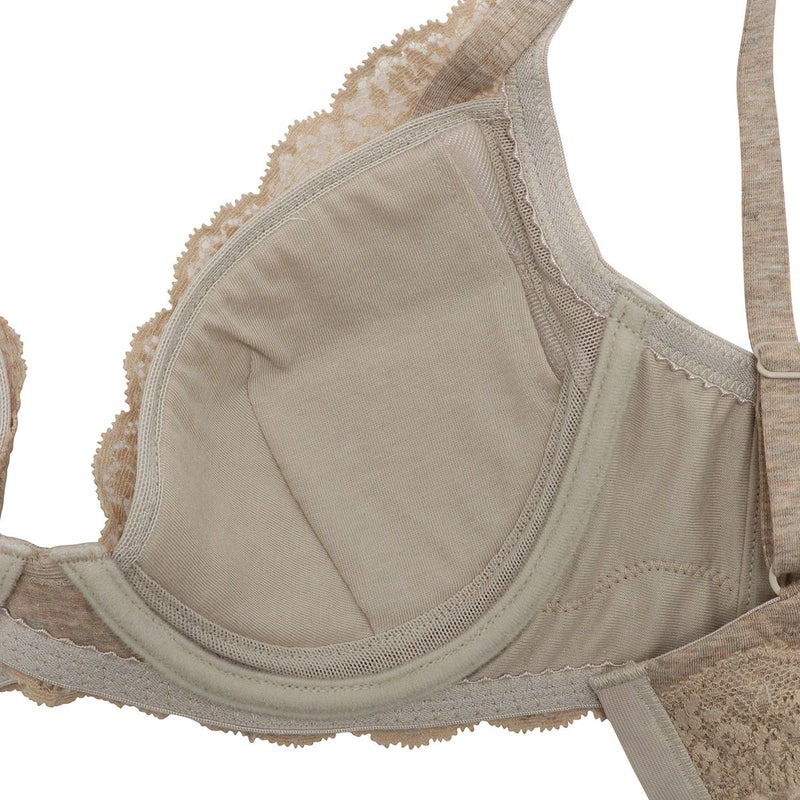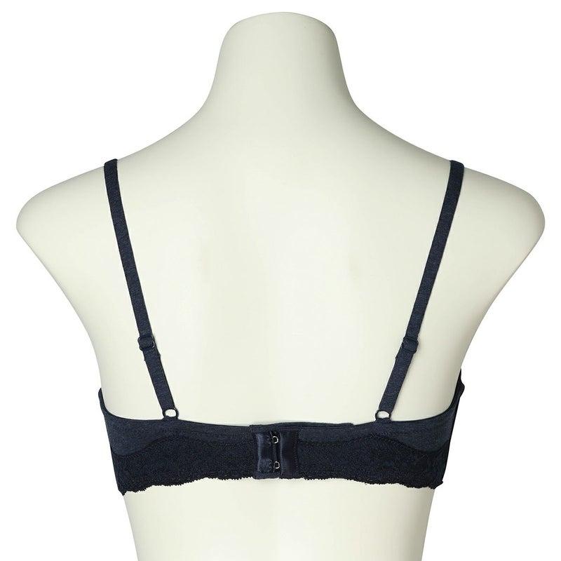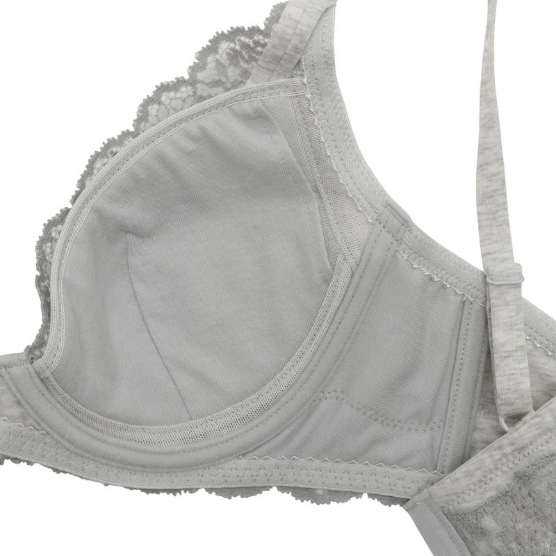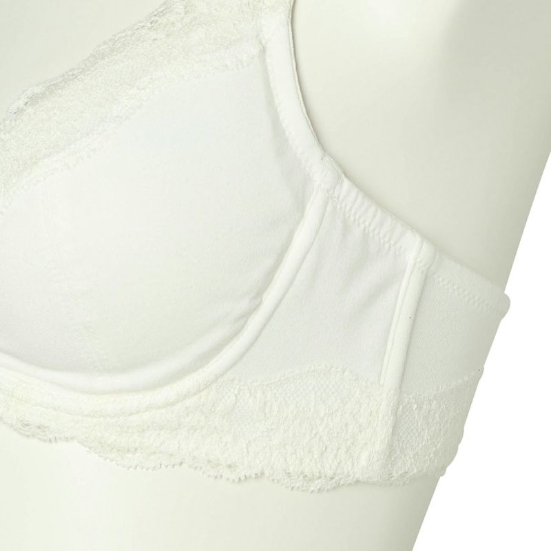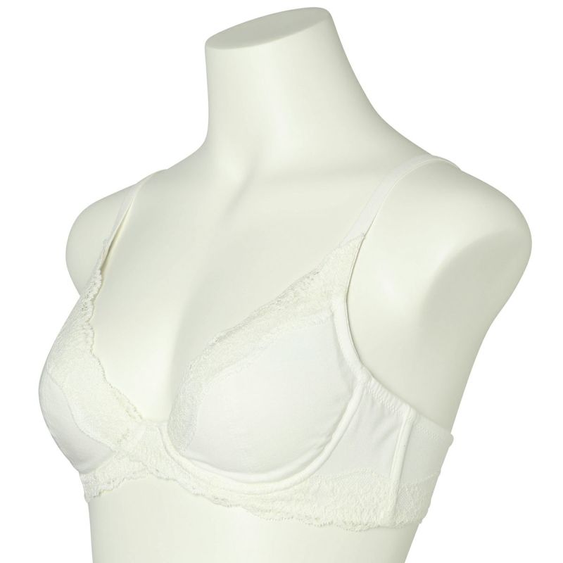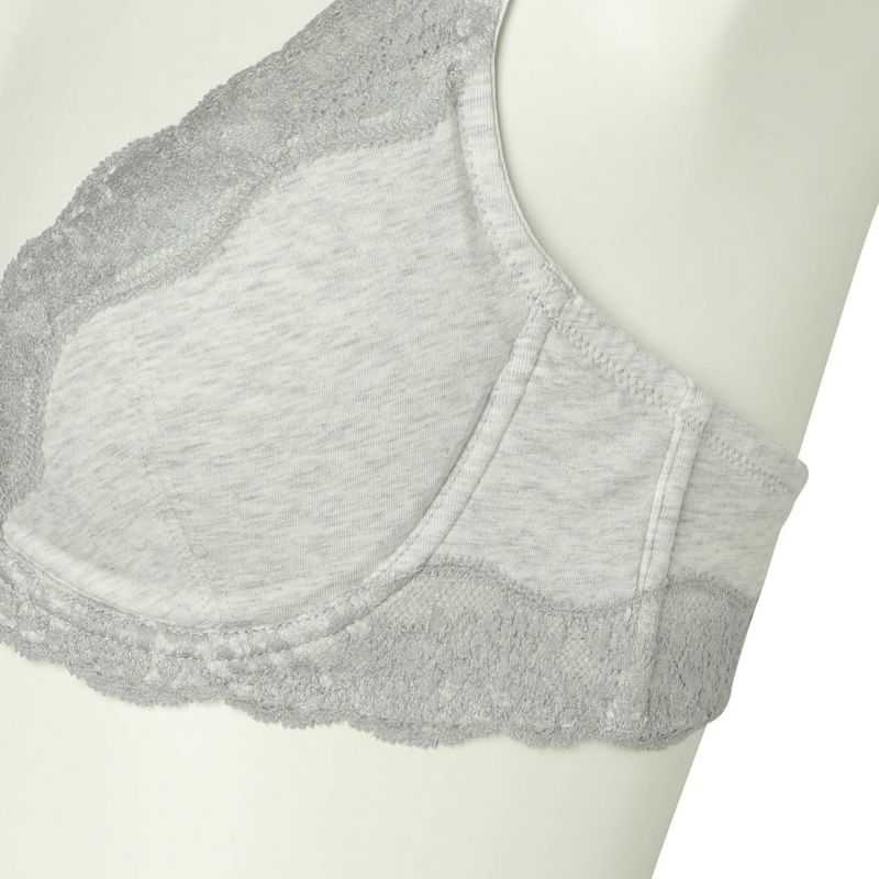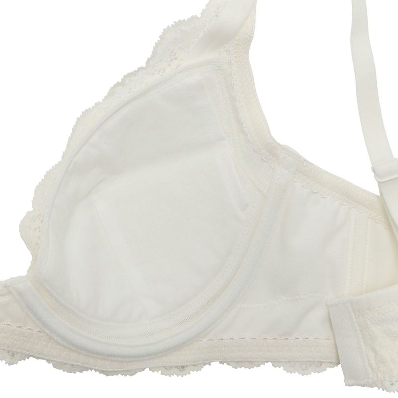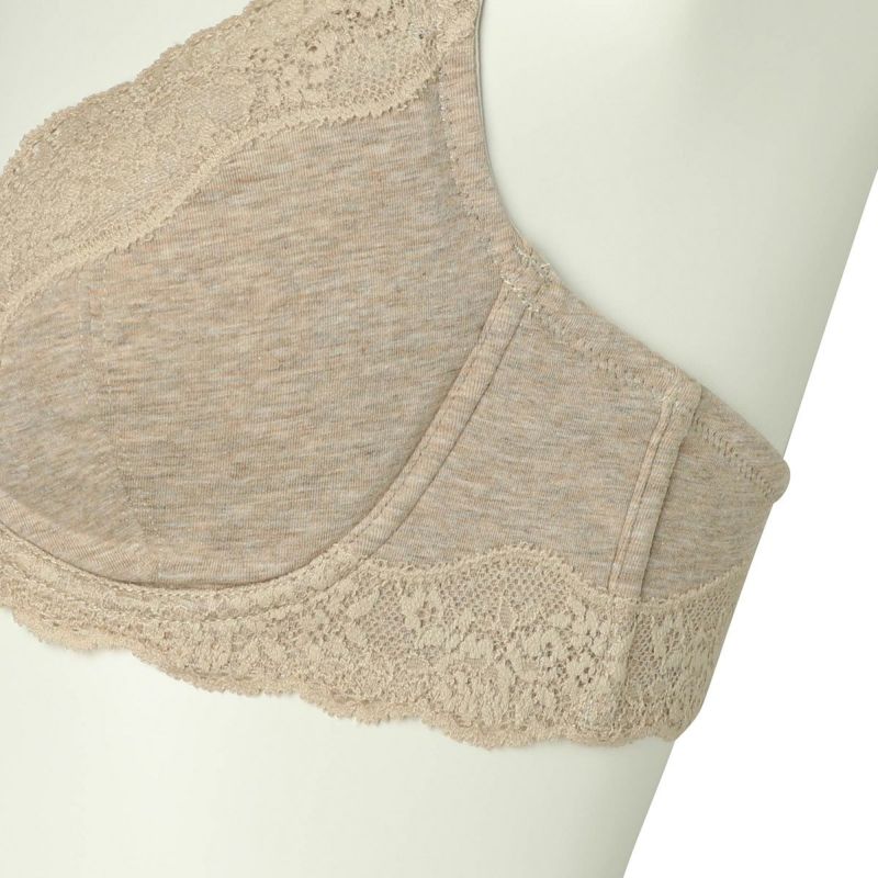 前中心の土台部分をクロス構造にすることで可動域も広くなり体の動きに沿ってくれるワイヤーブラジャー。サイズの許容が広く体型の変化にも対応する設計。サイドにボーン入りでバランスよく左右のバストをほどよくホールドしてくれます。広めのワイヤーで脇がはみ出やすい方にもおすすめ。カップ内側のバスト円隔部分にはパワーネットを使用しストレッチ性を持たせ圧迫のない着け心地。上カップのストレッチレースが馴染むのでカップも浮きにくい。カップ肌側、サイドは綿天竺、アンダーは綿混ベア天でできるだけ肌への優しさにこだわりました。
