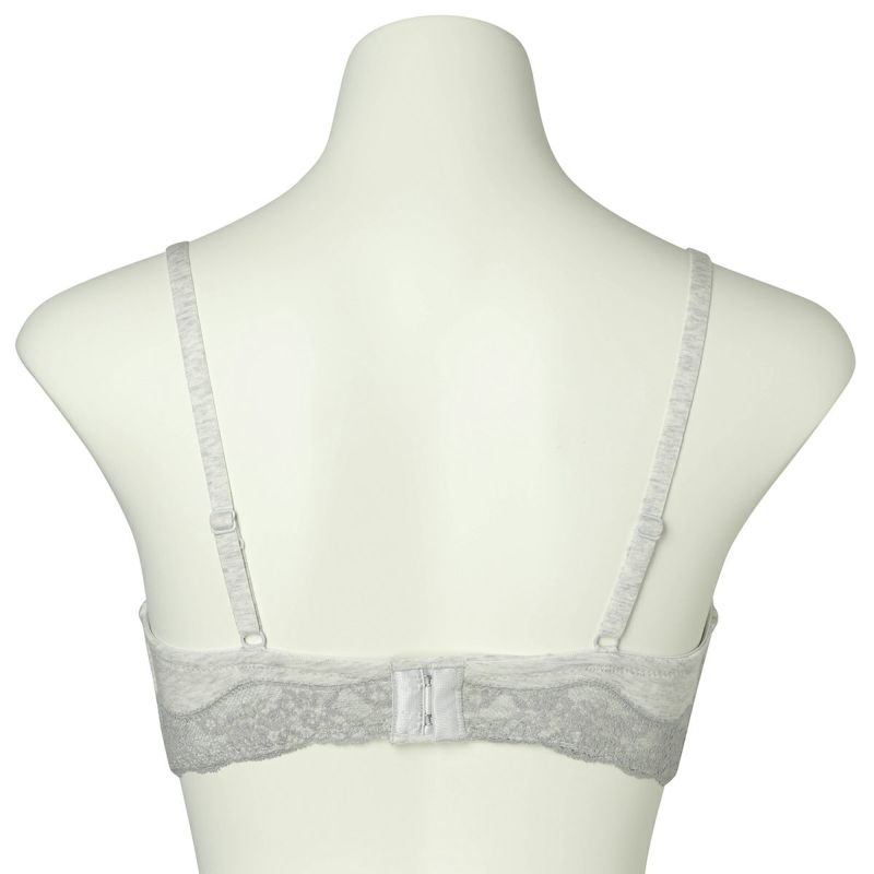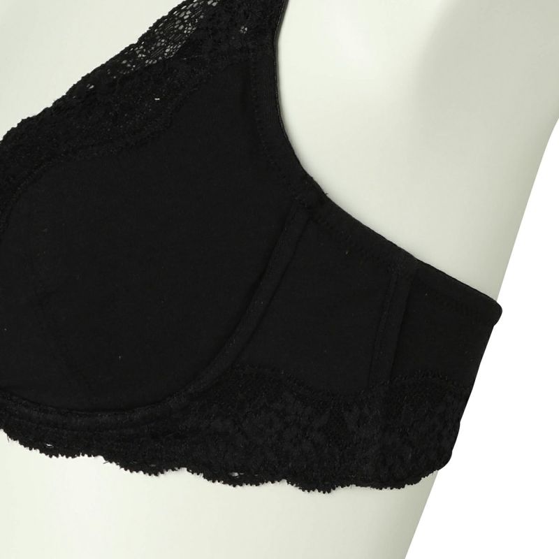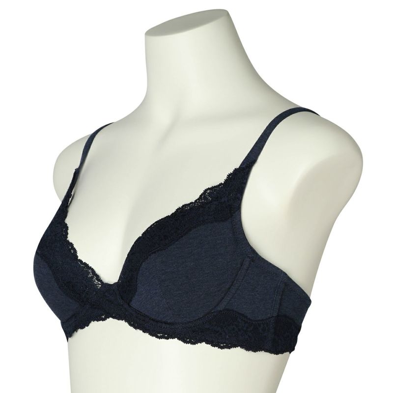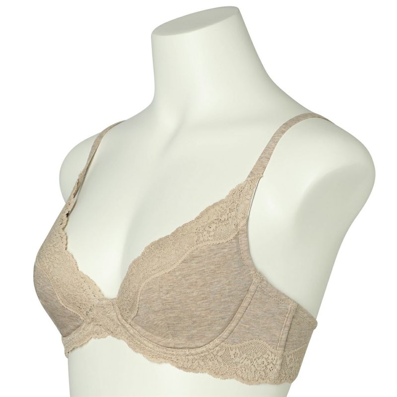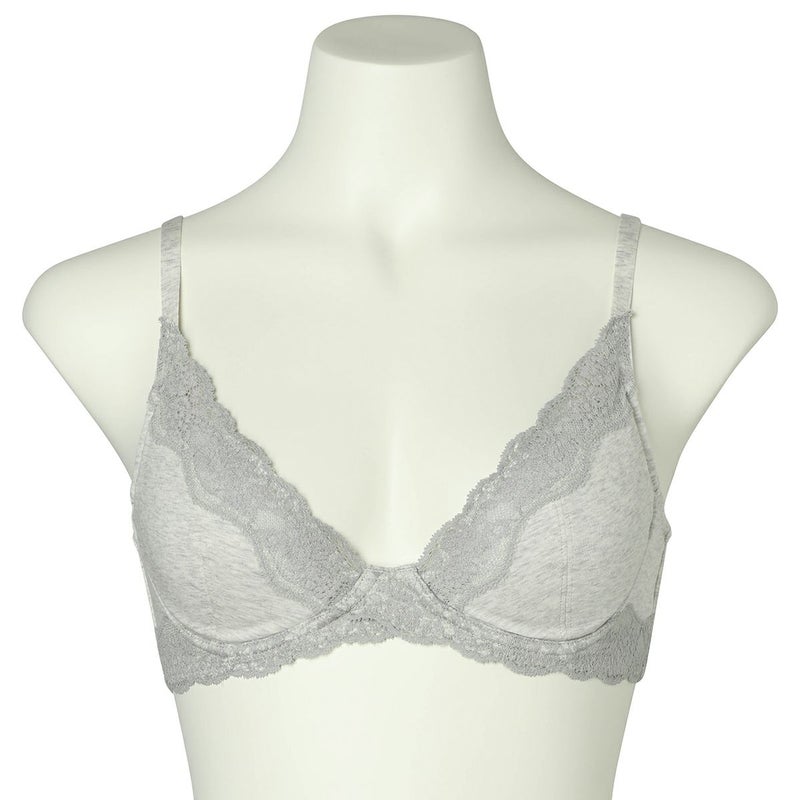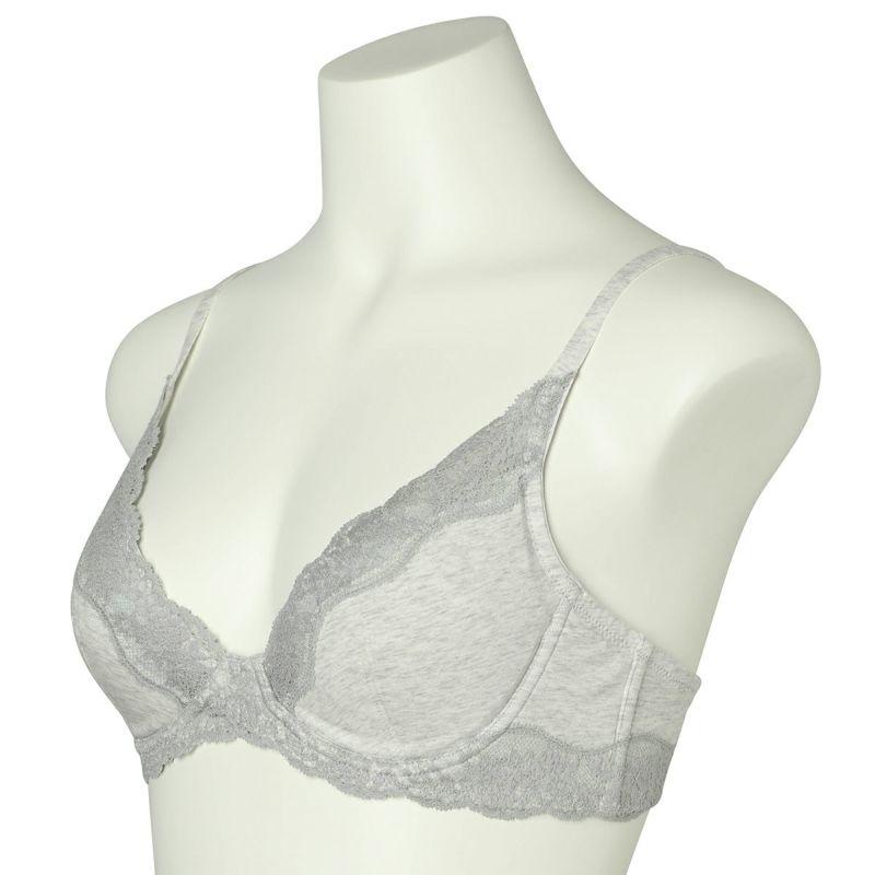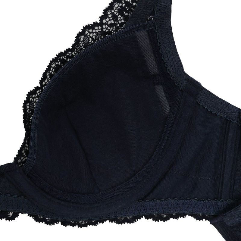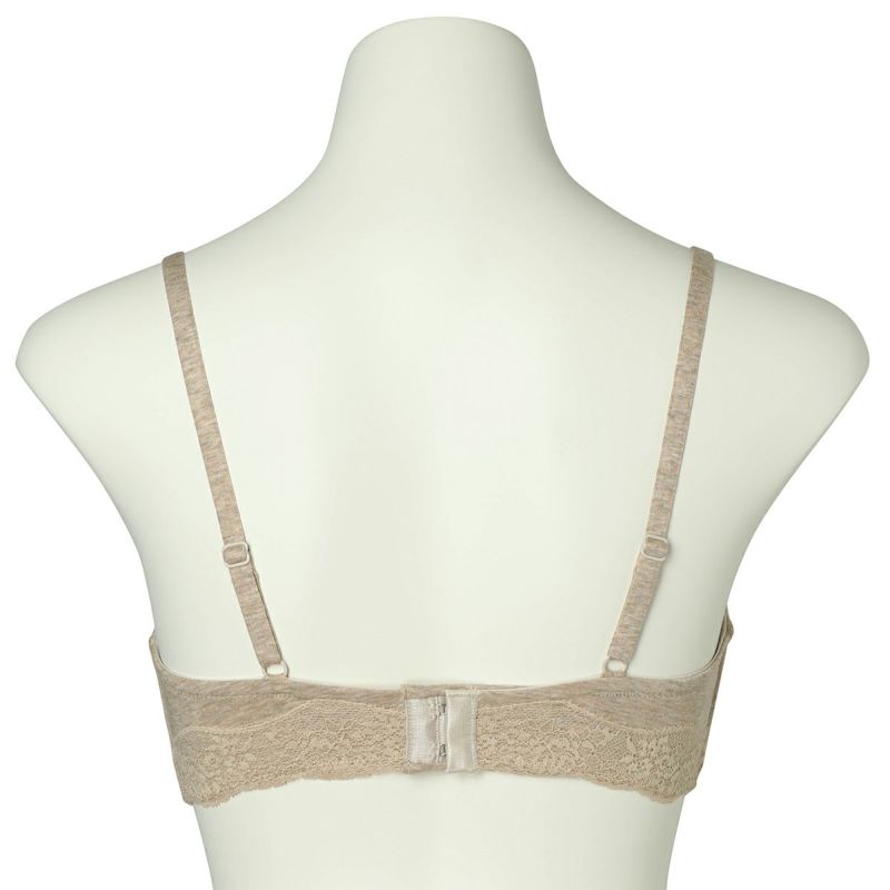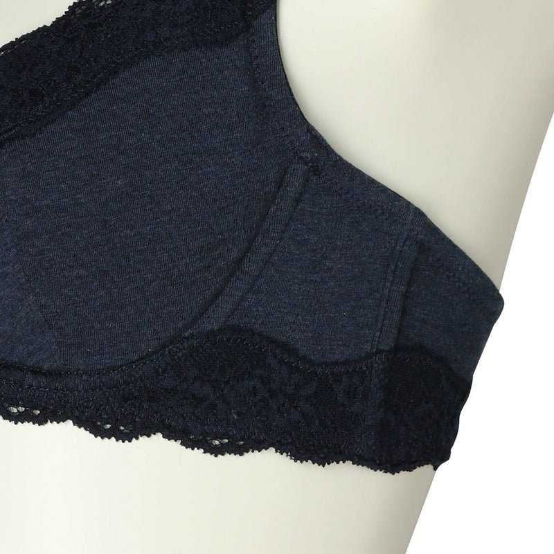 前中心の土台部分をクロス構造にすることで可動域も広くなり体の動きに沿ってくれるワイヤーブラジャー。サイズの許容が広く体型の変化にも対応する設計。サイドにボーン入りでバランスよく左右のバストをほどよくホールドしてくれます。広めのワイヤーで脇がはみ出やすい方にもおすすめ。カップ内側のバスト円隔部分にはパワーネットを使用しストレッチ性を持たせ圧迫のない着け心地。上カップのストレッチレースが馴染むのでカップも浮きにくい。カップ肌側、サイドは綿天竺、アンダーは綿混ベア天でできるだけ肌への優しさにこだわりました。