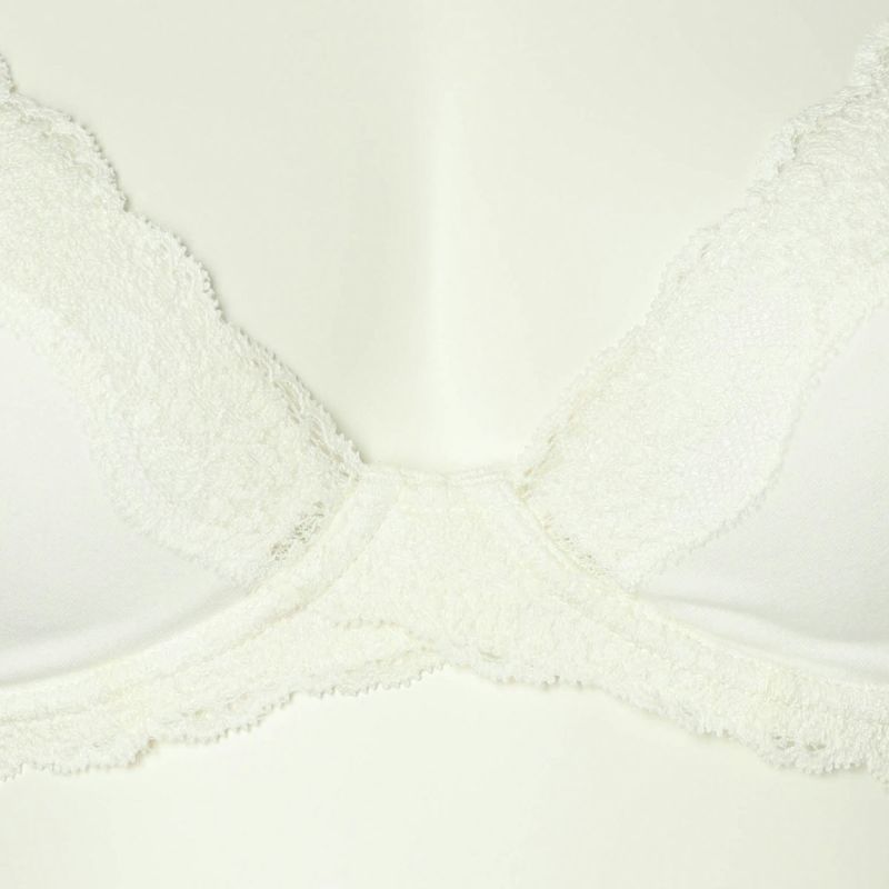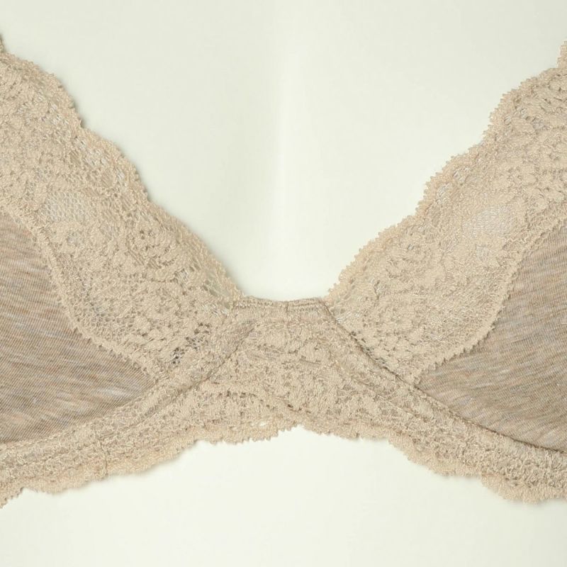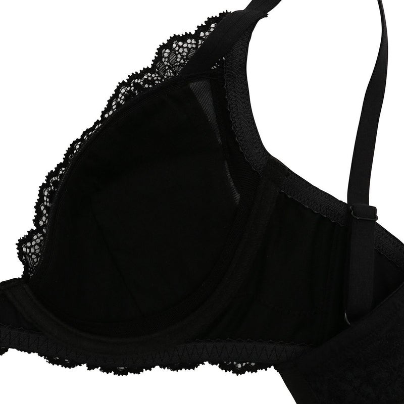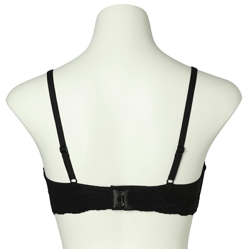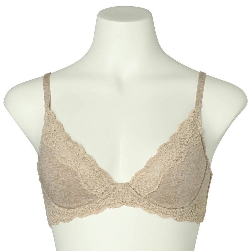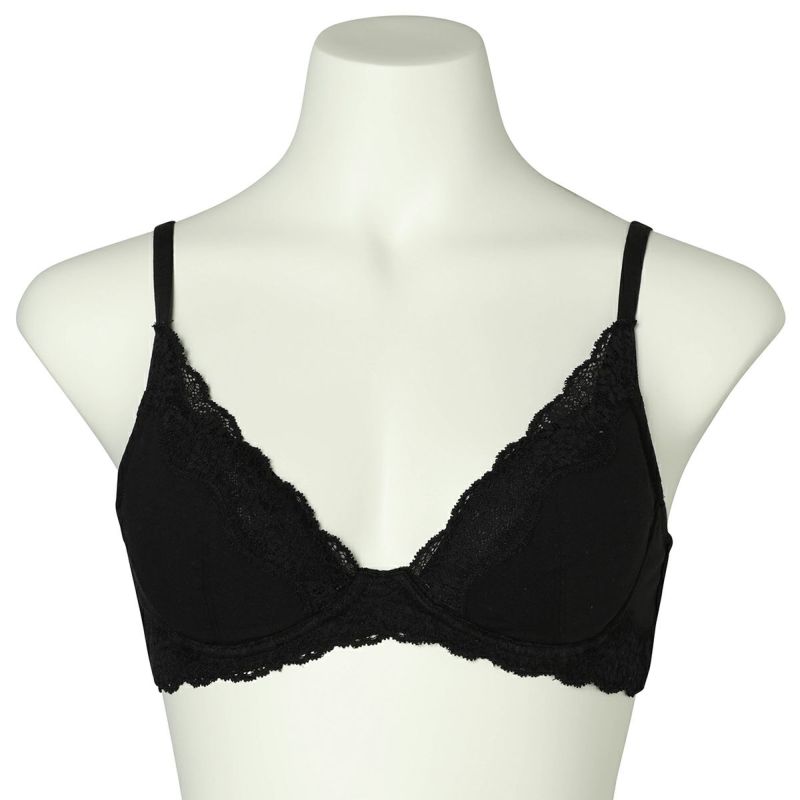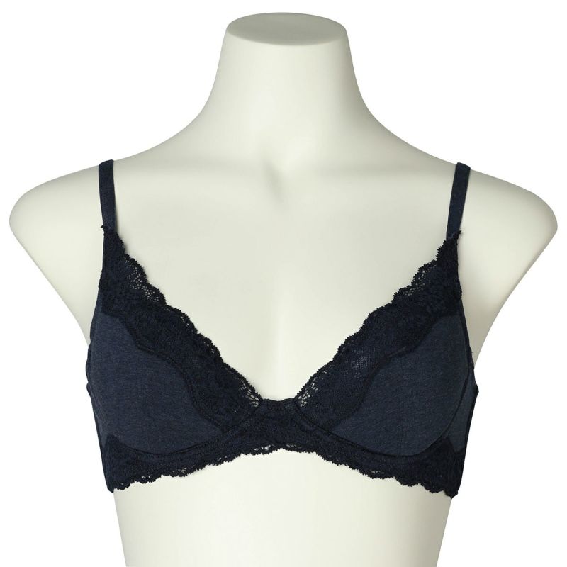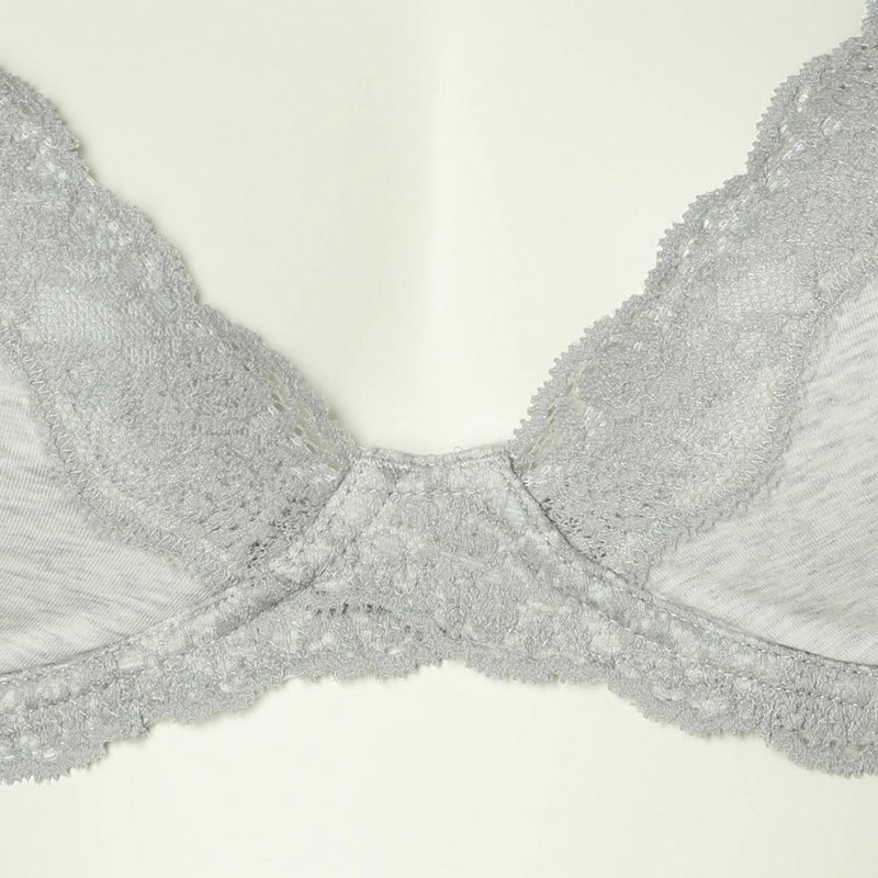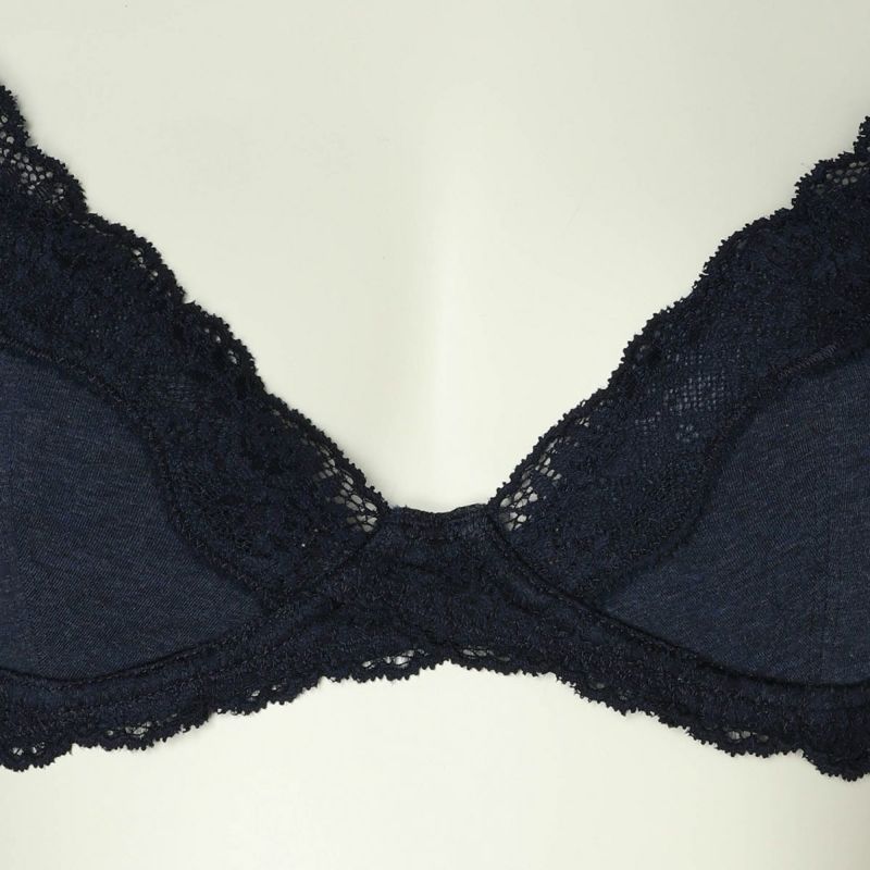 前中心の土台部分をクロス構造にすることで可動域も広くなり体の動きに沿ってくれるワイヤーブラジャー。サイズの許容が広く体型の変化にも対応する設計。サイドにボーン入りでバランスよく左右のバストをほどよくホールドしてくれます。広めのワイヤーで脇がはみ出やすい方にもおすすめ。カップ内側のバスト円隔部分にはパワーネットを使用しストレッチ性を持たせ圧迫のない着け心地。上カップのストレッチレースが馴染むのでカップも浮きにくい。カップ肌側、サイドは綿天竺、アンダーは綿混ベア天でできるだけ肌への優しさにこだわりました。