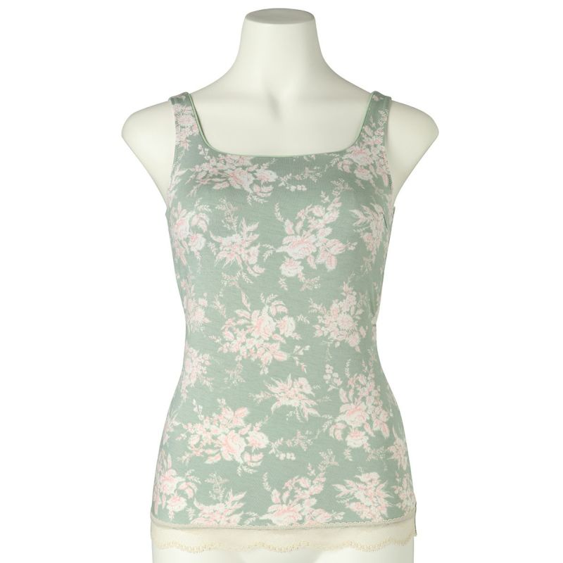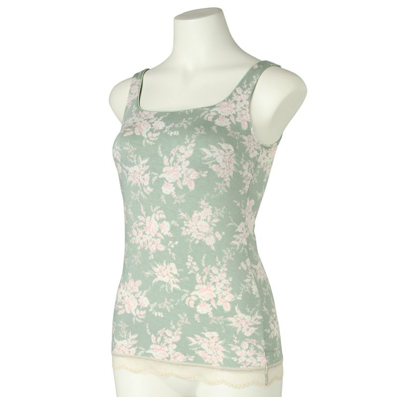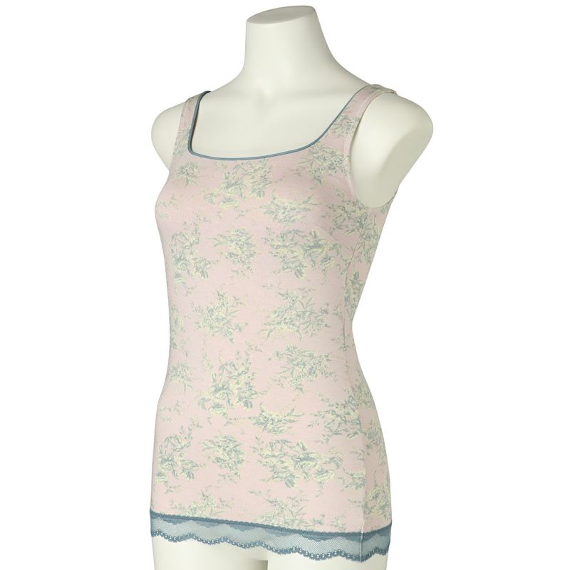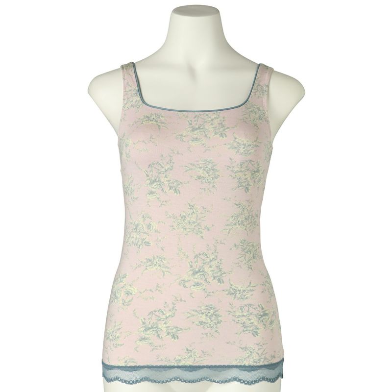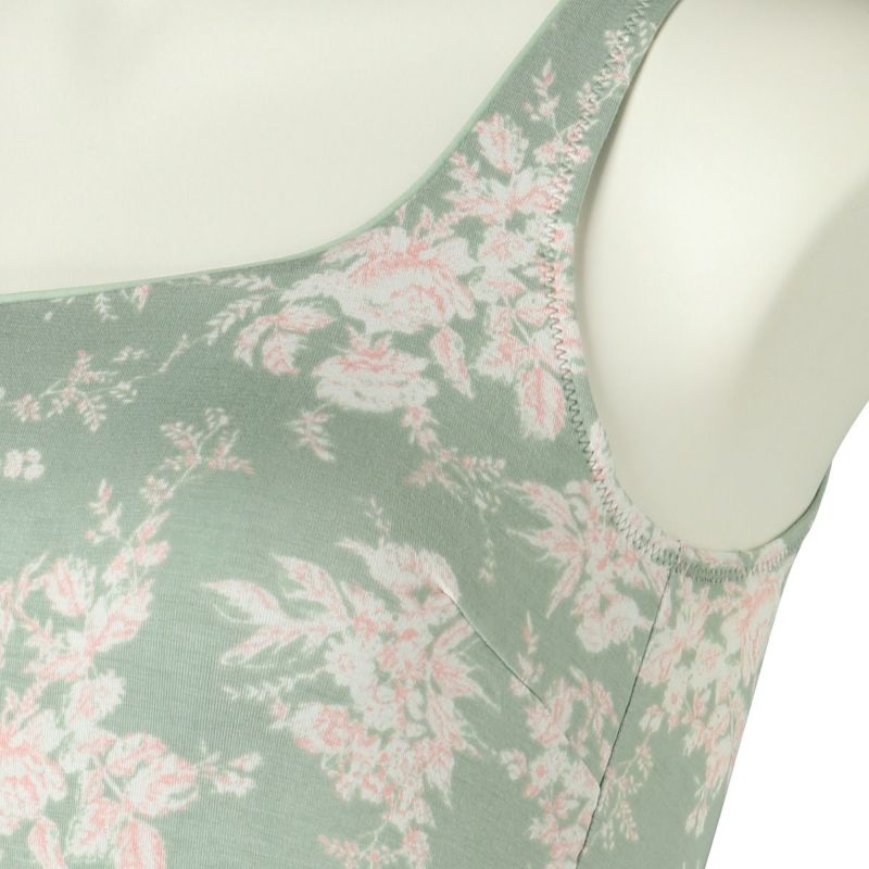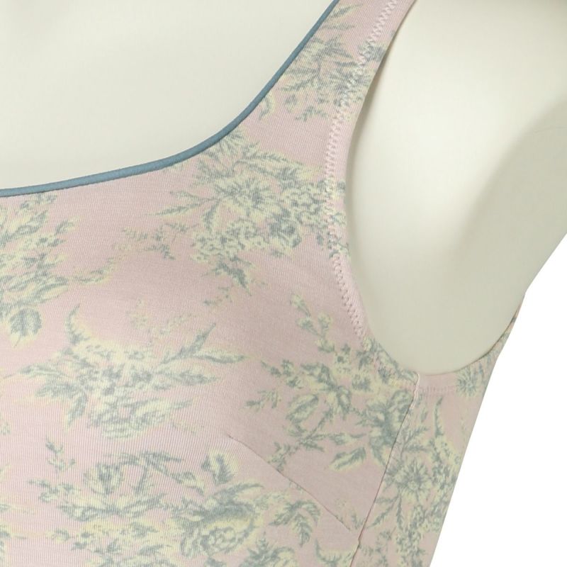 カップ付キャミソールは、インナーレスで1枚で着用できる便利なアイテム。パイピングを施したスクエアネックで透け感もなく下着見えしないのでルームウェアやシアーなトップスにくみ合わせても楽しめる。裏地が前のみの綿ベア天で肌に優しい仕様に。
