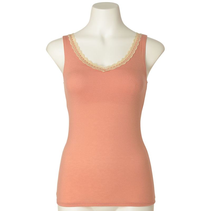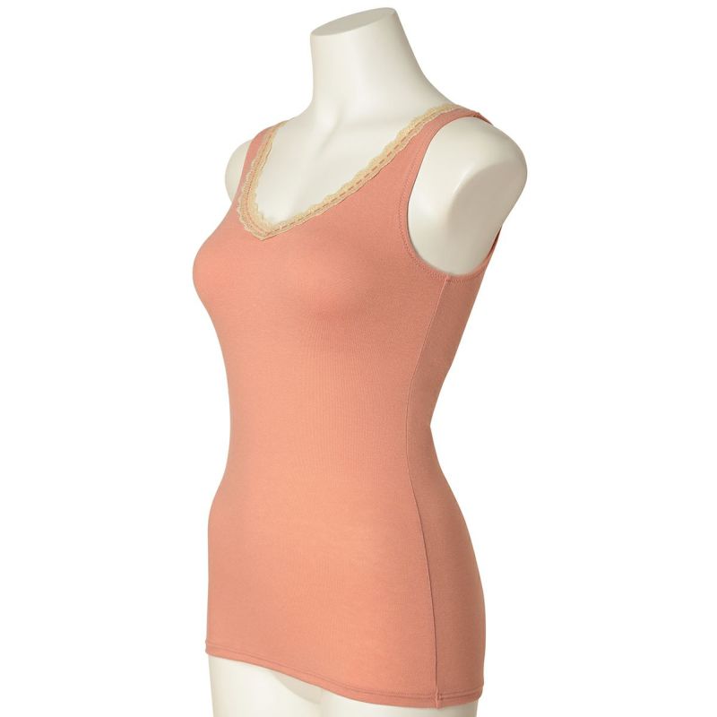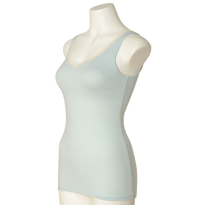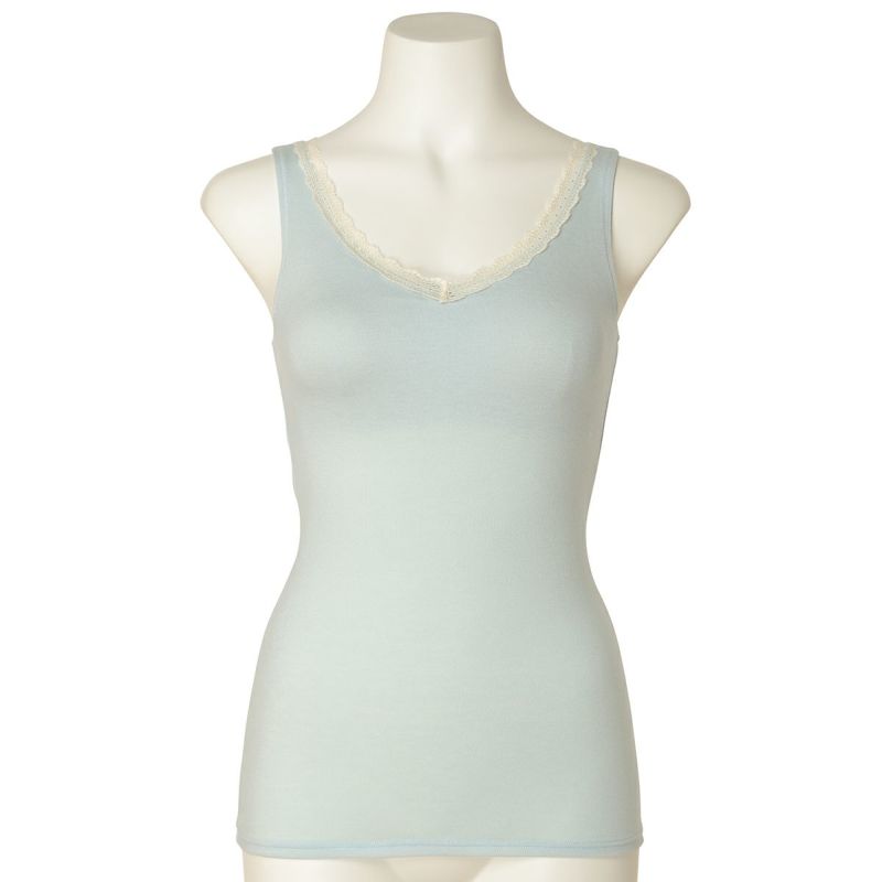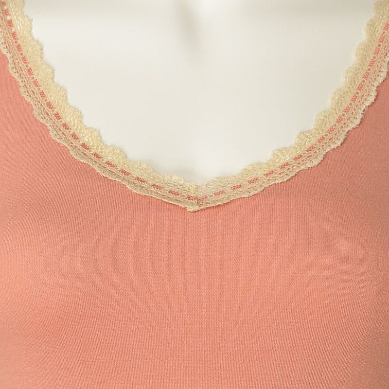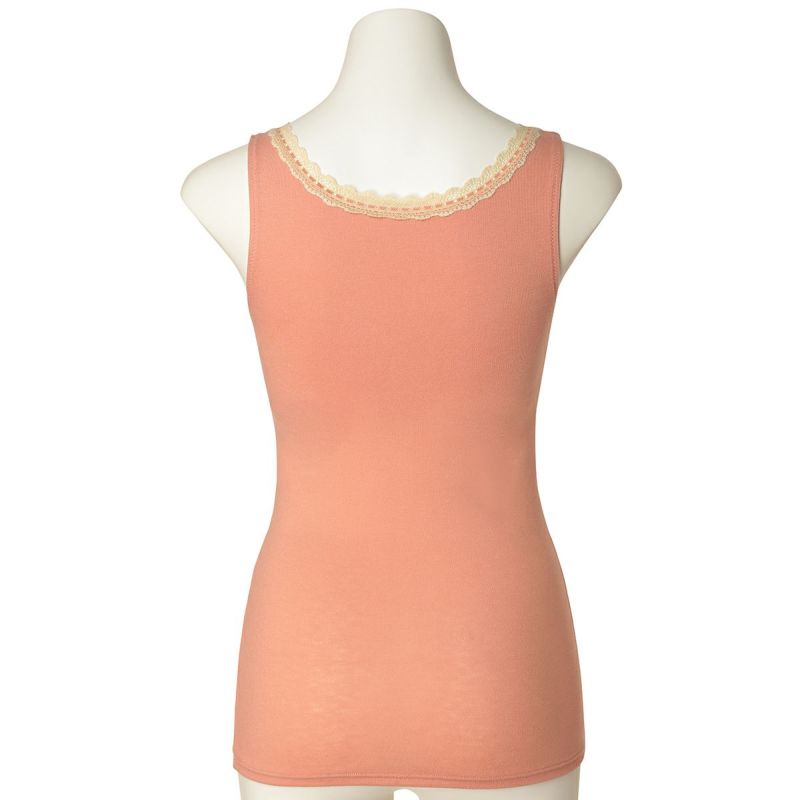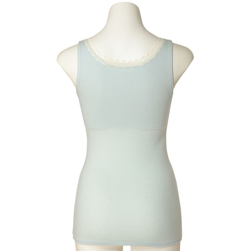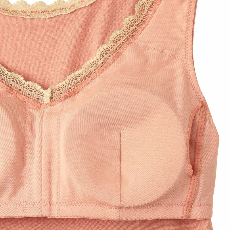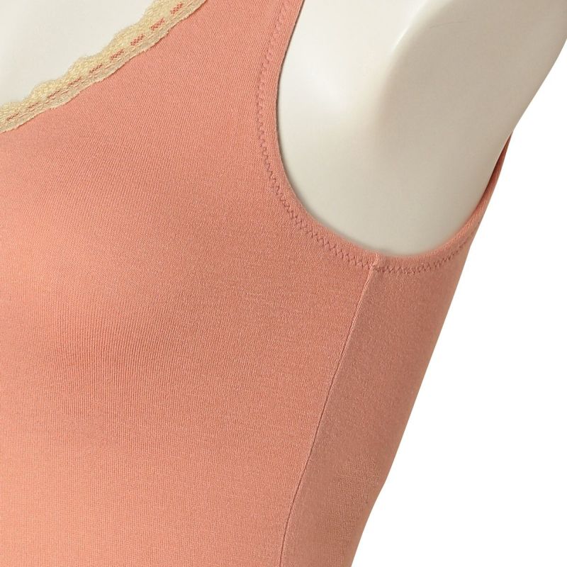 丸型パッド付きなのでブラジャー無しで1枚で着れる便利なアイテム。フロントから背中にかけたリボンを通したような配色レースがポイント。カップ裏地が背中まであり適度なホールド感。カップ肌側裏地は綿ベア天。
