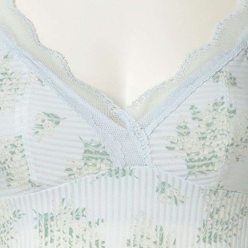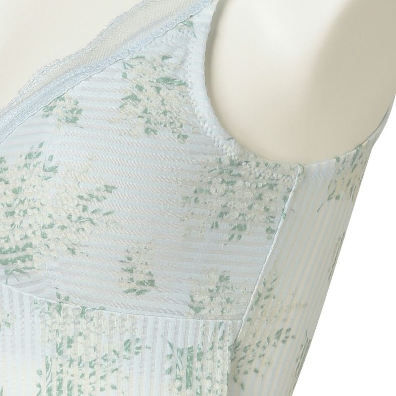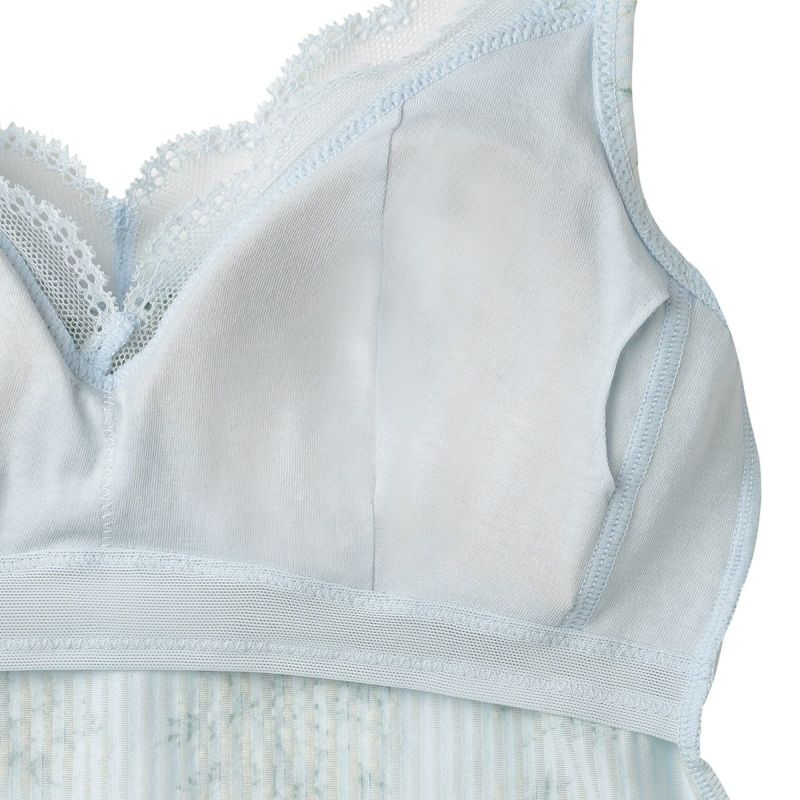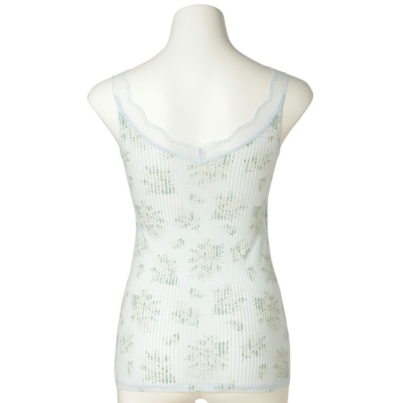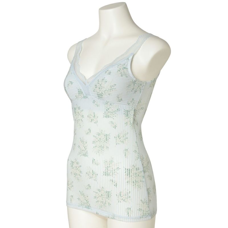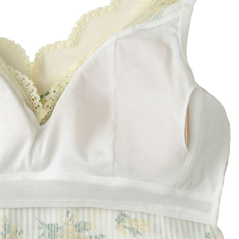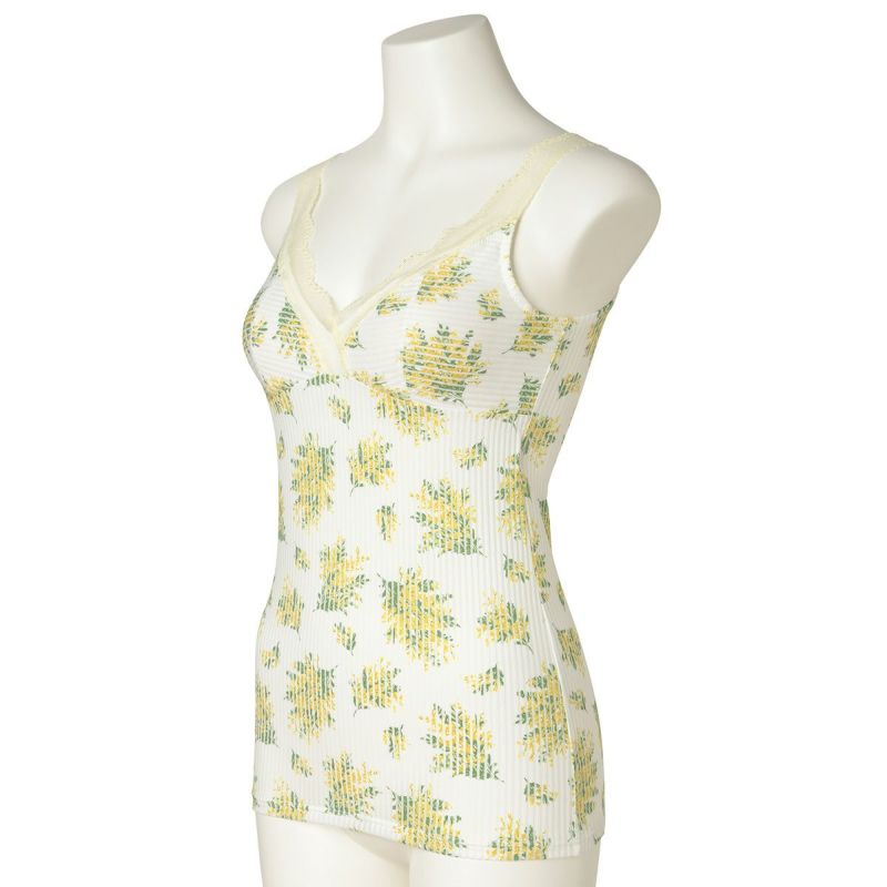 ミモザの総柄のカップ付キャミソールは、柄をぞんぶんに楽しめるアイテム。ブラジャー無しで1枚で便利に着られる。組み合わせたレースのメッシュのような透け感が上品なアクセントを添えより華やかに。デコルテをすっきり綺麗に見せるV字開き。カップ裏地が前身のみのソフトな着用感。背中側に裏地がないため段差になりにくく滑らかにすっきり着れる。カップ肌側は綿天竺、アンダー部分にはゴムではなく伸縮性のある綿混パワーネットを使用しているため心地よくフィット。