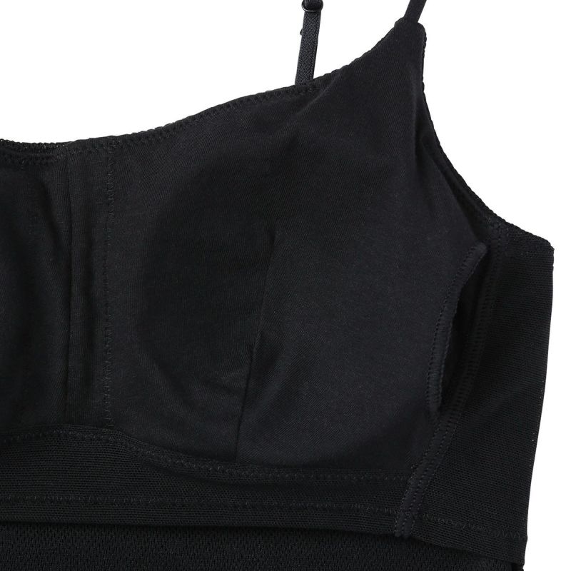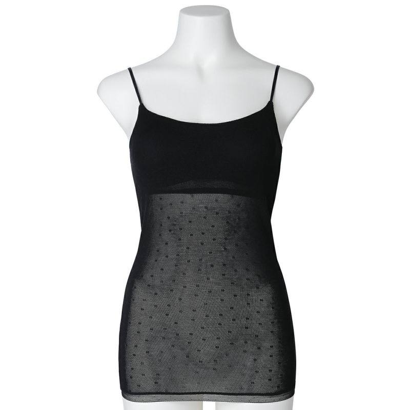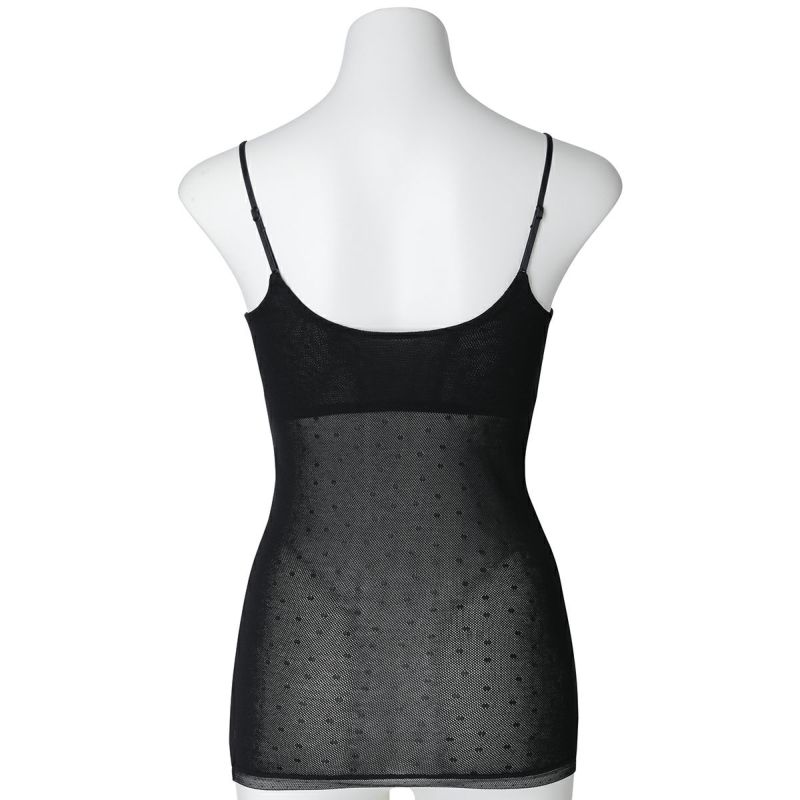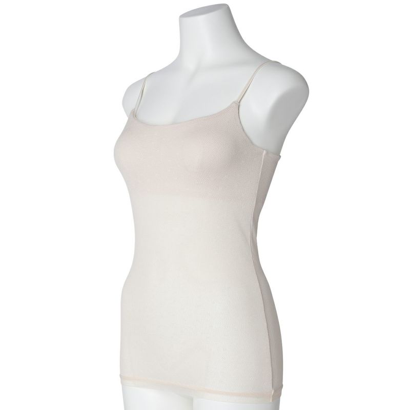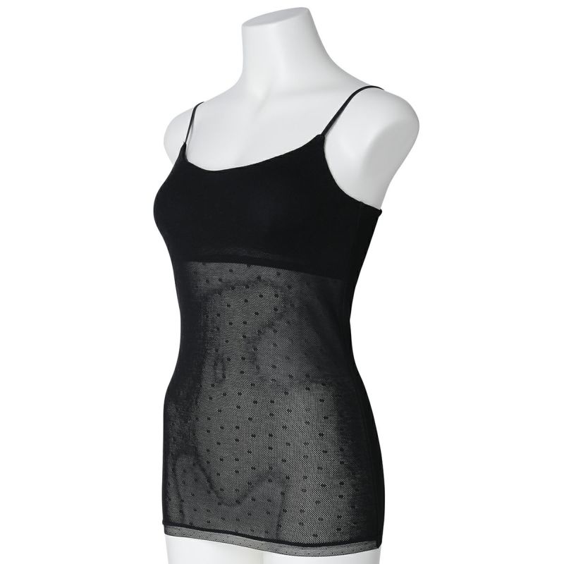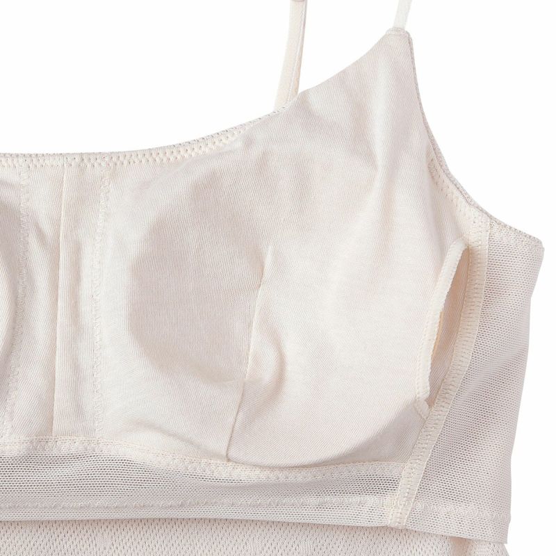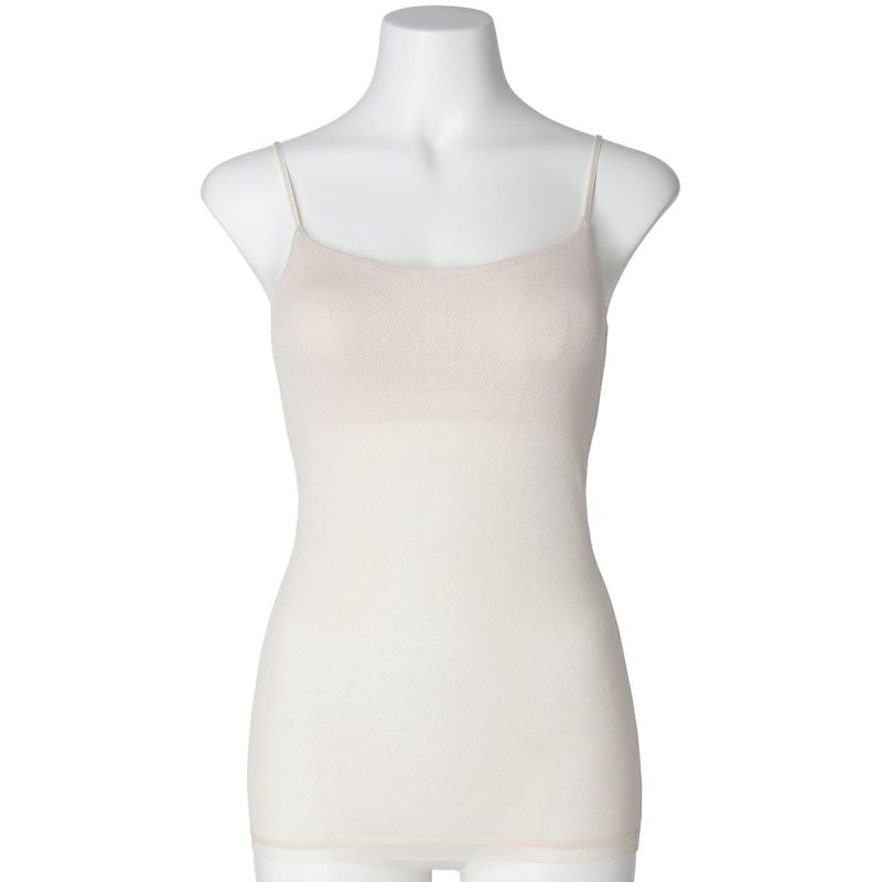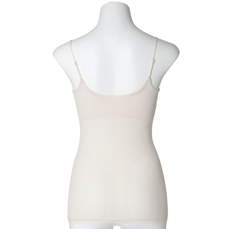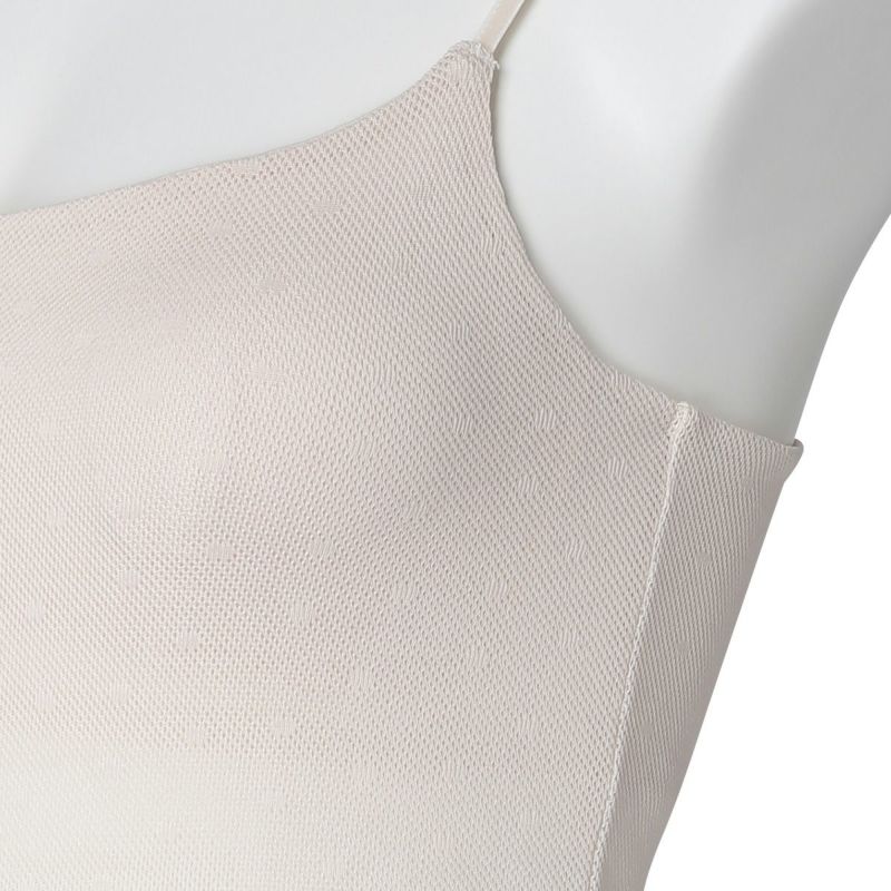カップ付キャミソールは、ブラジャー無しで1枚で着れる便利なアイテム。フロント、バックともコットン100%のメッシュ素材で快適な着心地。下着感のないUとスクエアの中間のようなきれいなネックラインで深いVのトップスなどからチラッと見えてもOK。よく伸びるアジャスター付きの細めのストラップでアウターライクな見え感。カップ裏地前後あり、カップ肌側綿天竺、カップ下、背中側は綿混パワーネットでできるだけ爽やかに着用できるよう仕上げました。