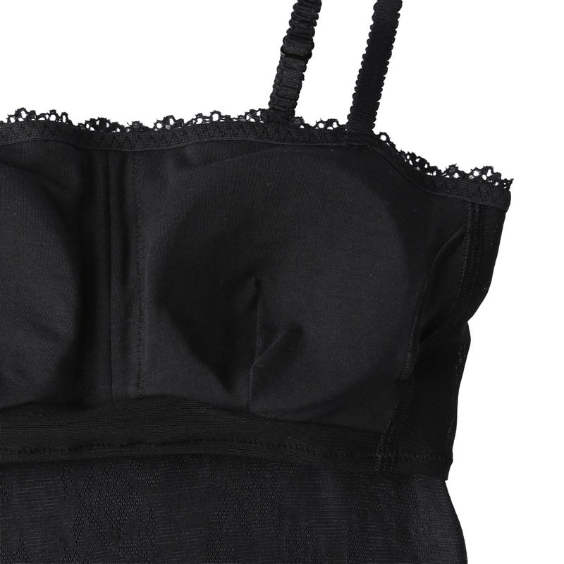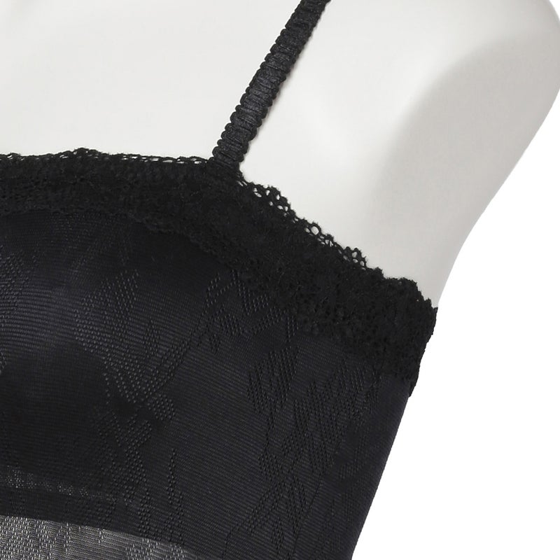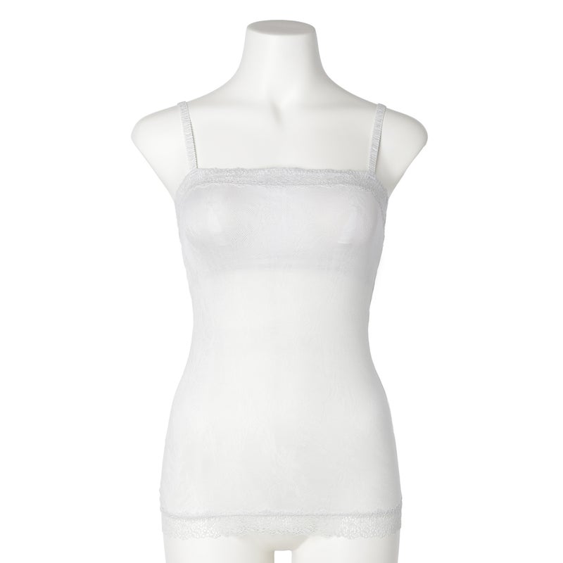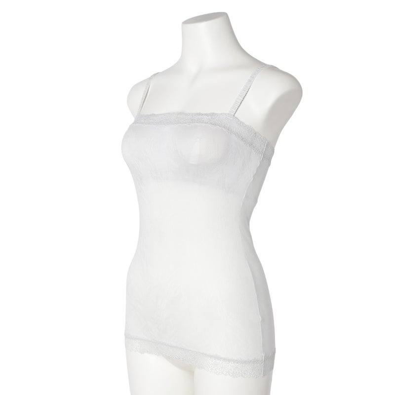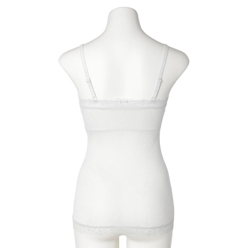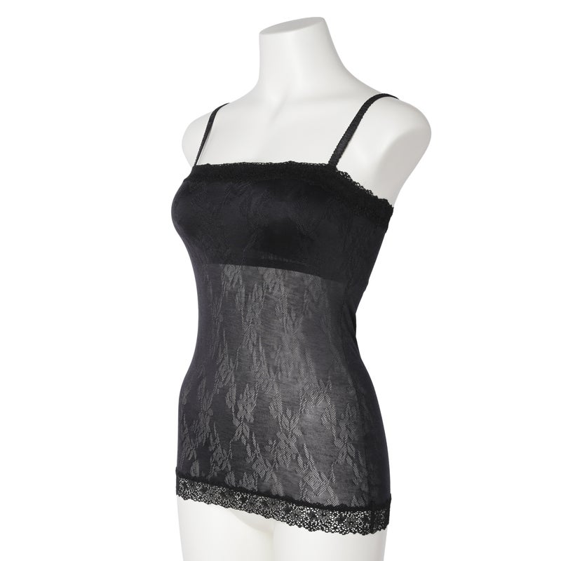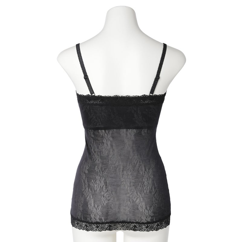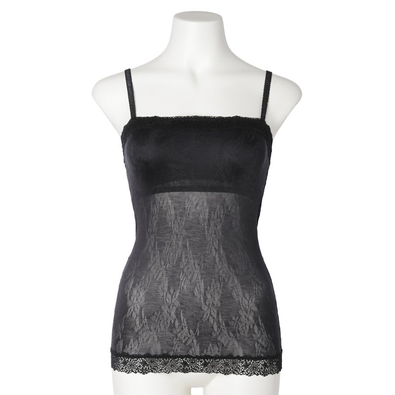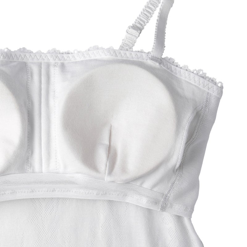 ストレートのフロントデザインのカップ付きキャミソール。深めのVネックやアウターから覗いても下着感がなくおしゃれに。カップ裏は綿天竺、カップ裏以外の裏打ちは前/後とも綿混パワーネットで肌への優しさにこだわりました。調整可能なストラップ。(ストラップは取り外せません)