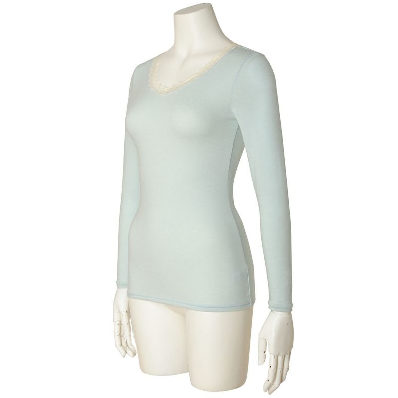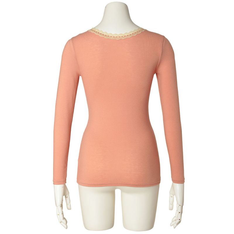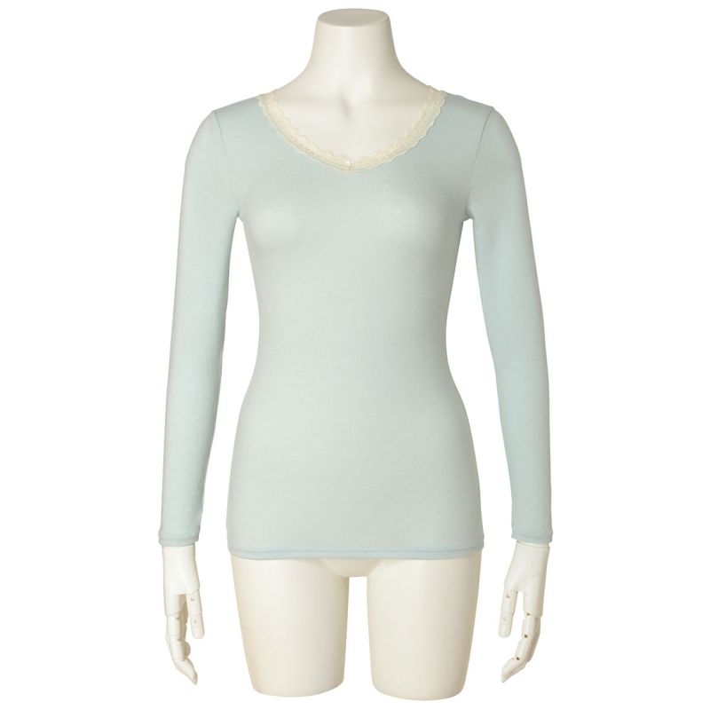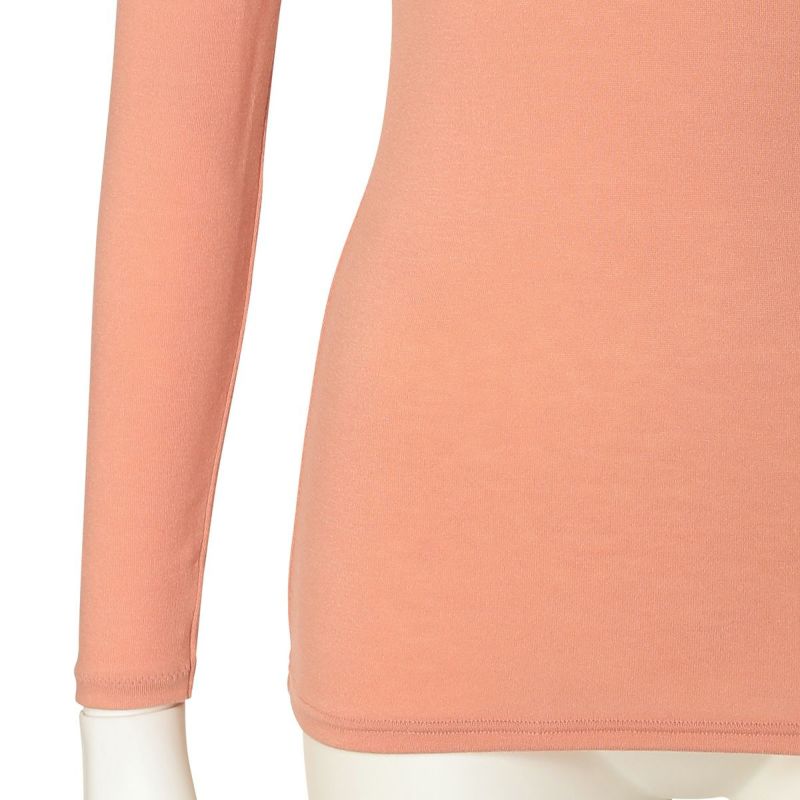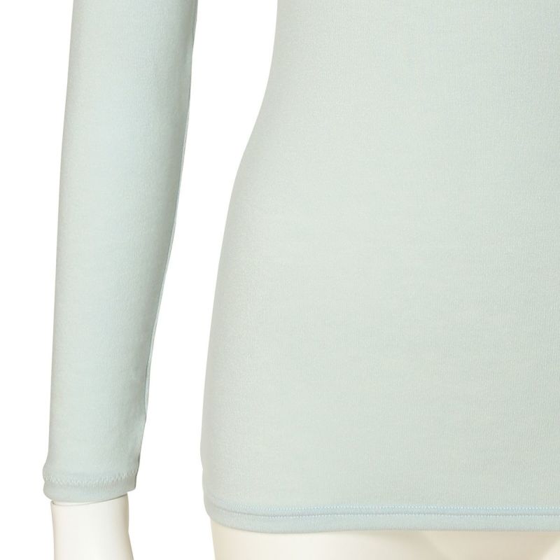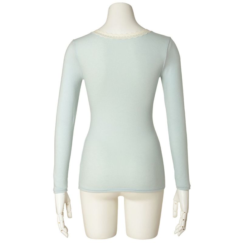 ふわふわのスウェードタッチのマイクロアクリルとマイクロレーヨンで編み上げたガーゼベア天竺素材が久々の登場。薄手ながらもふくらみがあり、柔らかくあたたか。しなやかな伸びと回復性に優れた繊維を使用し伸びがよく着ぶくれせず心地よくフィット。吸湿発熱、保温性あり。毛玉になりにくい加工も施しました。色は透けにくいピンクベージュとキッドブルーらしい爽やかなサックスの2色。