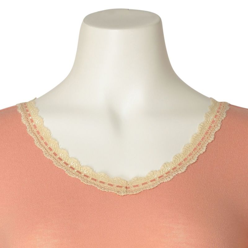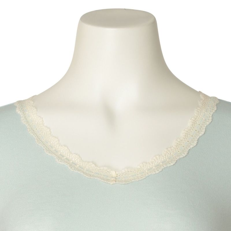 襟ぐりのリボンを通したような配色レースがポイント。前後ともほどよい開きで洋服から見えにくい。
