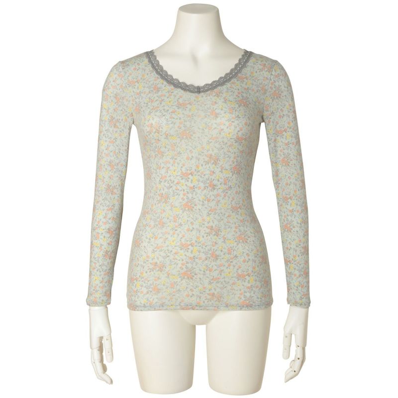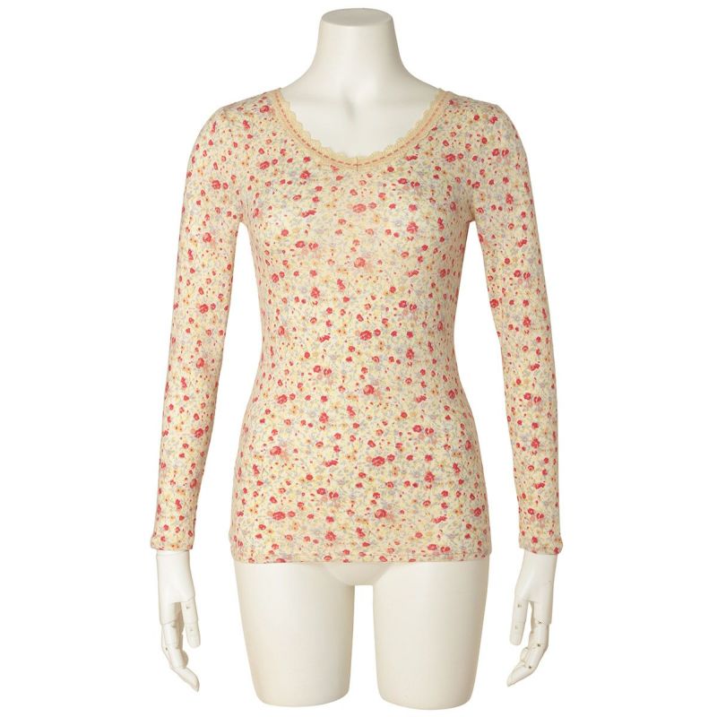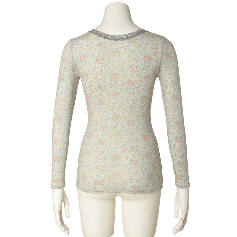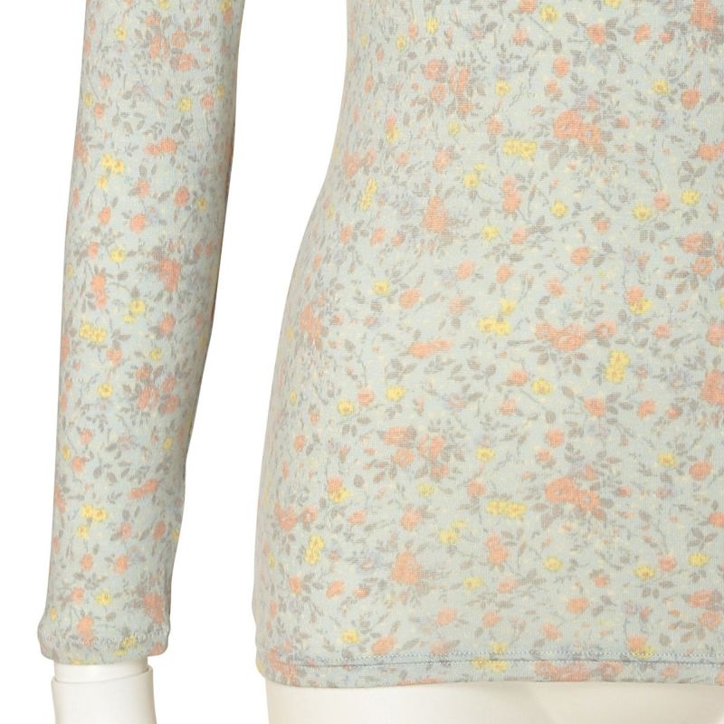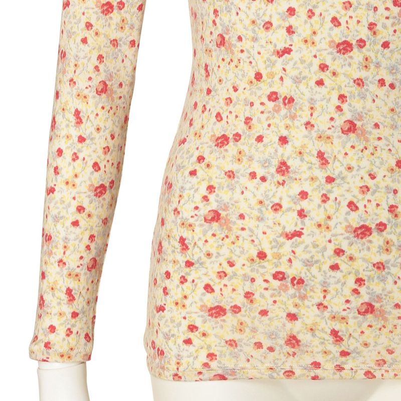優しい小花をプリントしたロングシーズン着れる薄手防寒のシリーズ。リクエストの多かったふわふわのスウェードタッチのマイクロアクリルとマイクロレーヨンで編み上げたガーゼベア天竺素材が久々の登場。薄手ながらもふくらみがあり、柔らかくあたたか。しなやかな伸びと回復性に優れた繊維を使用し伸びがよく着ぶくれせず心地よくフィット。吸湿発熱、保温性あり。毛玉になりにくい加工も施しました。