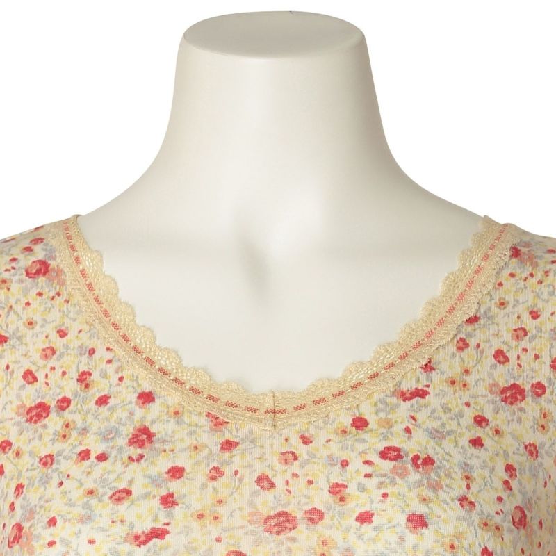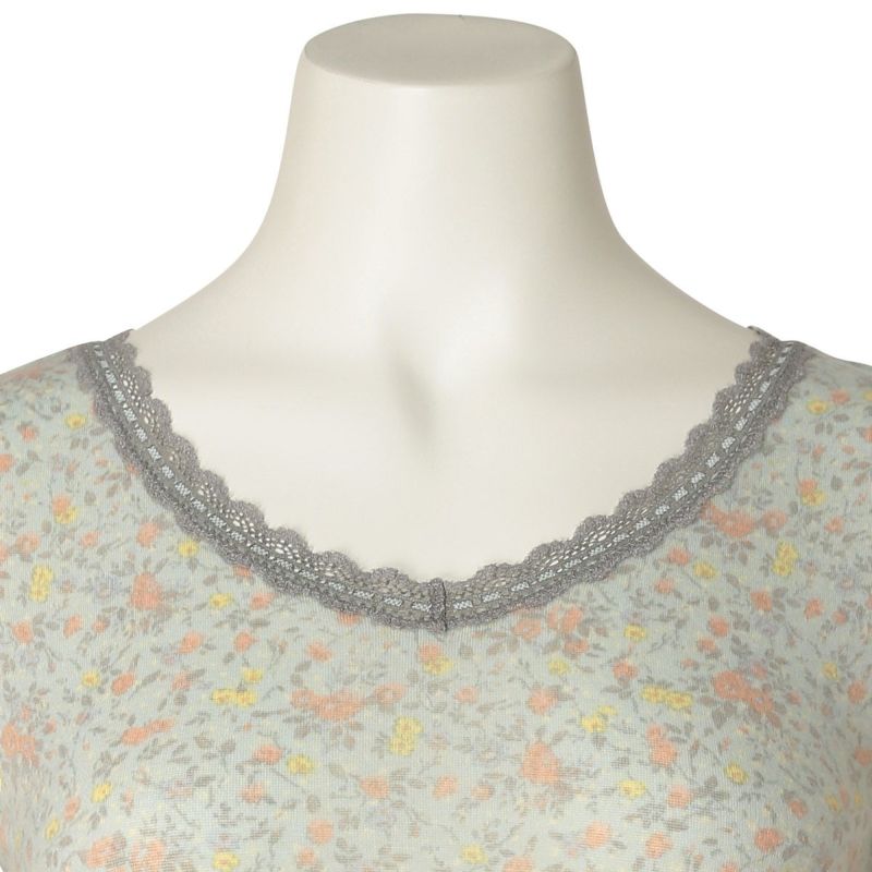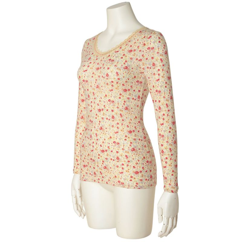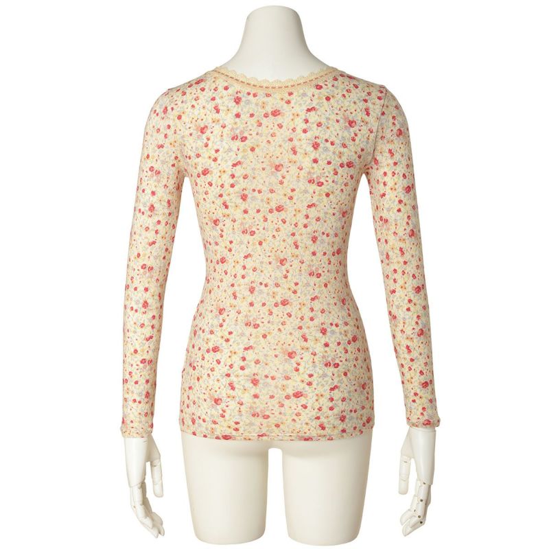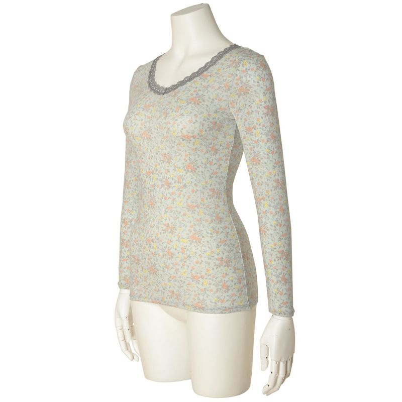 優しい小花をプリントしたロングシーズン着れる薄手防寒のシリーズ。リクエストの多かったふわふわのスウェードタッチのマイクロアクリルとマイクロレーヨンで編み上げたガーゼベア天竺素材が久々の登場。薄手ながらもふくらみがあり、柔らかくあたたか。しなやかな伸びと回復性に優れた繊維を使用し伸びがよく着ぶくれせず心地よくフィット。吸湿発熱、保温性あり。毛玉になりにくい加工も施しました。