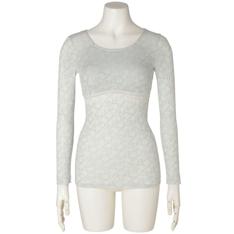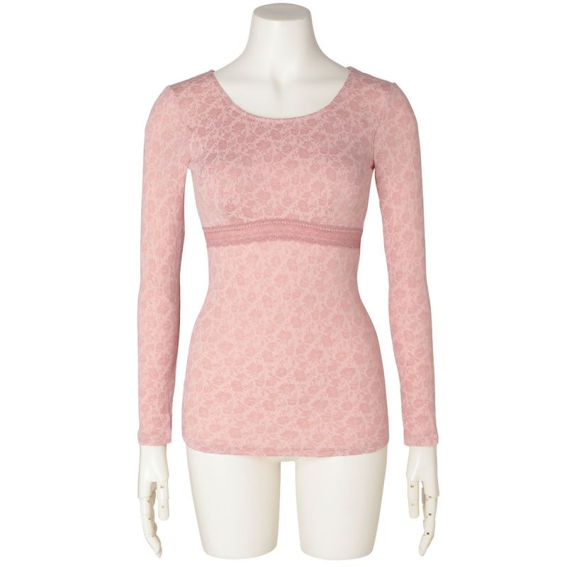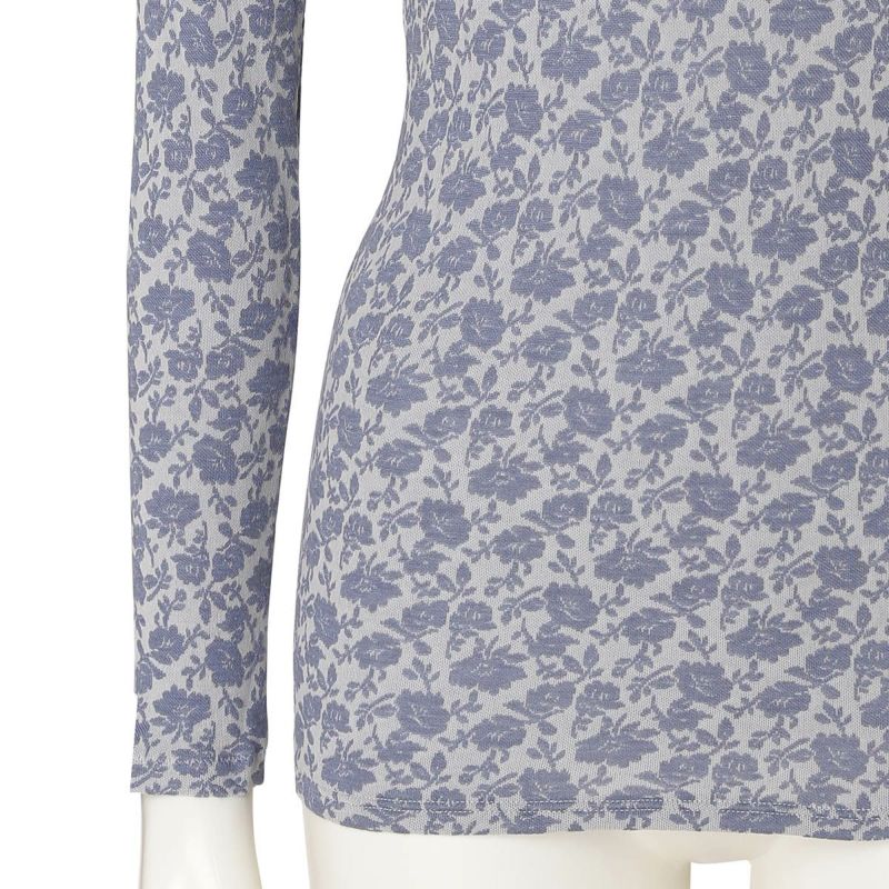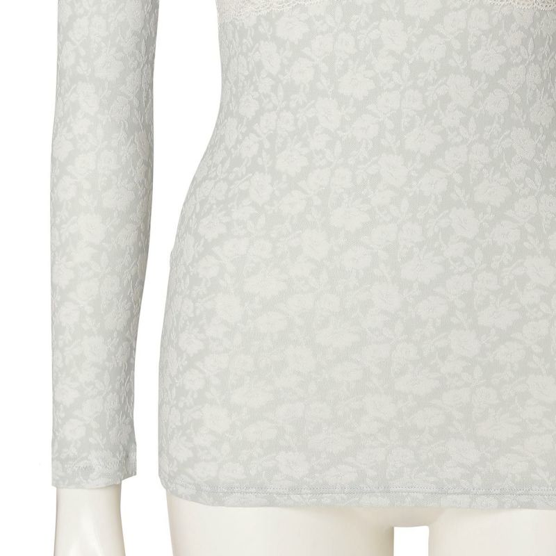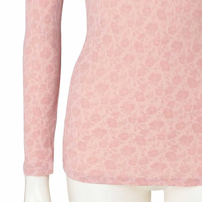 微起毛で仕上げたジャガード花柄が上品な印象の防寒インナーシリーズ。湿気を吸収して発熱し汗をかいても蒸れにくいサーモギアを使用。優しいミントカラーと、レース配色がポイントのブルー、ニュアンスのあるピンクの3色展開です。