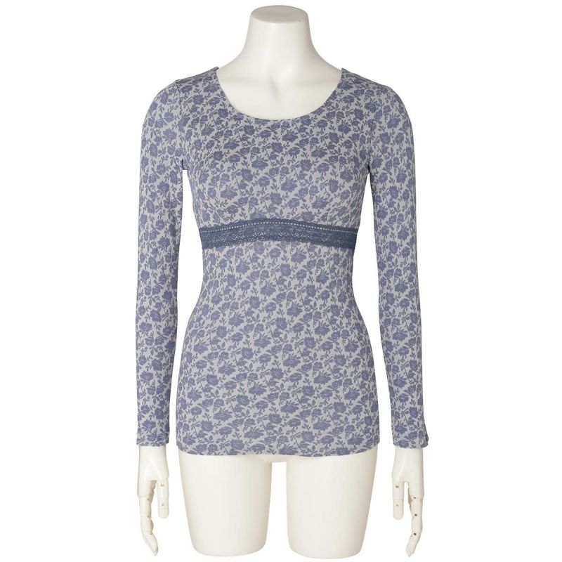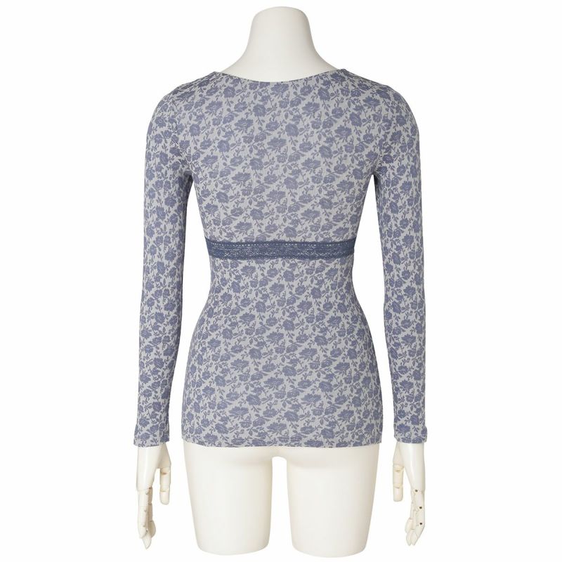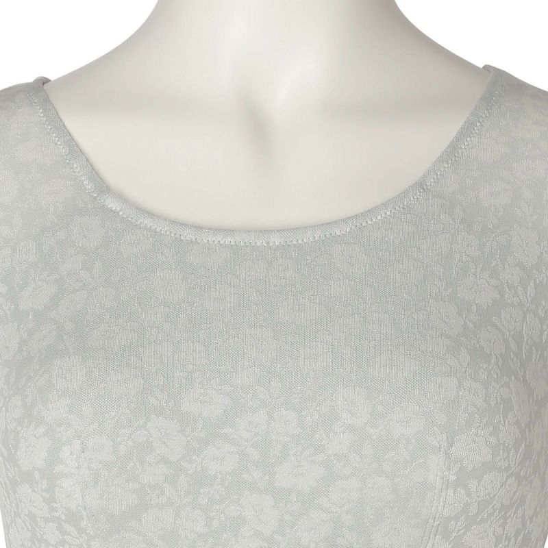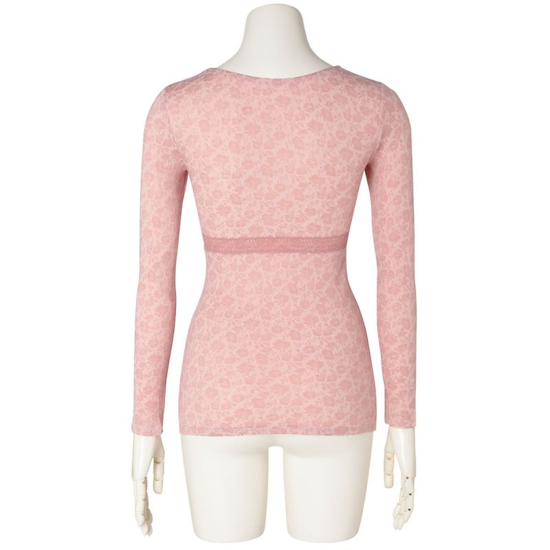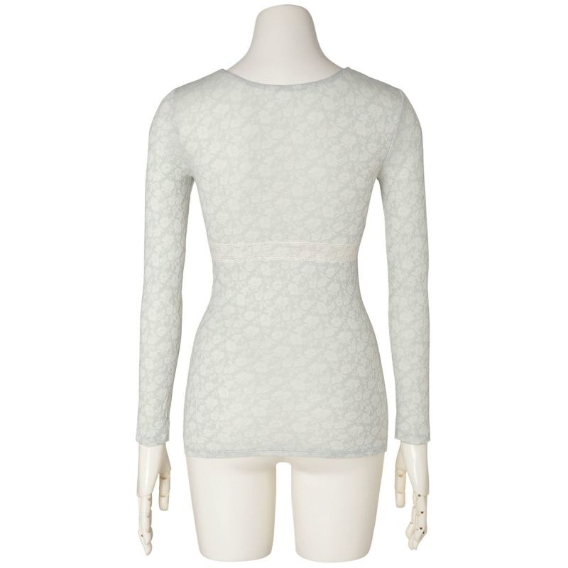 微起毛で仕上げたジャガード花柄が上品な印象の防寒インナーシリーズ。湿気を吸収して発熱し汗をかいても蒸れにくいサーモギアを使用。優しいミントカラーと、レース配色がポイントのブルー、ニュアンスのあるピンクの3色展開です。