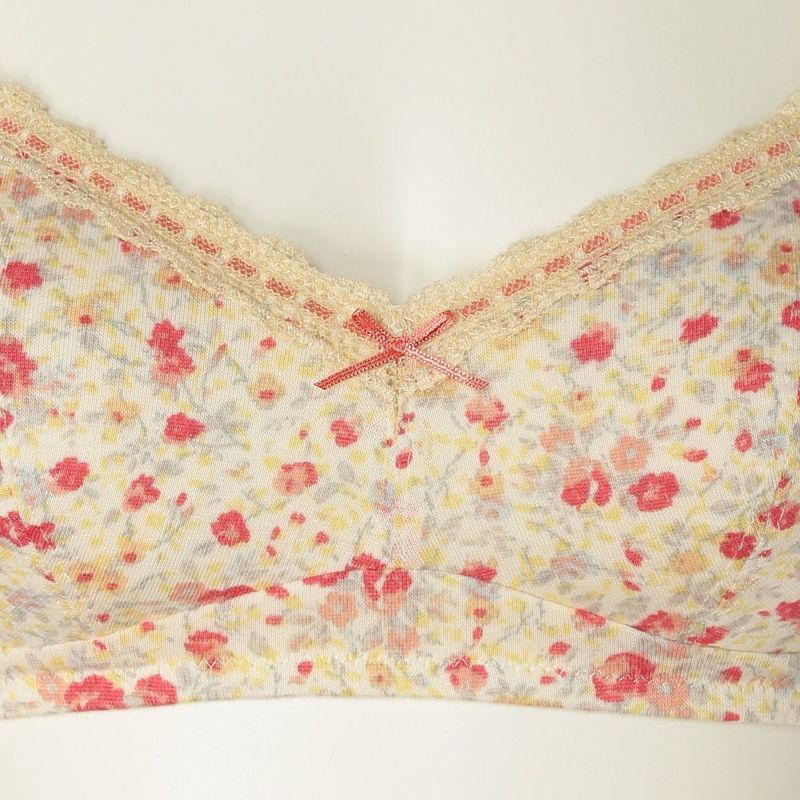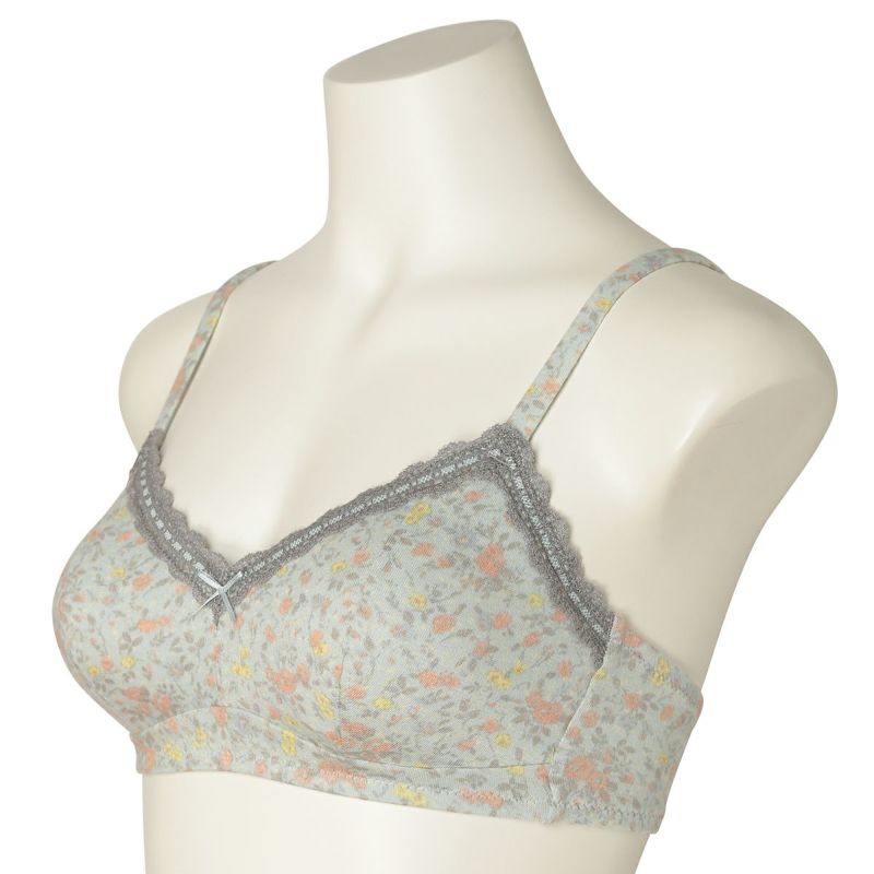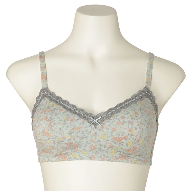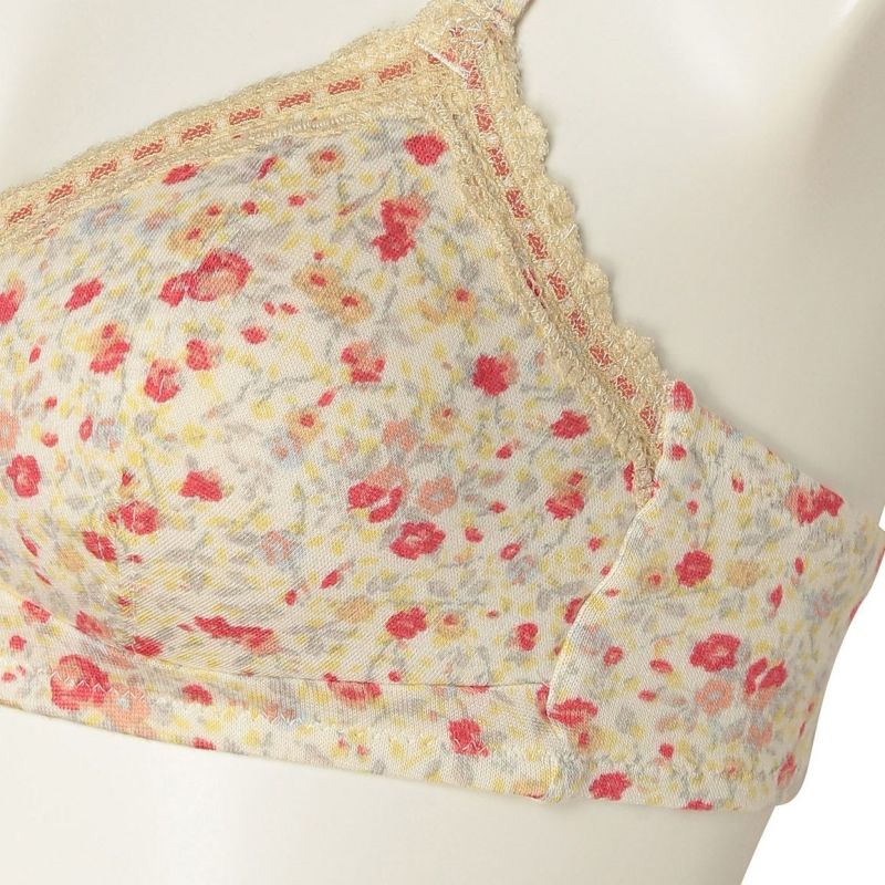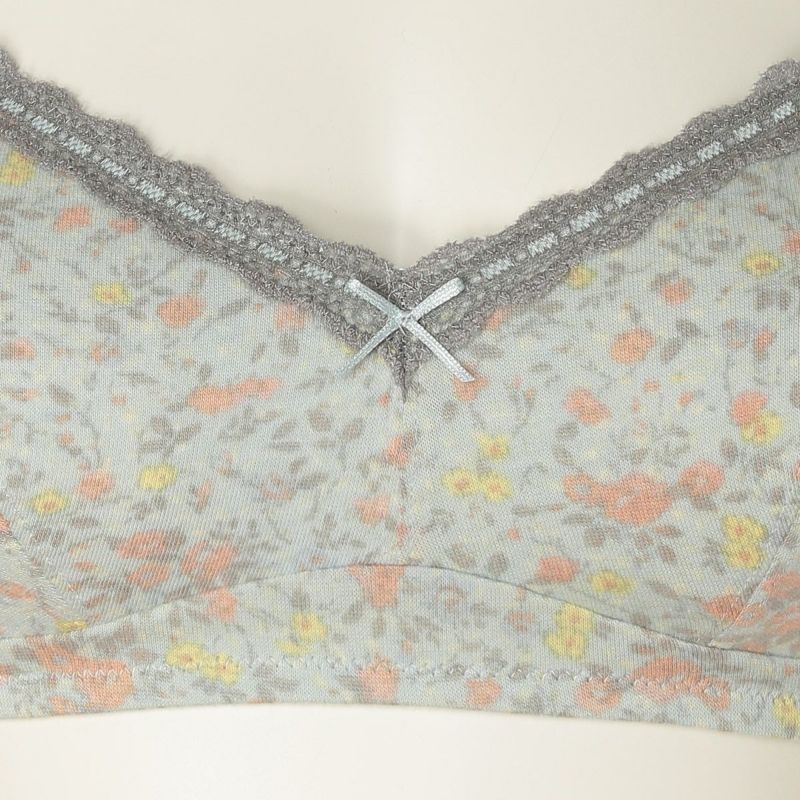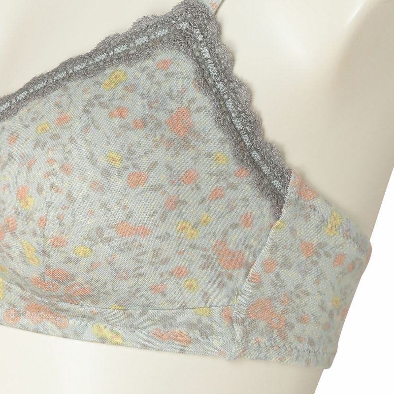 フックアイタイプのノンワイヤーブラジャーは、自然な丸みのシルエット。ハシゴレースがかわいらしさをプラス。ストラップも同柄で細部までこだわりました。カップ肌側は綿天竺、アンダーバック肌側にも綿ベア天でできるだけ肌に優しい素材で仕上げました。