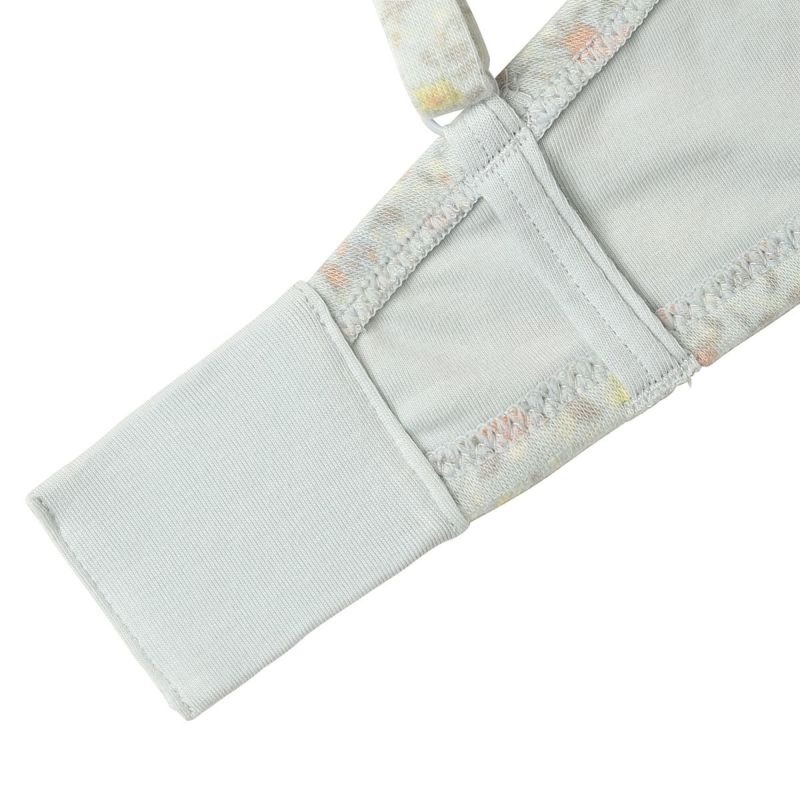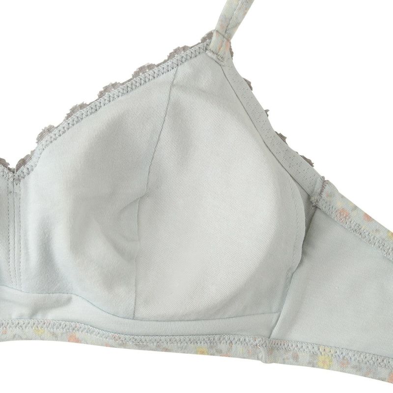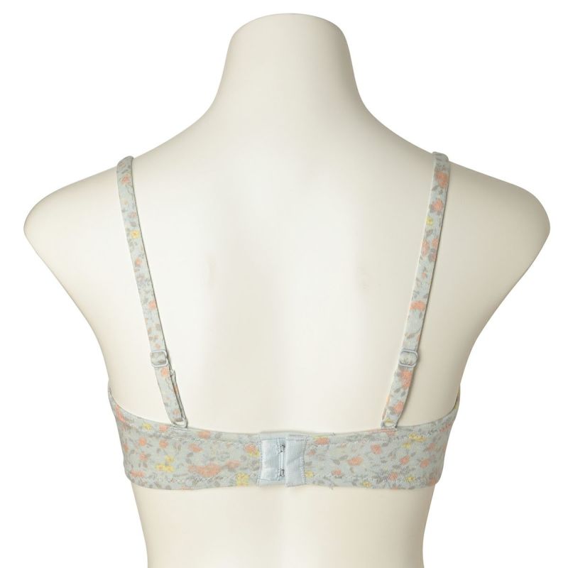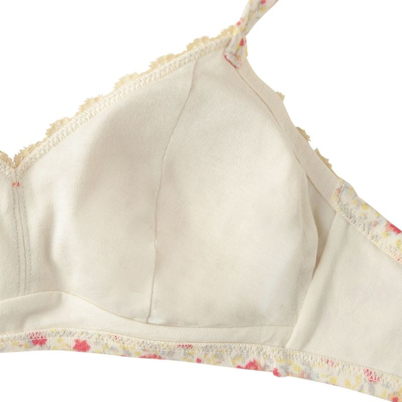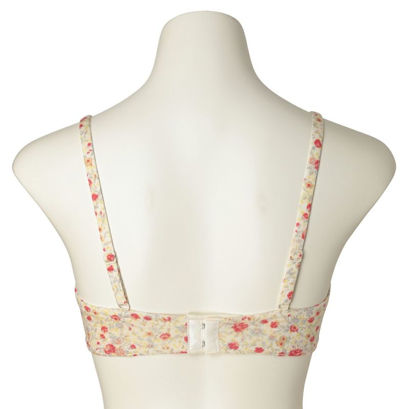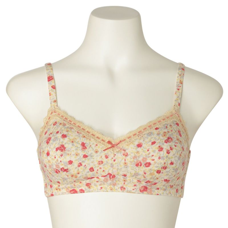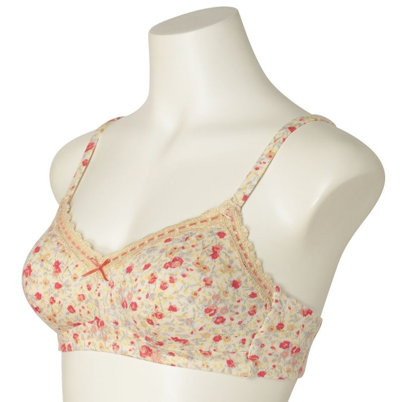 フックアイタイプのノンワイヤーブラジャーは、自然な丸みのシルエット。ハシゴレースがかわいらしさをプラス。ストラップも同柄で細部までこだわりました。カップ肌側は綿天竺、アンダーバック肌側にも綿ベア天でできるだけ肌に優しい素材で仕上げました。