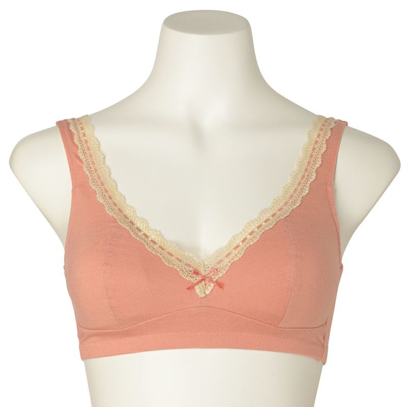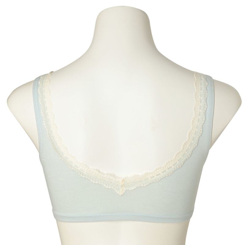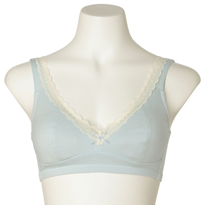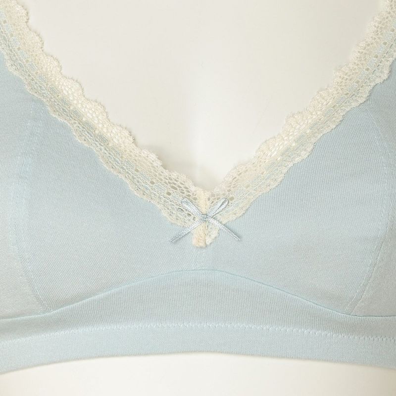ノンワイヤーブラジャーは、ホックのないかぶりタイプでリラクシーな着用感。ナチュラルなシルエットの三角パッドタイプ。フロントから背中までリボンを通したような配色レースを合わせさりげないかわいらさしさをプラスしました。