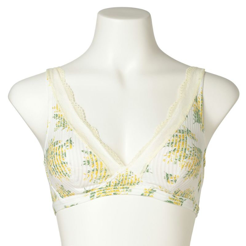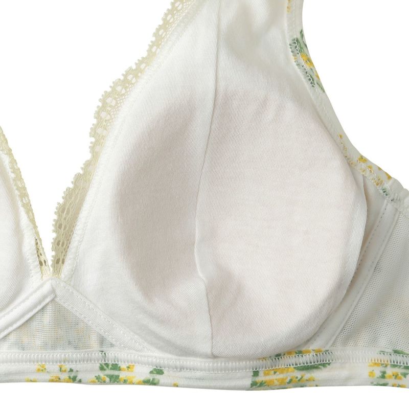 ミモザの総柄が印象的なフックアイソフトブラジャー。前中心から肩ストラップにかけて組み合わせたレースが華やかさをプラス。レースの透け感がフェミニンさを引き立たせる。深めの開きですっきりとした見え感の三角パッドタイプで、ストラップ位置が中心寄りに設計されており、スタイリッシュな見た目と快適な着け心地を両立。フックアイ部分は綿ベア天でくるんだ特許仕様で、できるだけ肌への優しさにこだわりました。