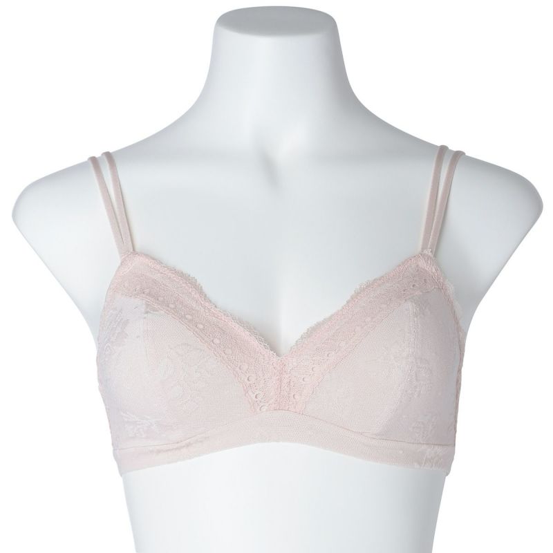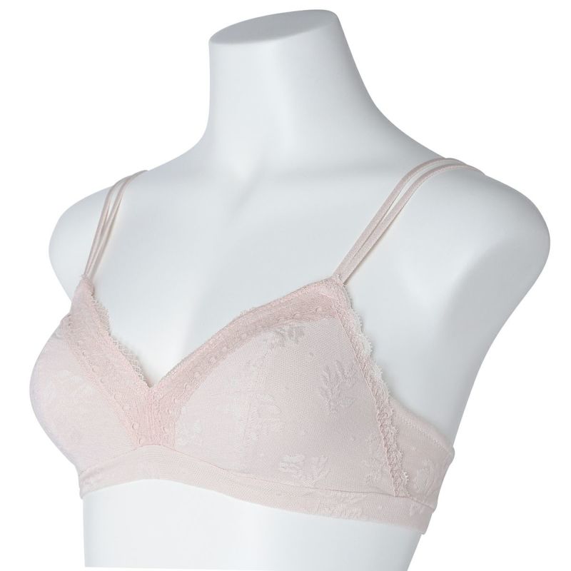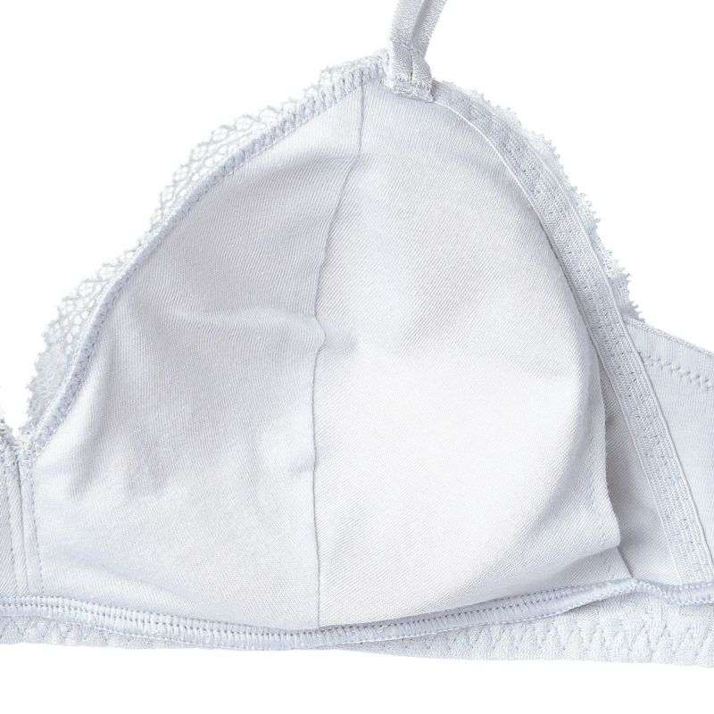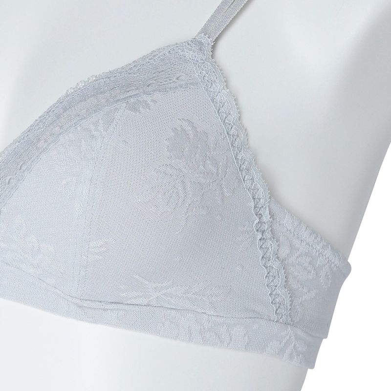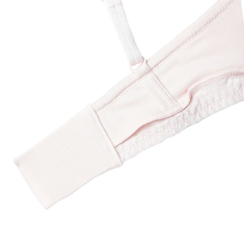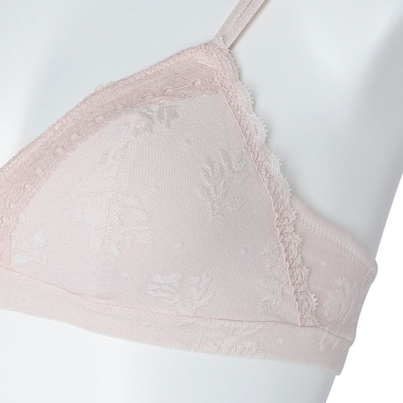 フックアイタイプのノンワイヤーブラジャーは、締め付けの少ないソフトな着用感が魅力。前中心のボーラーレースが華やか。2股タイプのストラップはスタイリッシュな見え感。フックアイ部分は綿ベア天でくるんだ特許仕様で、できるだけ肌への優しさにこだわりました。