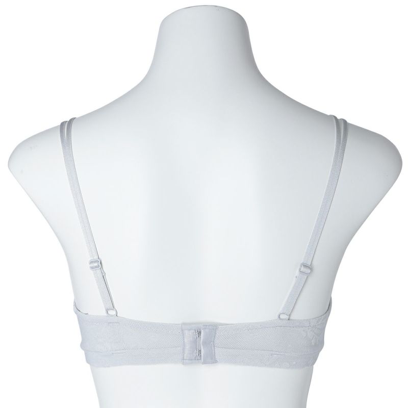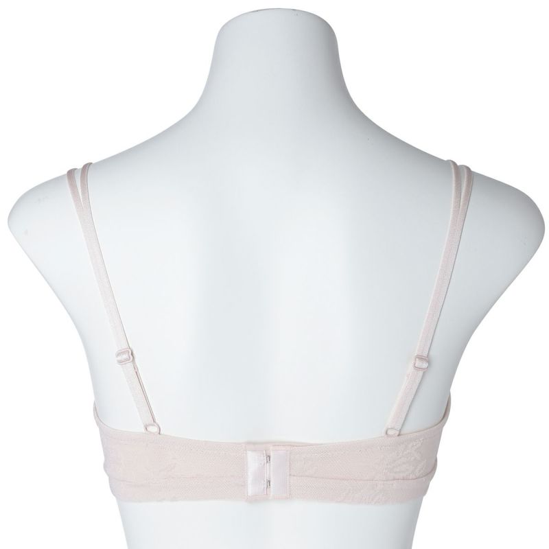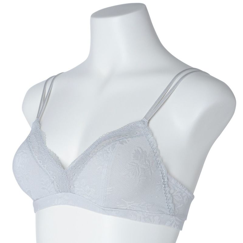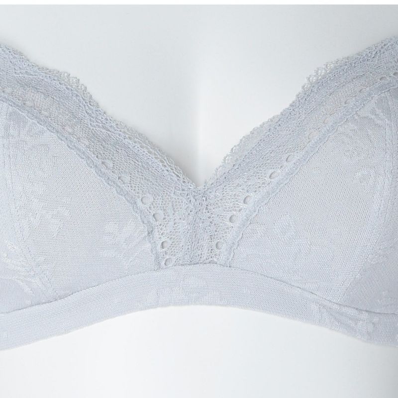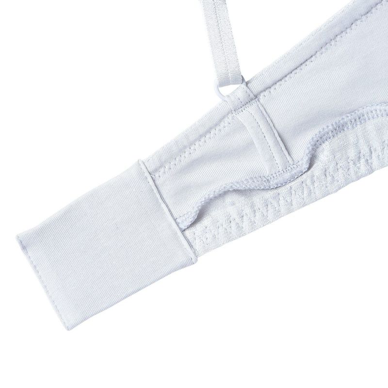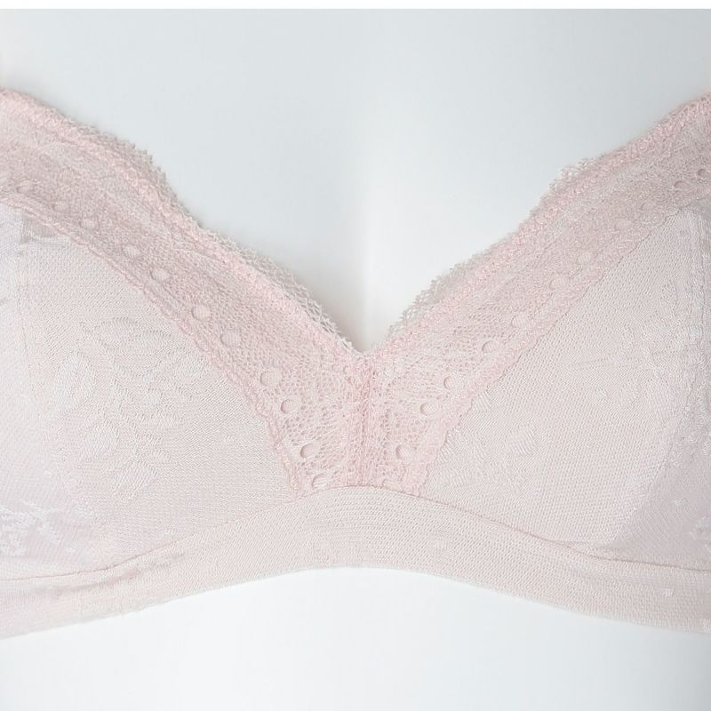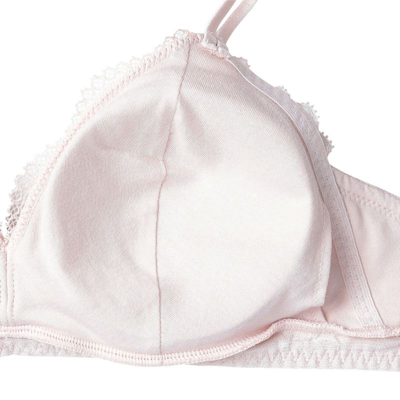 フックアイタイプのノンワイヤーブラジャーは、締め付けの少ないソフトな着用感が魅力。前中心のボーラーレースが華やか。2股タイプのストラップはスタイリッシュな見え感。フックアイ部分は綿ベア天でくるんだ特許仕様で、できるだけ肌への優しさにこだわりました。