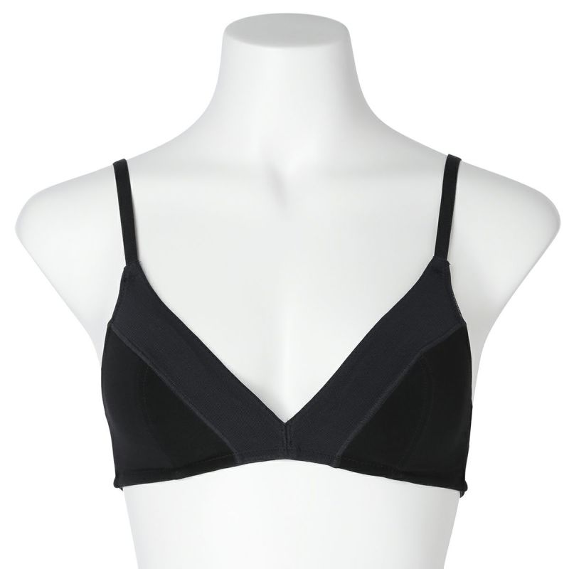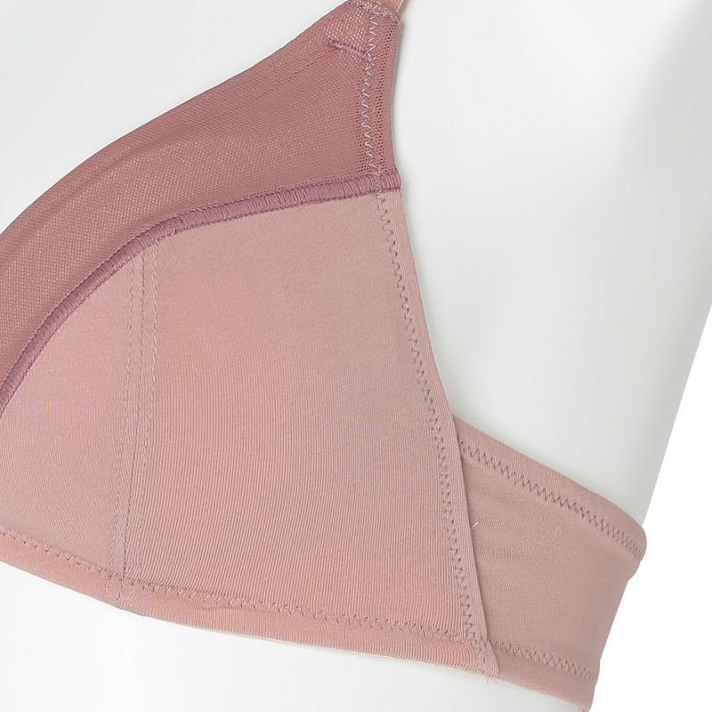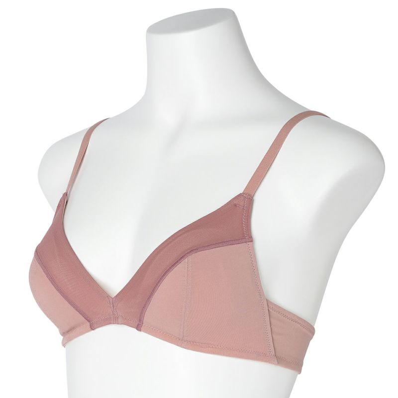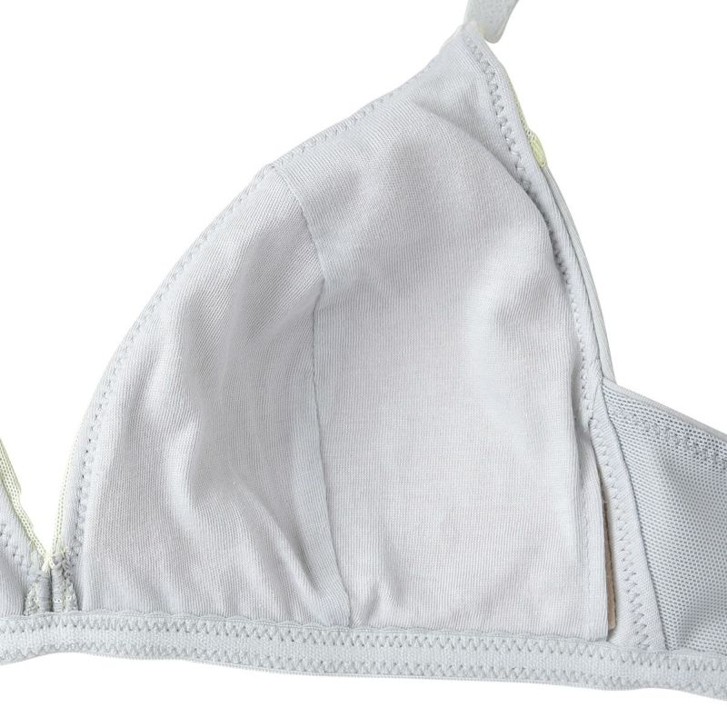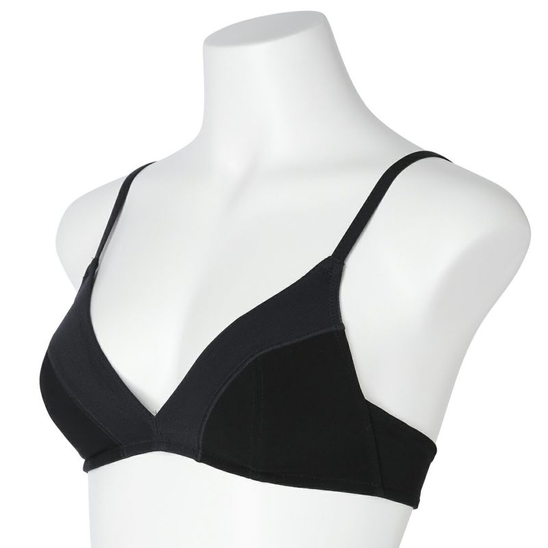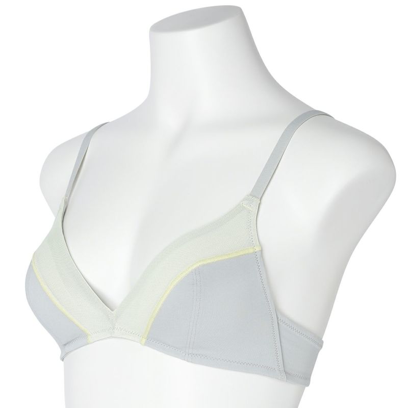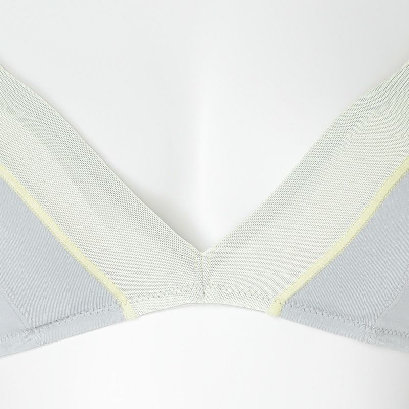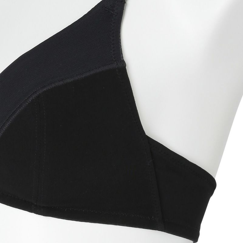 フックアイタイプのノンワイヤーブラジャーは、締め付けの少ないソフトな着用感が魅力。深めの開きですっきりとした見え感の三角パッドタイプ。上カップに重ねたパワーネットがアクセント。フックアイ部分は綿ベア天でくるんだ特許仕様で、できるだけ肌への優しさにこだわりました。シンプルなスタイリッシュさが魅力です。