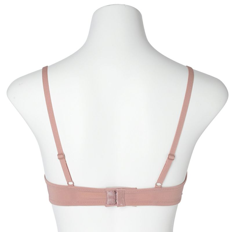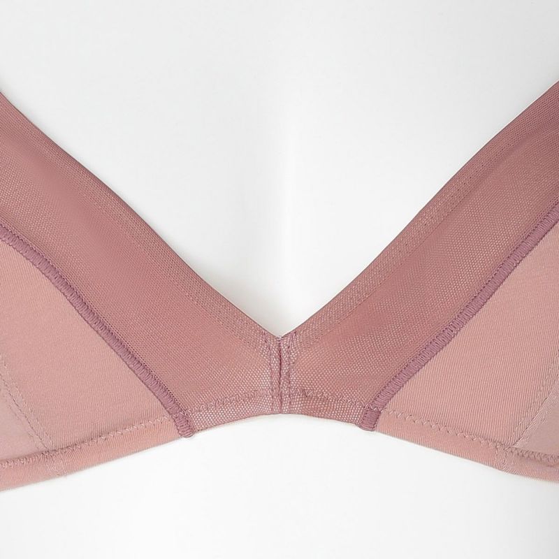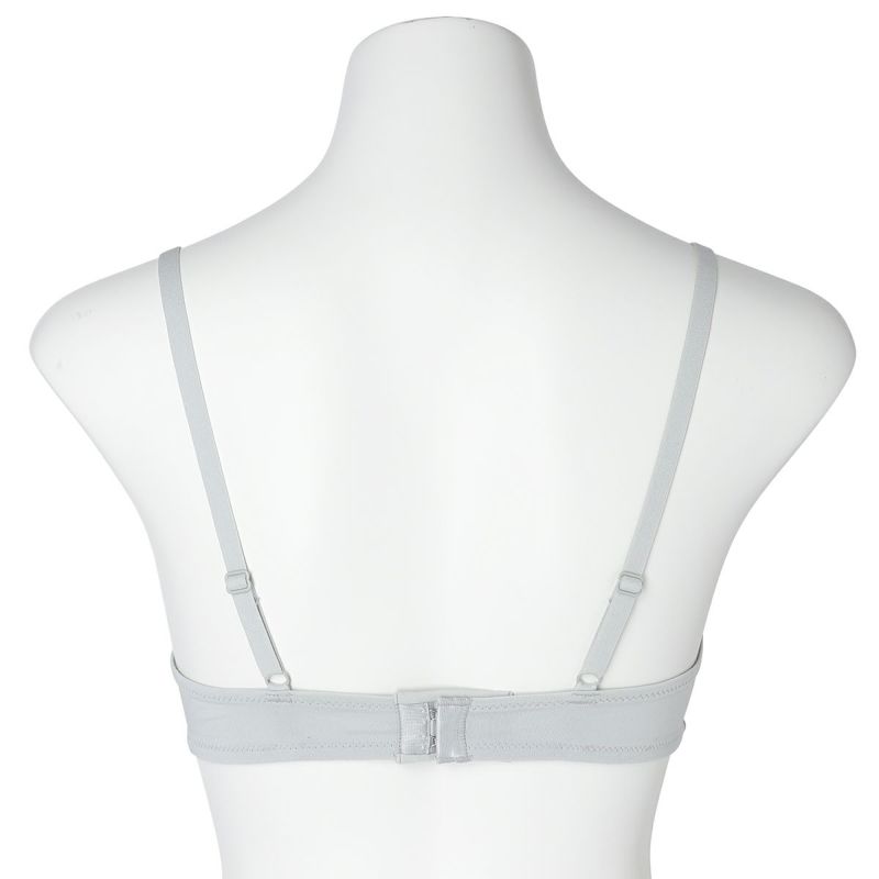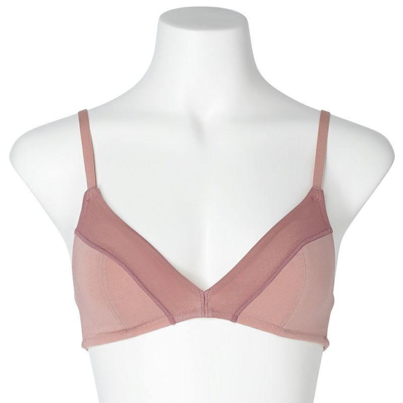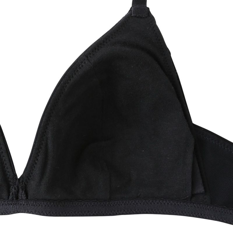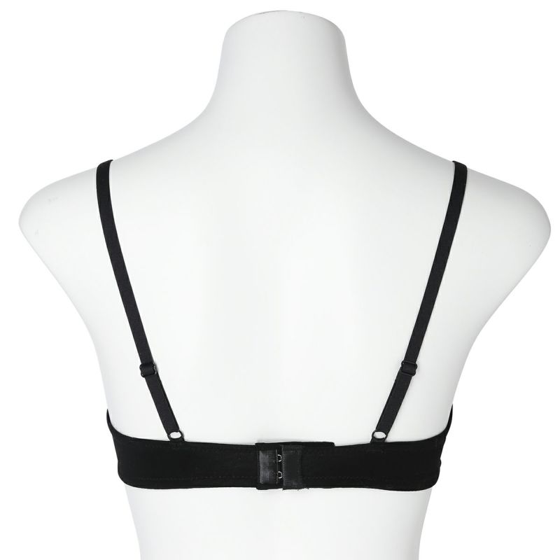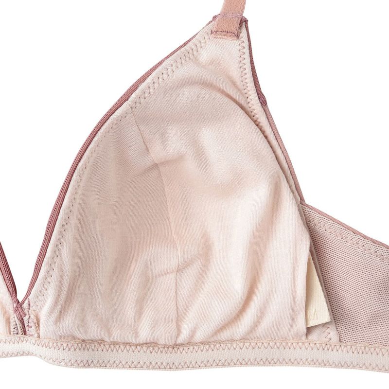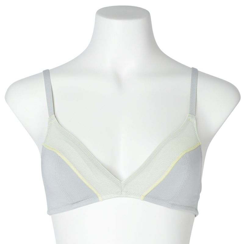 フックアイタイプのノンワイヤーブラジャーは、締め付けの少ないソフトな着用感が魅力。深めの開きですっきりとした見え感の三角パッドタイプ。上カップに重ねたパワーネットがアクセント。フックアイ部分は綿ベア天でくるんだ特許仕様で、できるだけ肌への優しさにこだわりました。シンプルなスタイリッシュさが魅力です。
