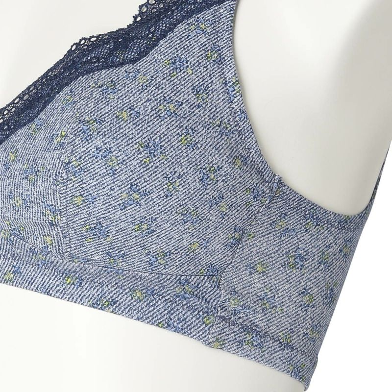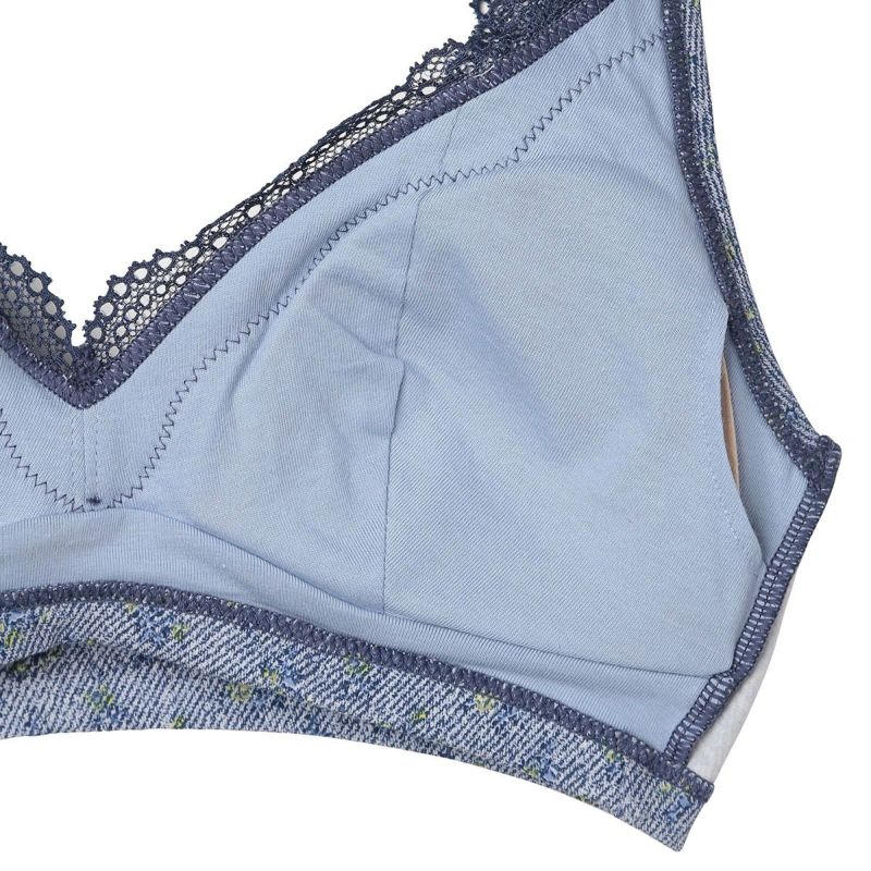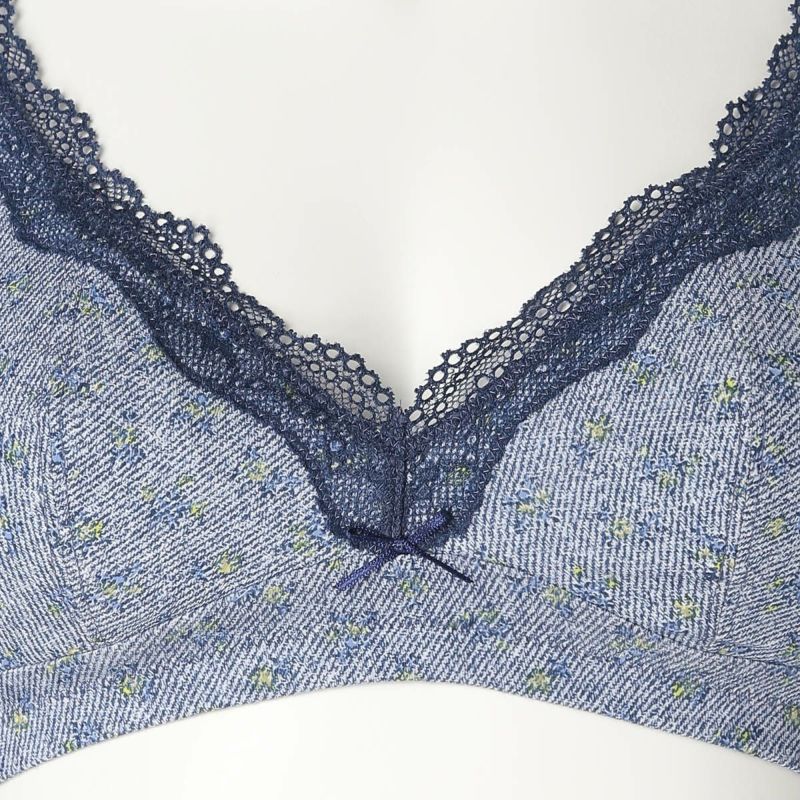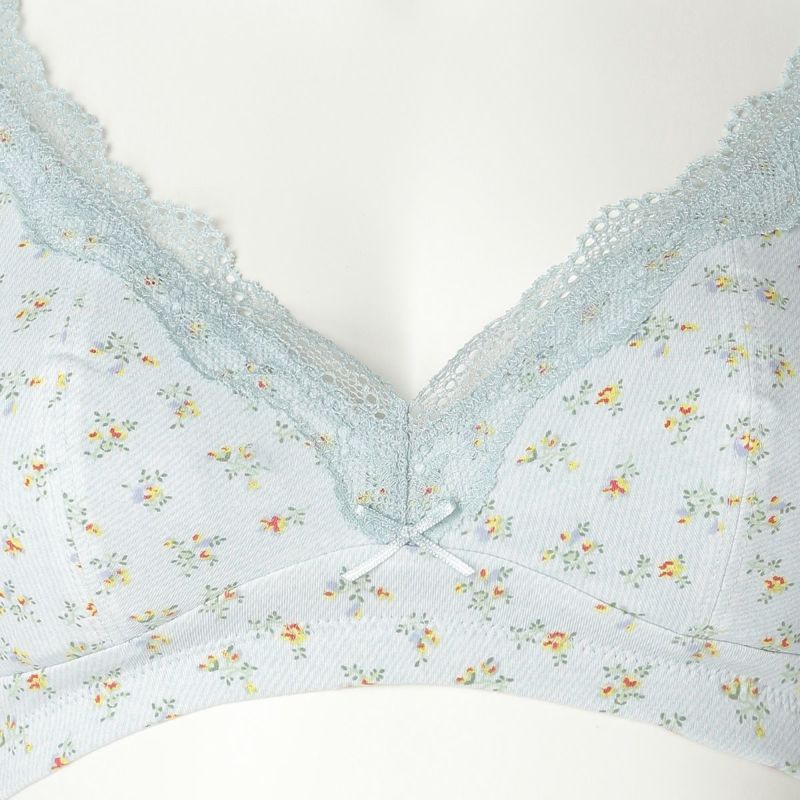 デニム柄に小花柄を重ねてプリントした、かわいらしさとカジュアル感が新鮮な魅力のシリーズ。肌触り抜群で伸びの良いスーピマ混綿ベア天を使用。