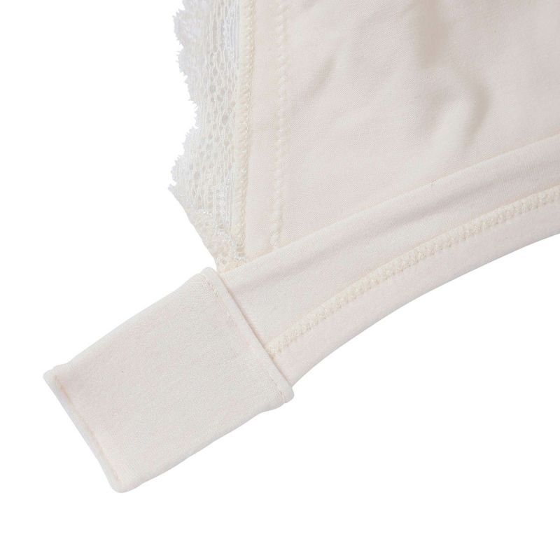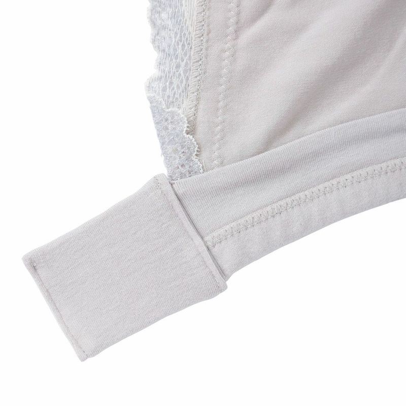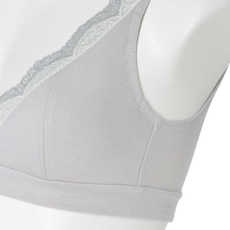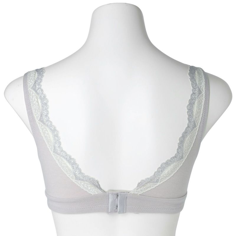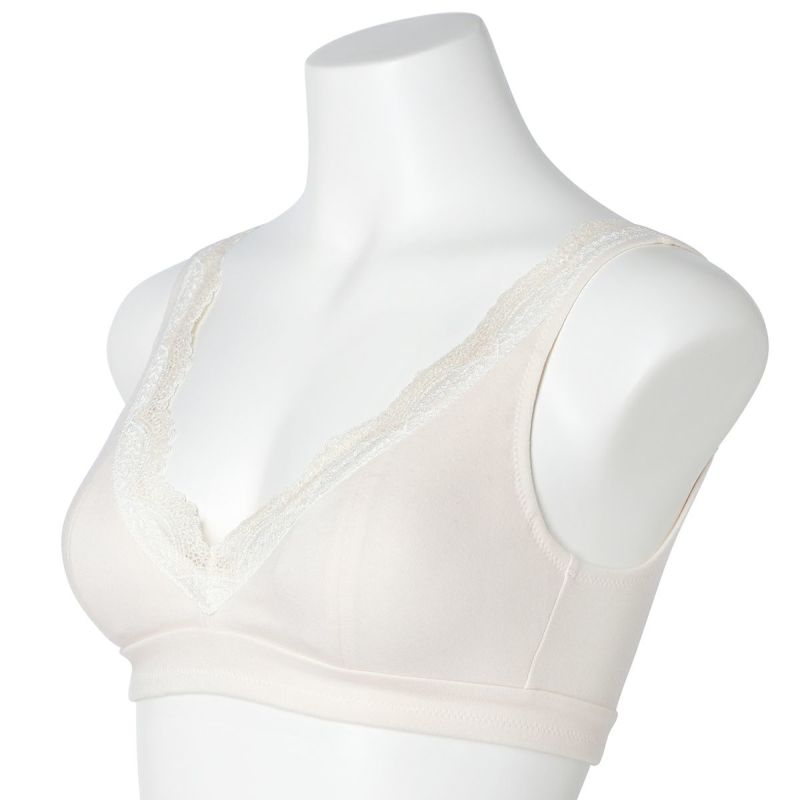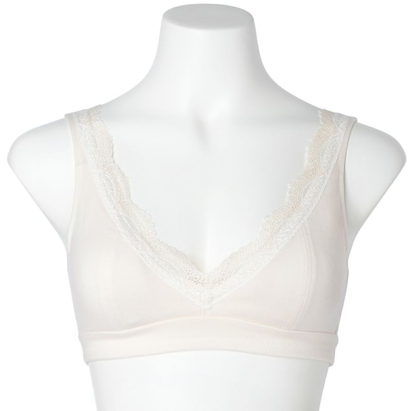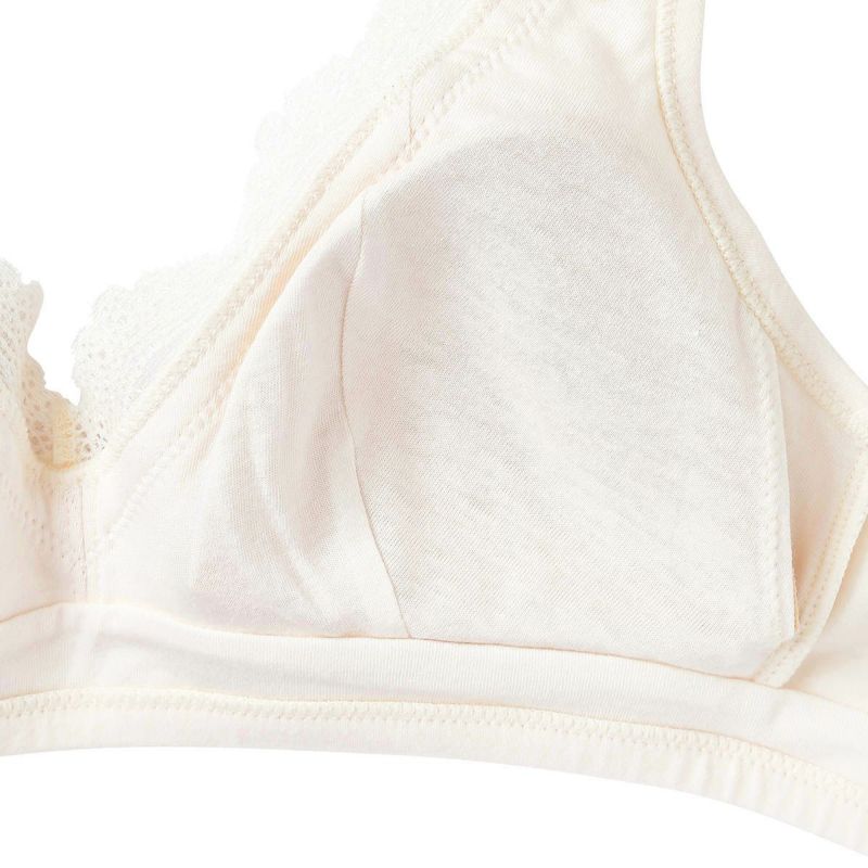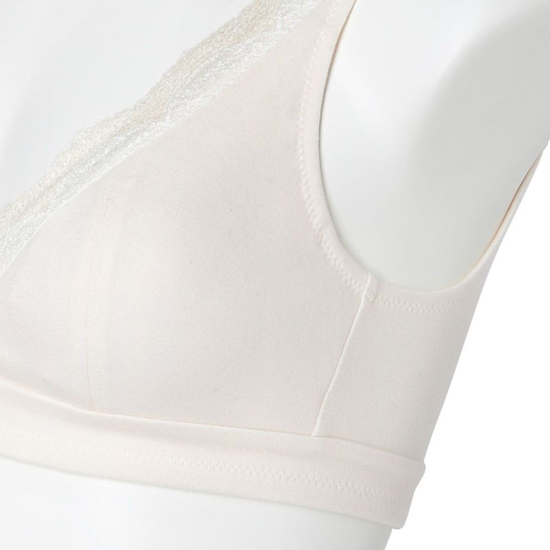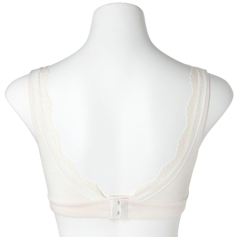 Vの空きがエレガントなフックアイタイプのノンワイヤーブラジャー。フロントから背中まで続くレースが華やか。カップ肌側は綿天竺、アンダーバック裏打ちは綿ベア天、フックアイの肌に当たる部分は綿ベア天でくるんだ特許仕様でできるだけ肌への優しさにこだわりました。