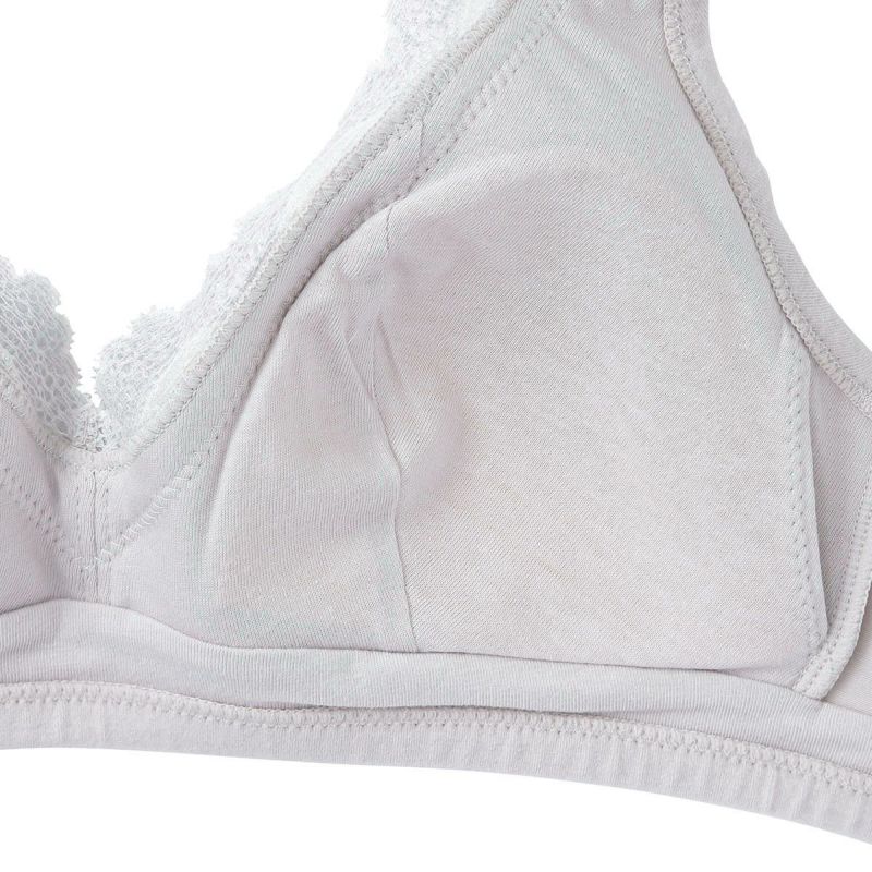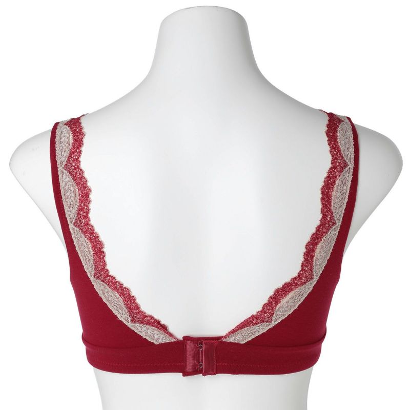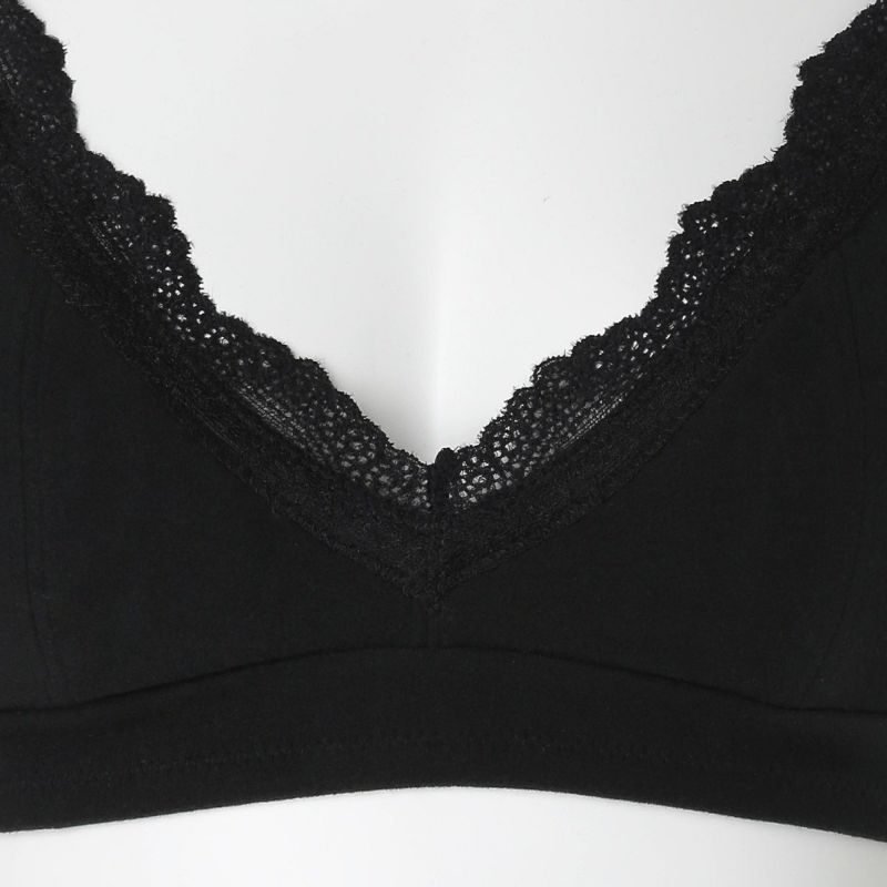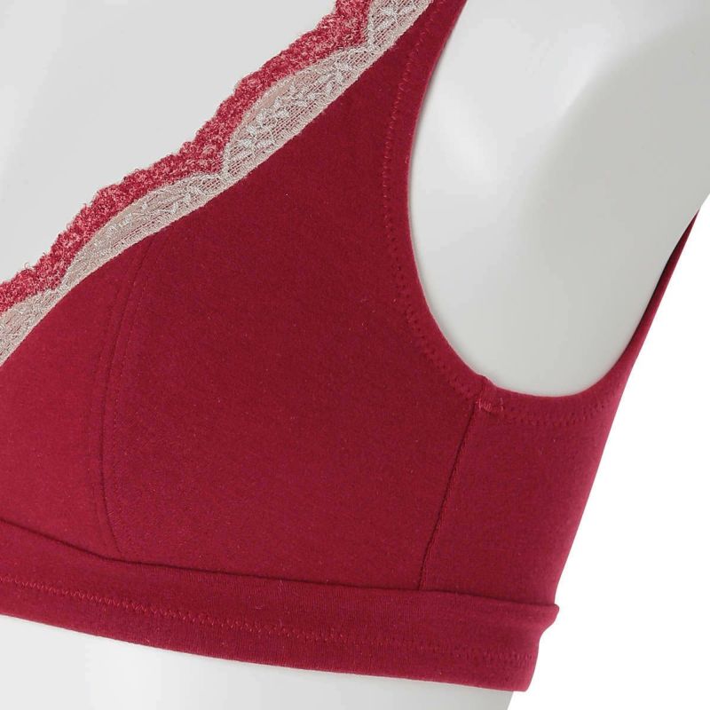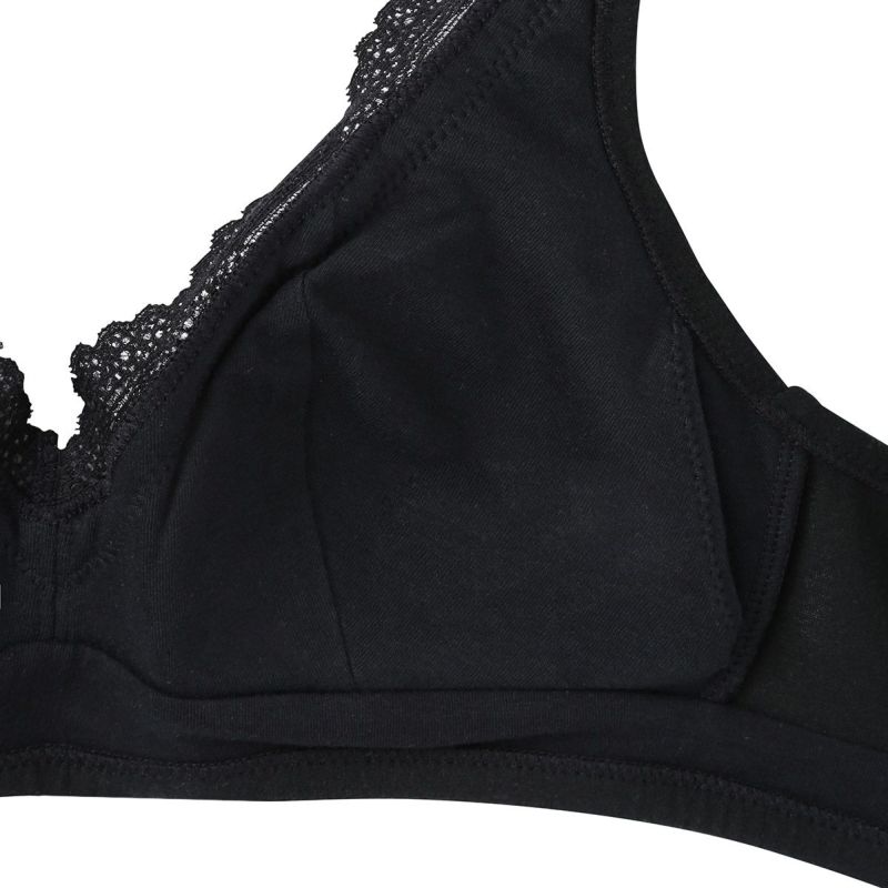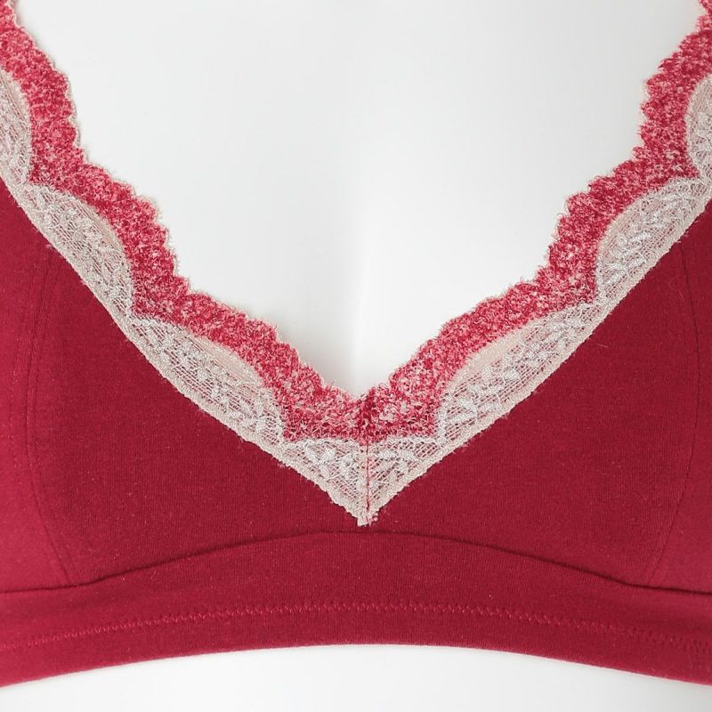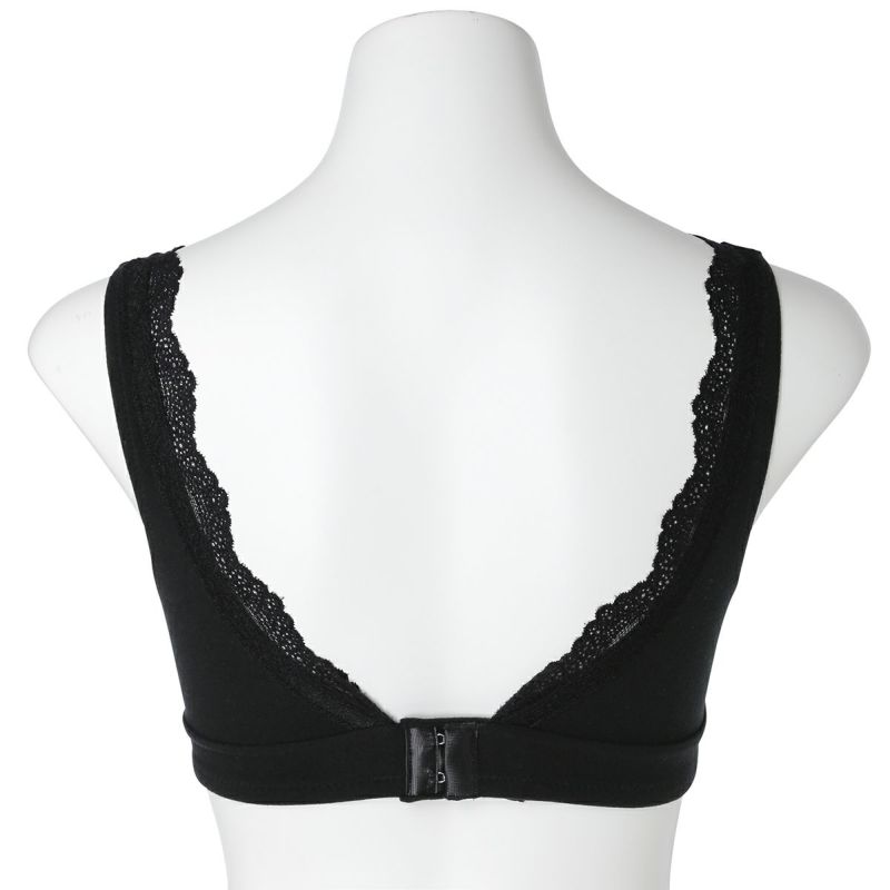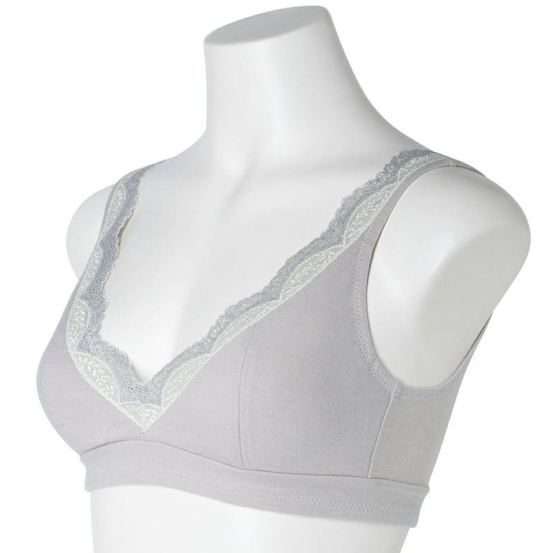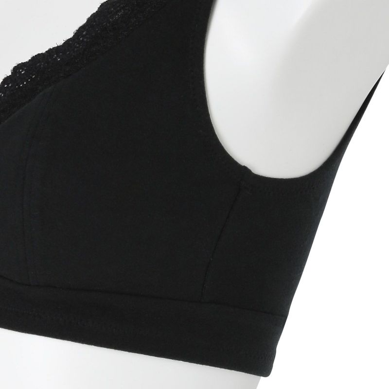 Vの空きがエレガントなフックアイタイプのノンワイヤーブラジャー。フロントから背中まで続くレースが華やか。カップ肌側は綿天竺、アンダーバック裏打ちは綿ベア天、フックアイの肌に当たる部分は綿ベア天でくるんだ特許仕様でできるだけ肌への優しさにこだわりました。