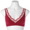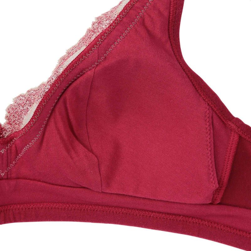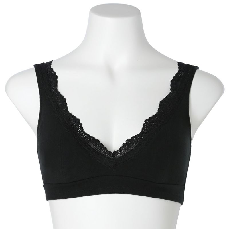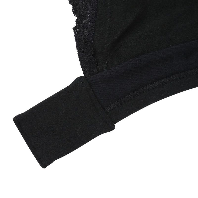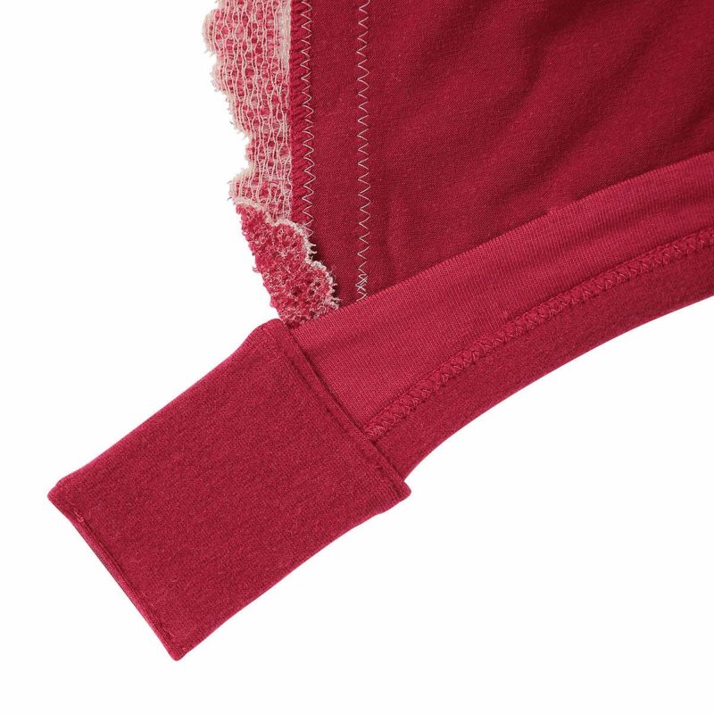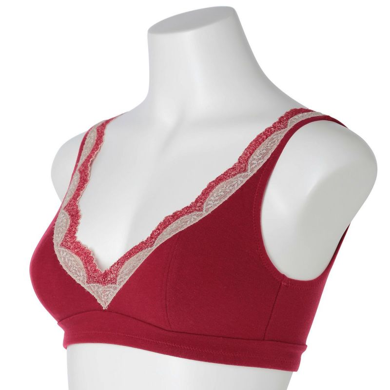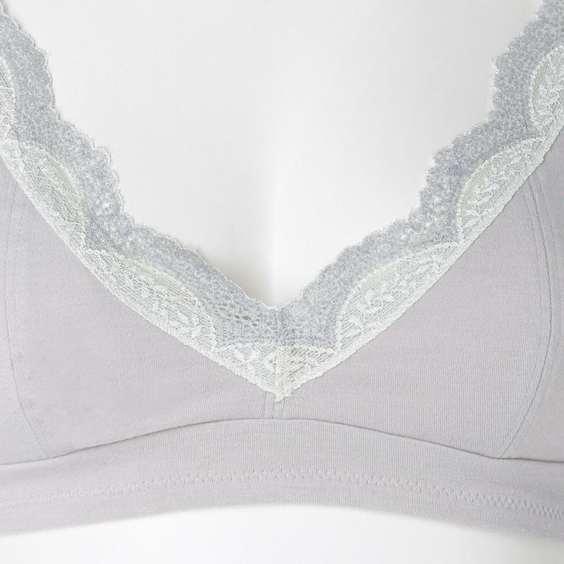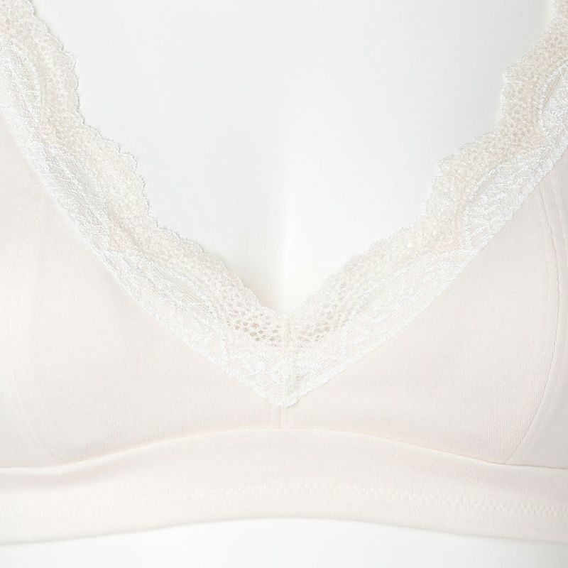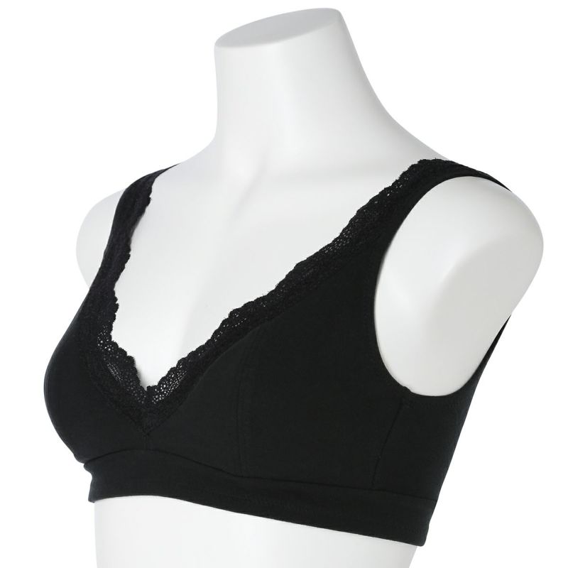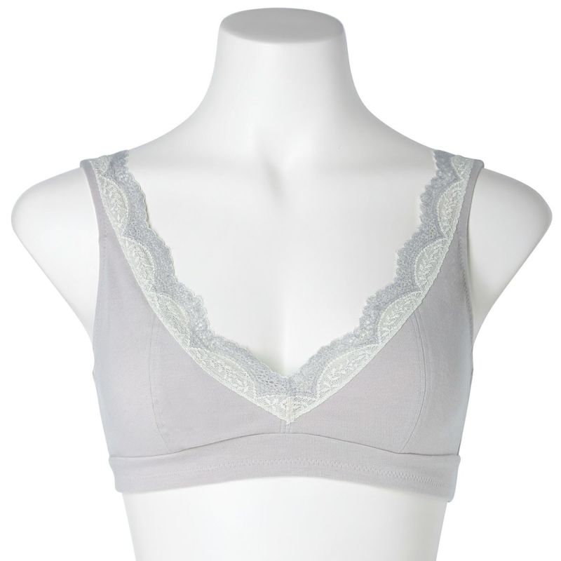 Vの空きがエレガントなフックアイタイプのノンワイヤーブラジャー。フロントから背中まで続くレースが華やか。カップ肌側は綿天竺、アンダーバック裏打ちは綿ベア天、フックアイの肌に当たる部分は綿ベア天でくるんだ特許仕様でできるだけ肌への優しさにこだわりました。