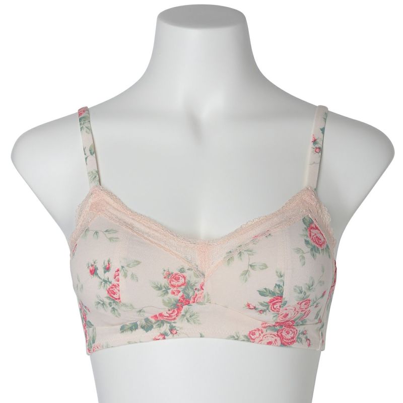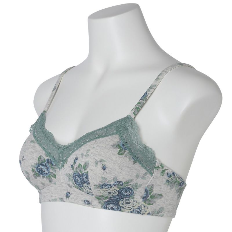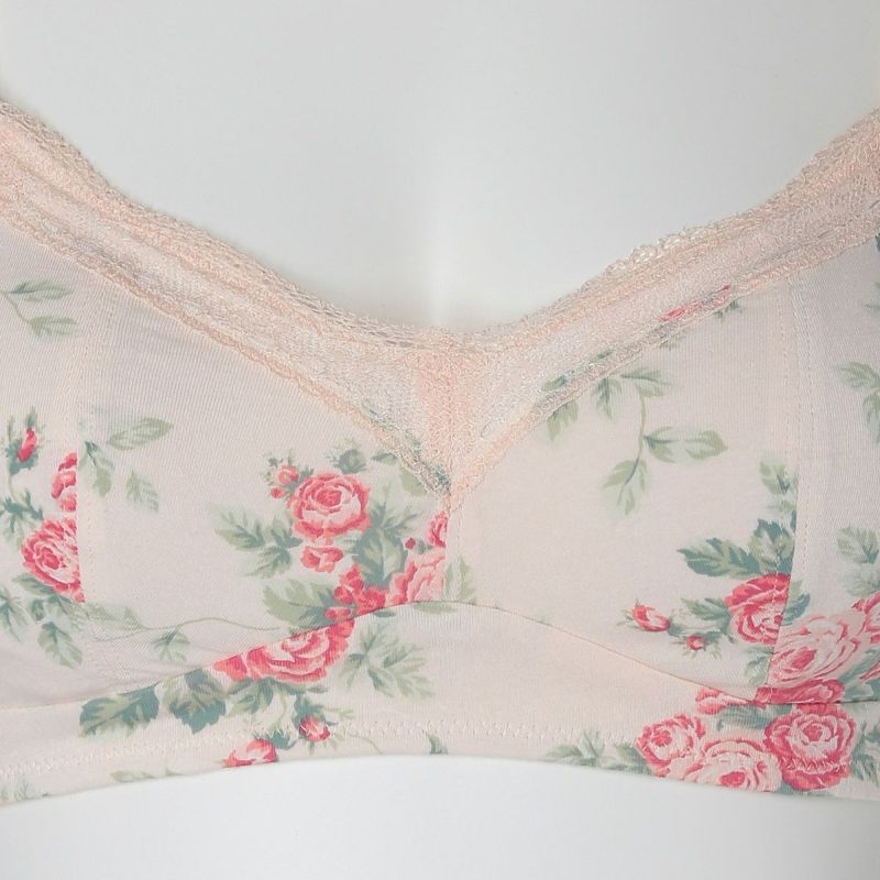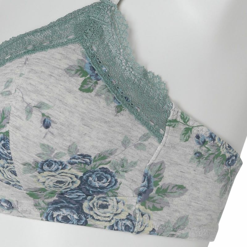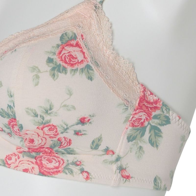 後ろホックタイプのノンワイヤーブラジャー。ストラップやアンダーバックまで総柄で華やか。カップ上部にあしらったレースで大人フェミニンに。