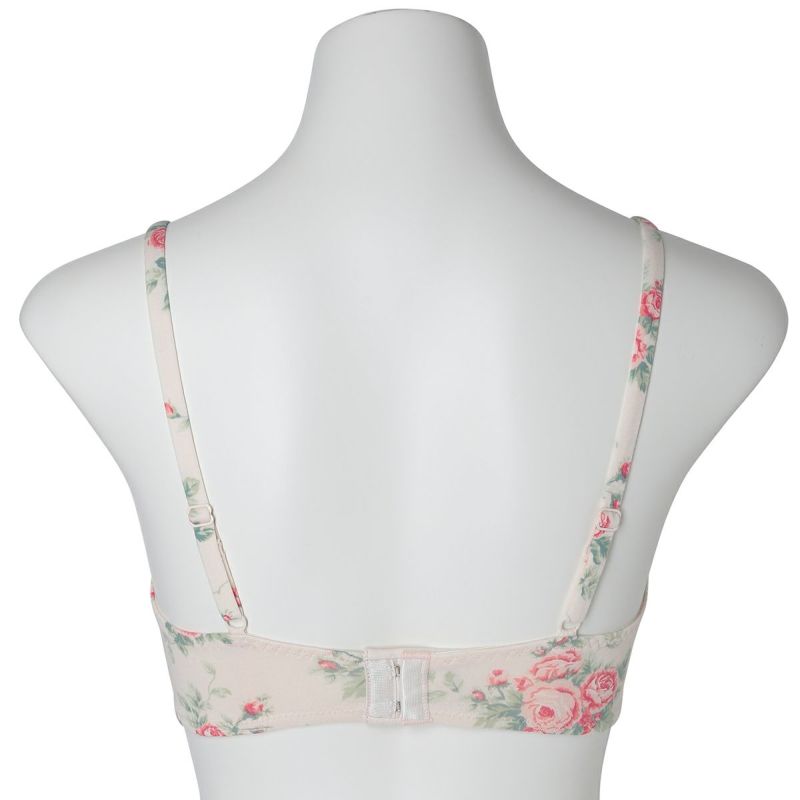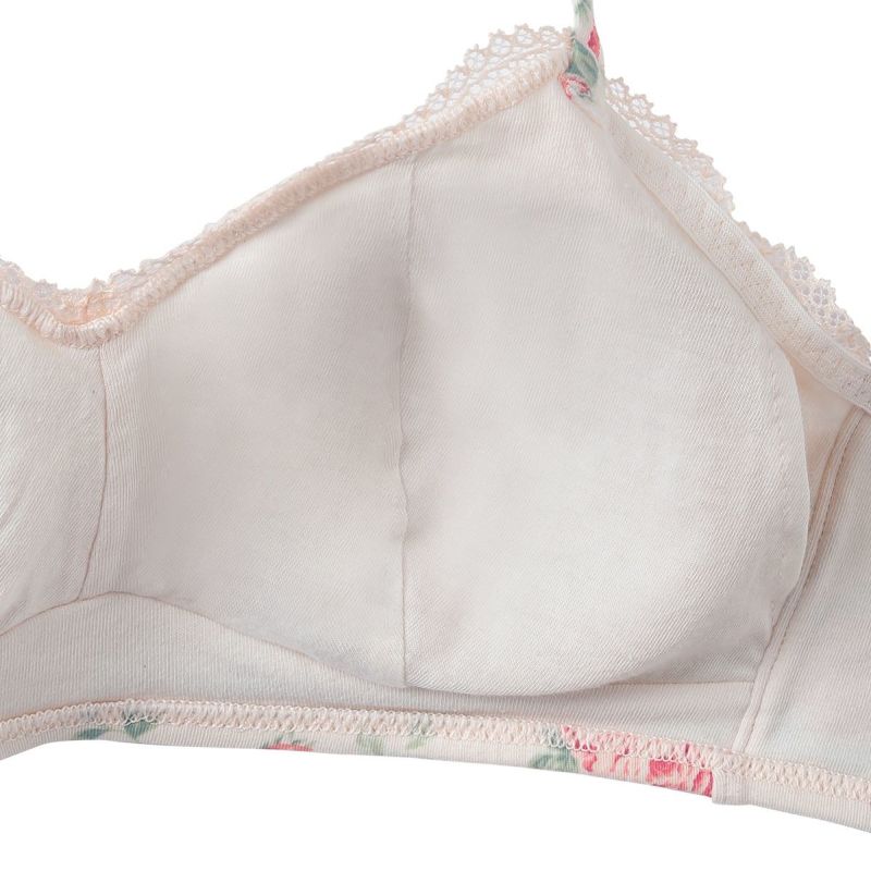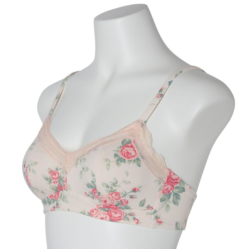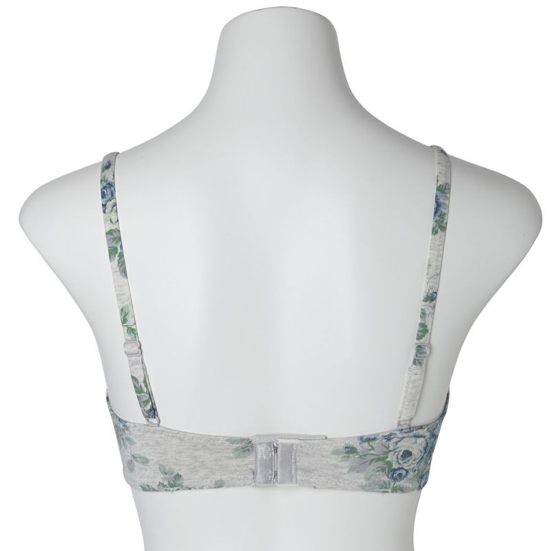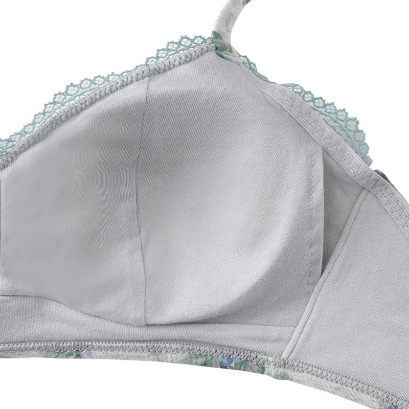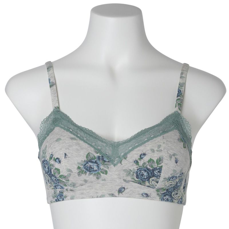 後ろホックタイプのノンワイヤーブラジャー。ストラップやアンダーバックまで総柄で華やか。カップ上部にあしらったレースで大人フェミニンに。