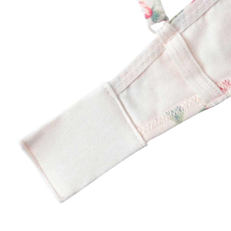 カップ裏肌側は綿天竺、アンダーバッグの裏打ちは綿ベア天。フックアイの肌に当たる部分は綿ベア天でくるんだ特許仕様で肌への優しさにもこだわりました。