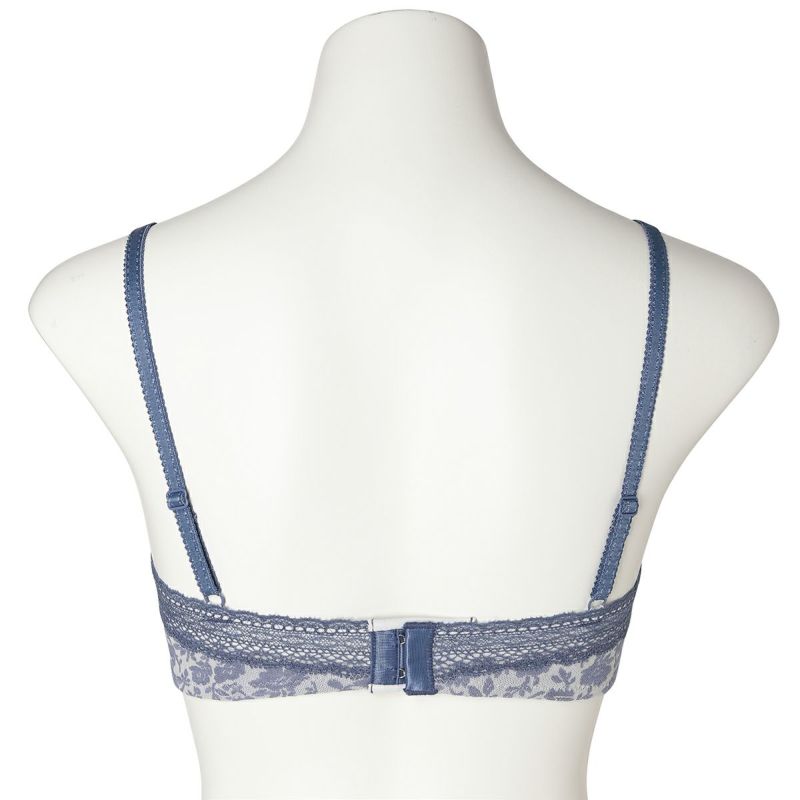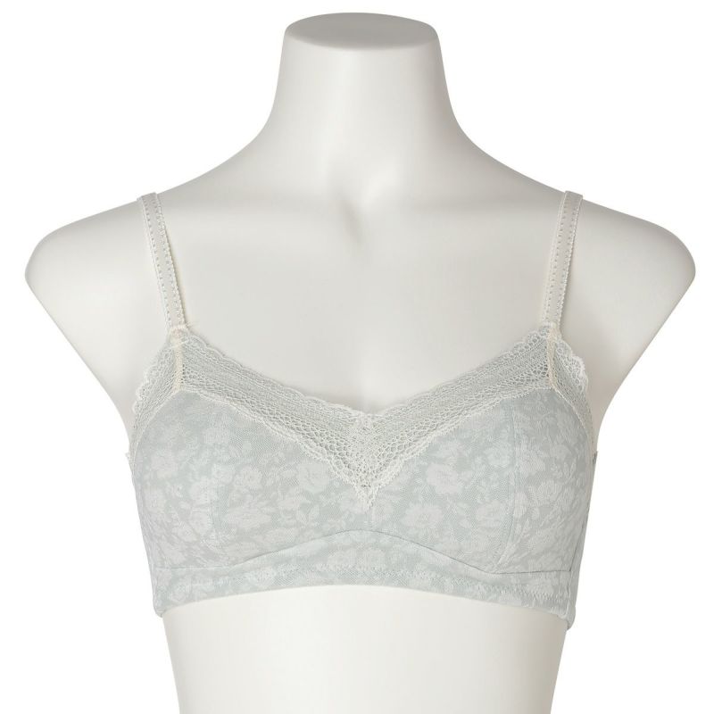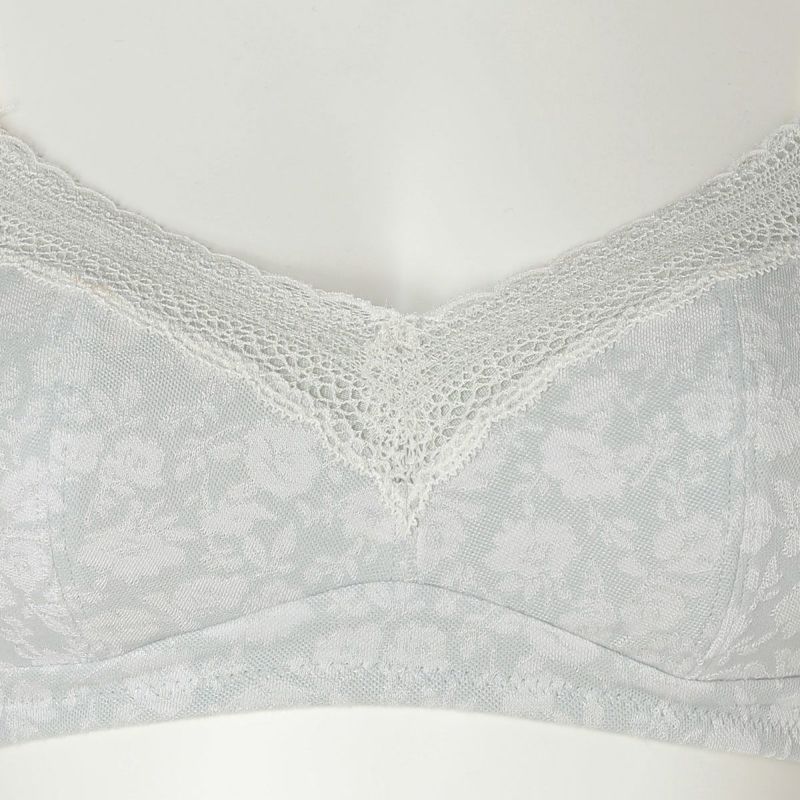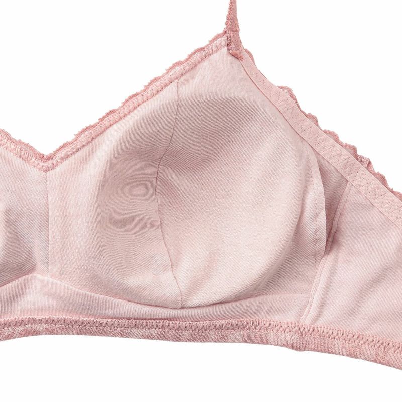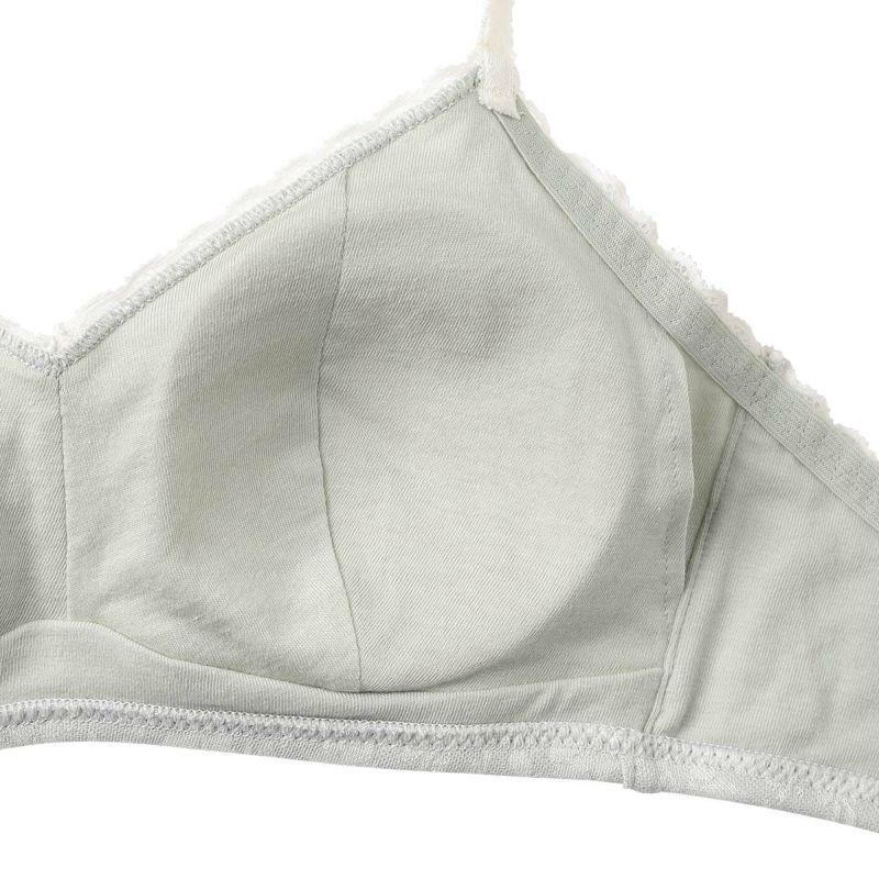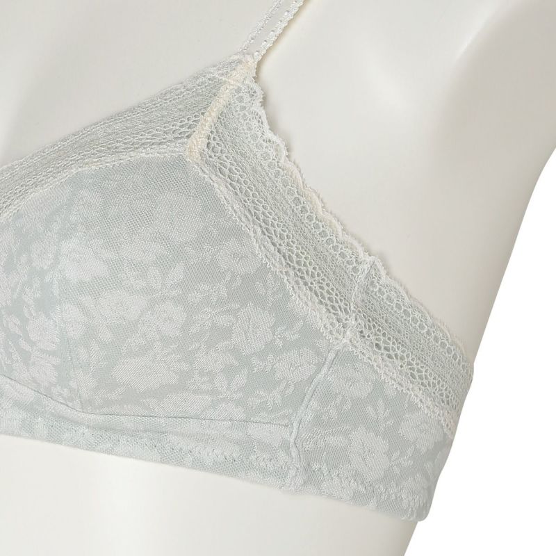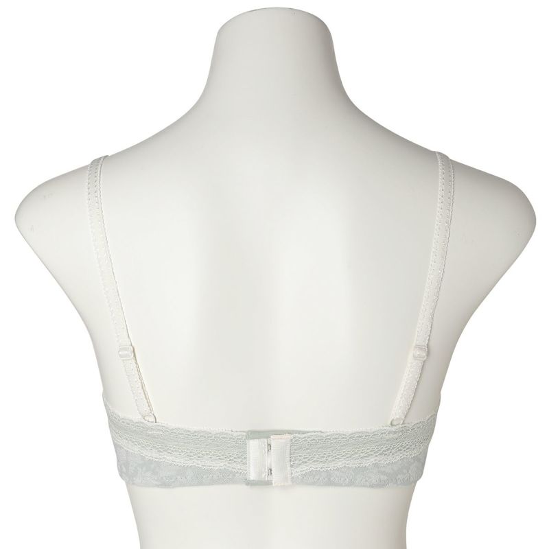 後ろフック仕様のノンワイヤーブラジャー。カップ上部から背中まであしらった幅広レースにより優しい雰囲気に。肌に当たるフックアイ部分は綿ベア天でくるんだ特許仕様を施しています。また、カップ裏には綿天竺、アンダーバッグの裏打ちには綿ベア天を使用しており、肌への優しさにもこだわりました。