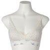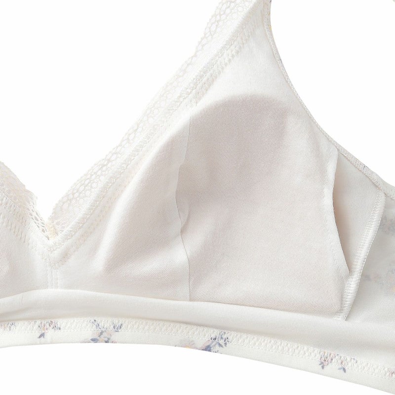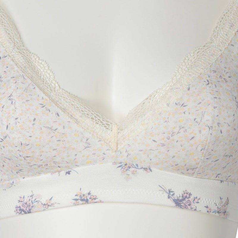 ストラップまでトリミングしたレースがかわいい後ろフックタイプのノンワイヤーブラジャー。フックアイの肌に当たる部分は綿ベア天でくるんだ特許仕様で肌への優しさにもこだわりました。