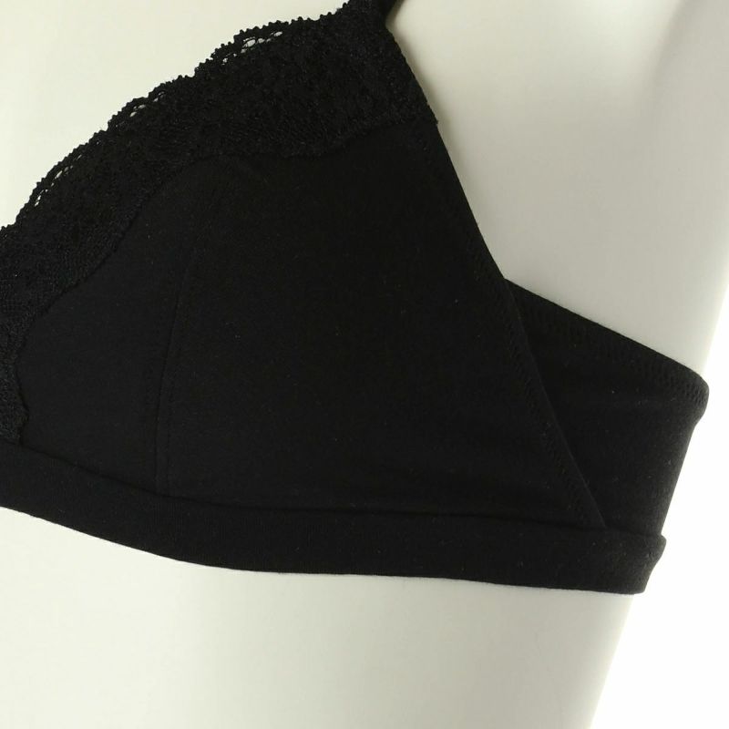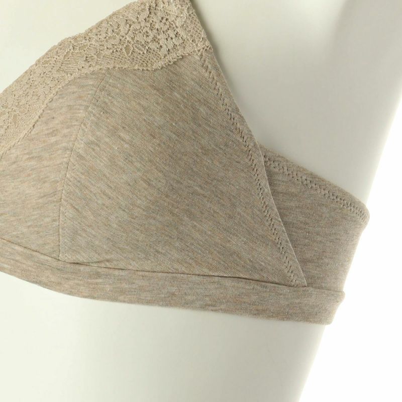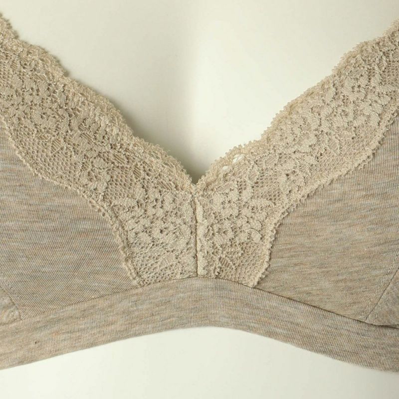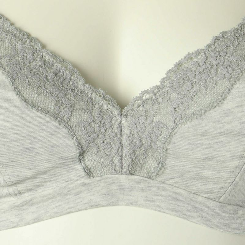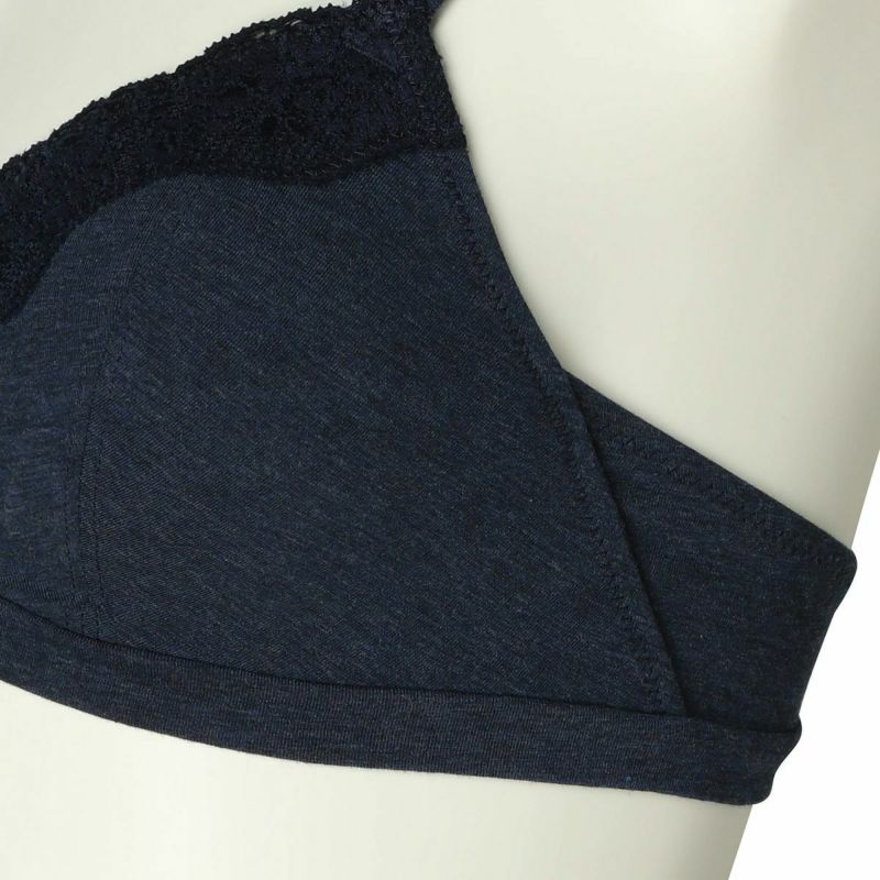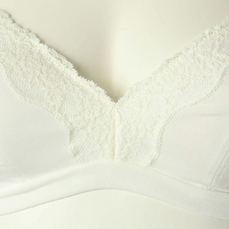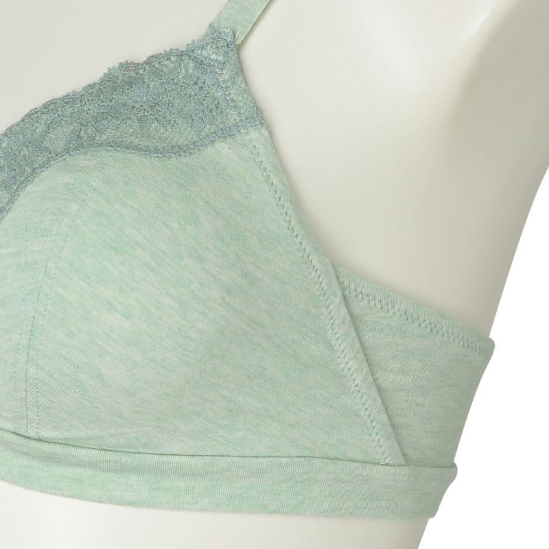 フックアイタイプのノンワイヤーブラジャー。バスト上辺に綿混レースを施し、アンダーバストはすっきりとしたノンレース。ボーン無しで肌側アンダーは綿混素材のソフトな着用感。フックアイ部分の肌側は綿ベア天でくるみ、縫い目を肌に当たりにくくした特許仕様。肩ストラップは共地の無縫製タイプで薄く肩への負担が少ない仕立て。カップ肌側は綿天竺でやさしい肌触り。