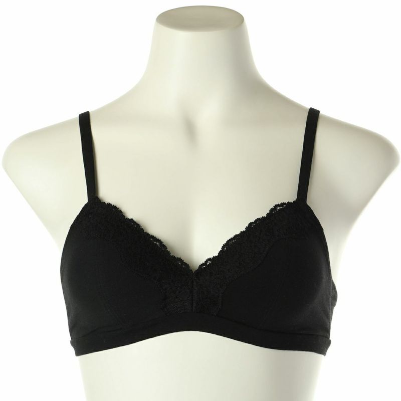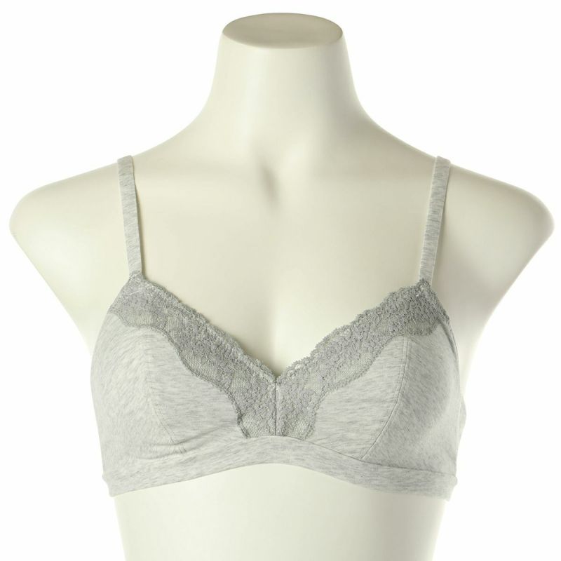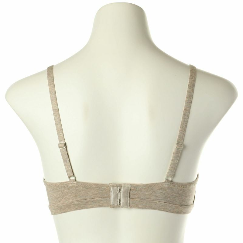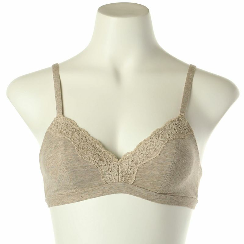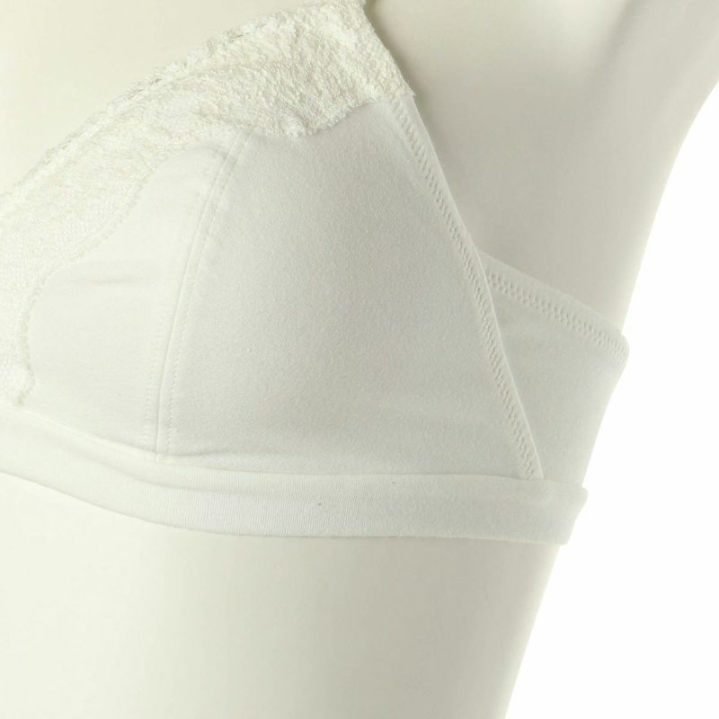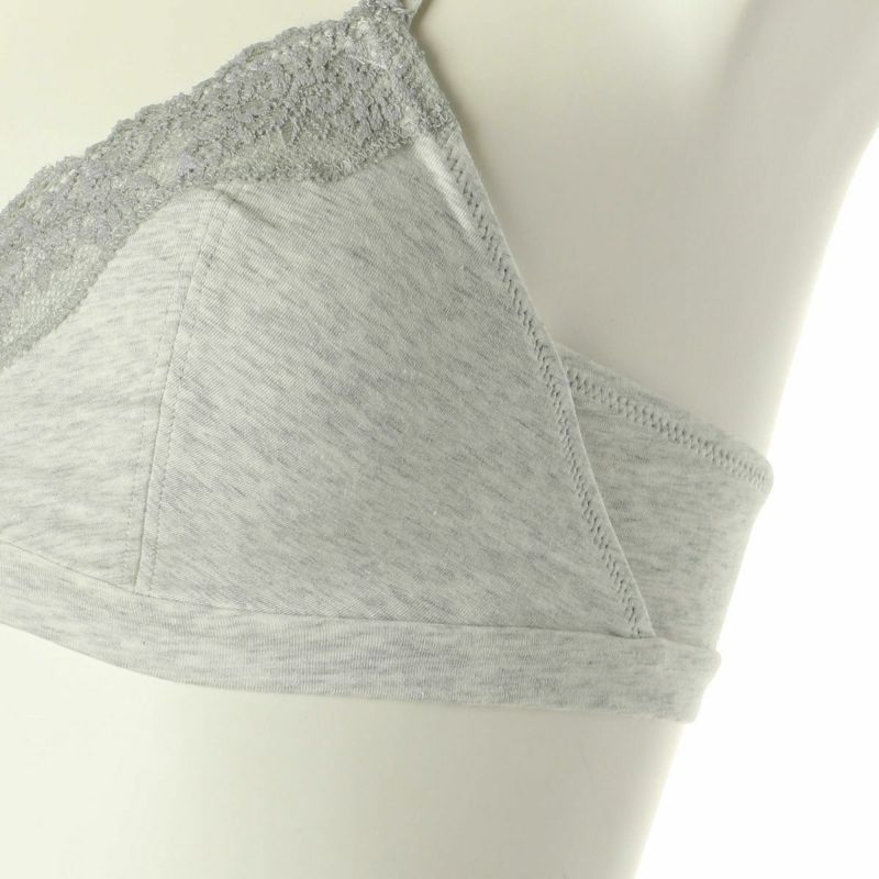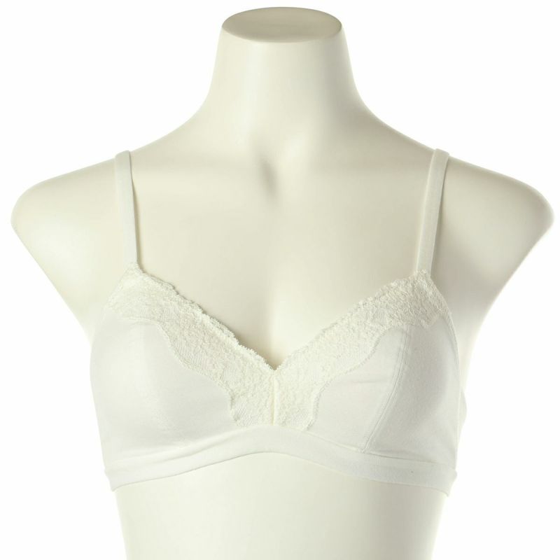 フックアイタイプのノンワイヤーブラジャー。バスト上辺に綿混レースを施し、アンダーバストはすっきりとしたノンレース。ボーン無しで肌側アンダーは綿混素材のソフトな着用感。フックアイ部分の肌側は綿ベア天でくるみ、縫い目を肌に当たりにくくした特許仕様。肩ストラップは共地の無縫製タイプで薄く肩への負担が少ない仕立て。カップ肌側は綿天竺でやさしい肌触り。