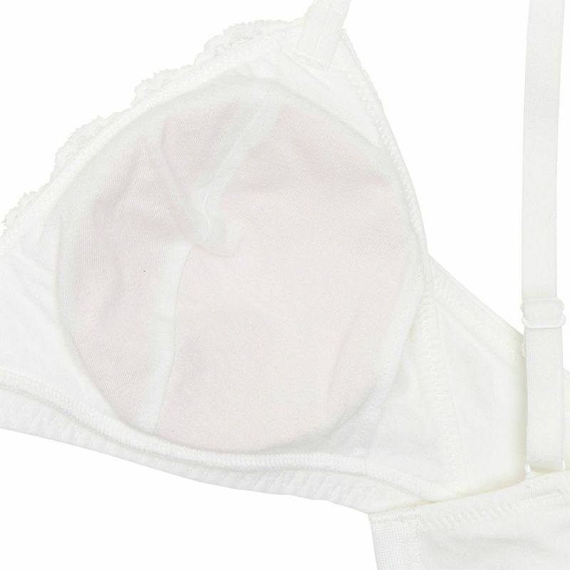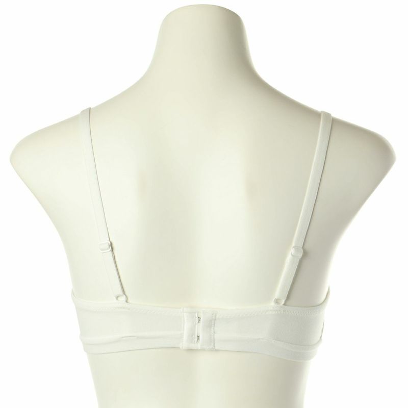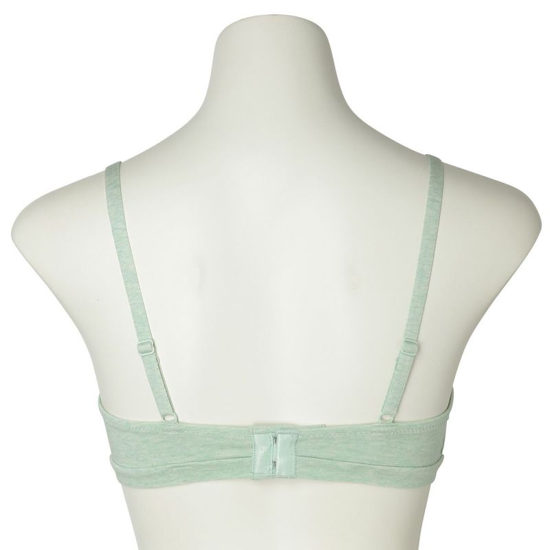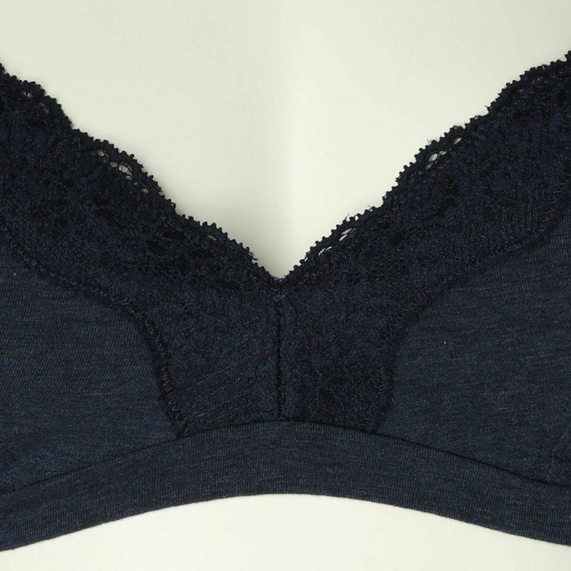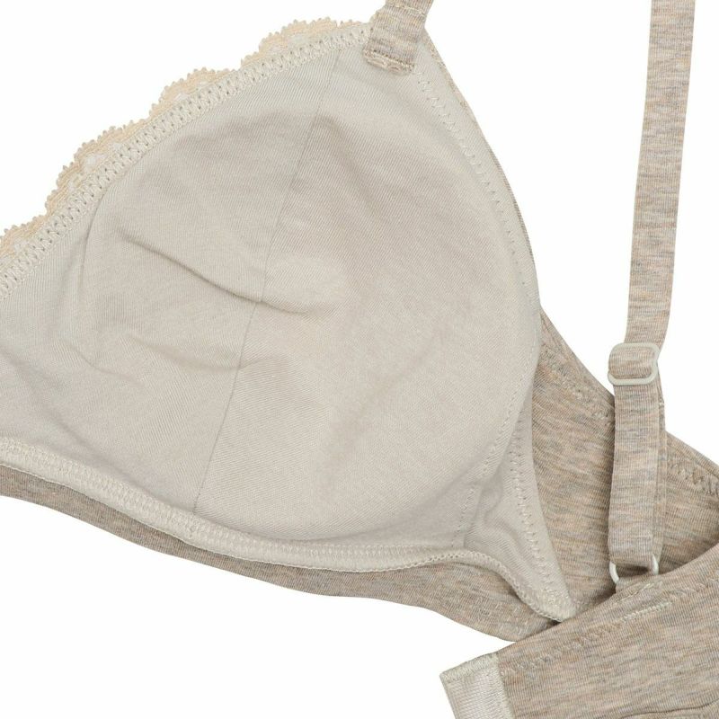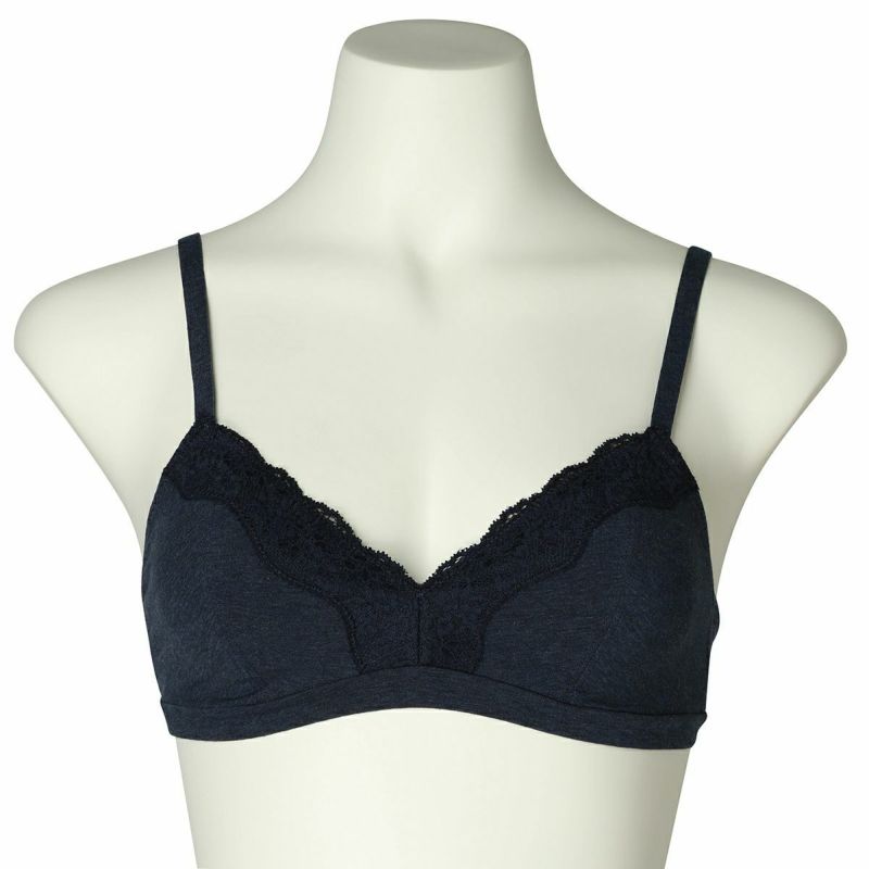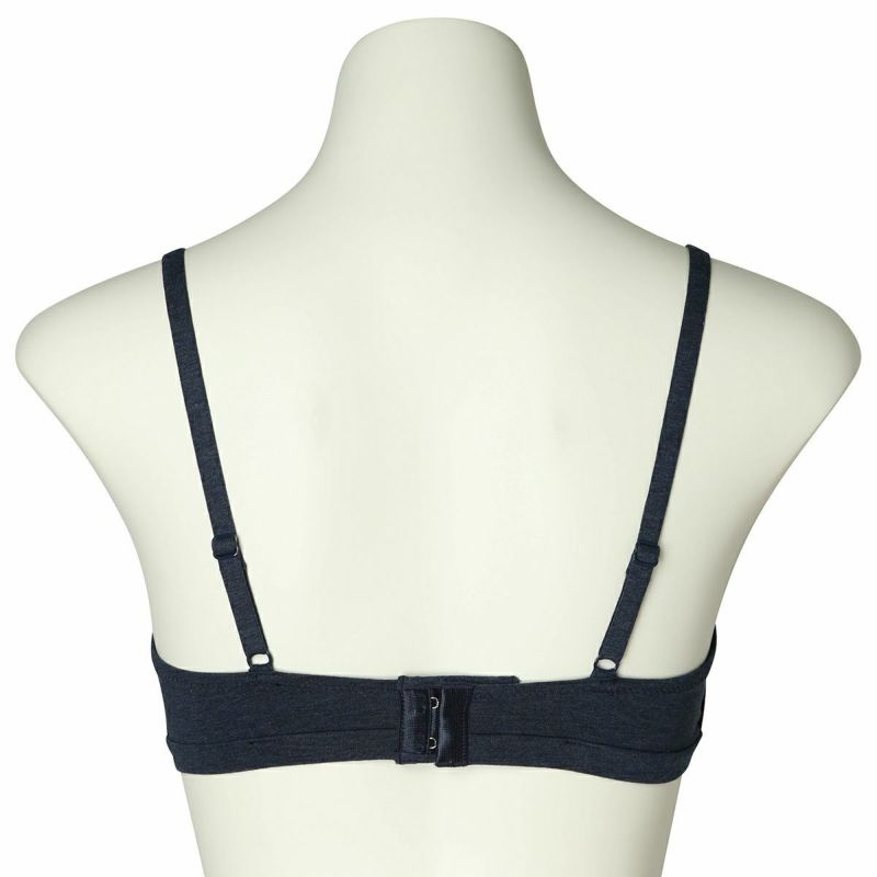 フックアイタイプのノンワイヤーブラジャー。バスト上辺に綿混レースを施し、アンダーバストはすっきりとしたノンレース。ボーン無しで肌側アンダーは綿混素材のソフトな着用感。フックアイ部分の肌側は綿ベア天でくるみ、縫い目を肌に当たりにくくした特許仕様。肩ストラップは共地の無縫製タイプで薄く肩への負担が少ない仕立て。カップ肌側は綿天竺でやさしい肌触り。