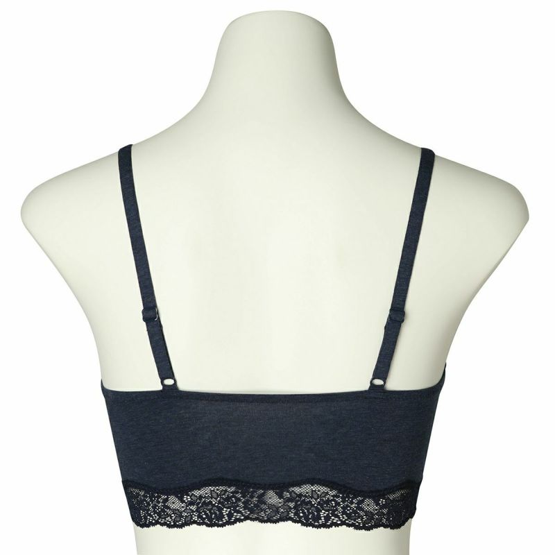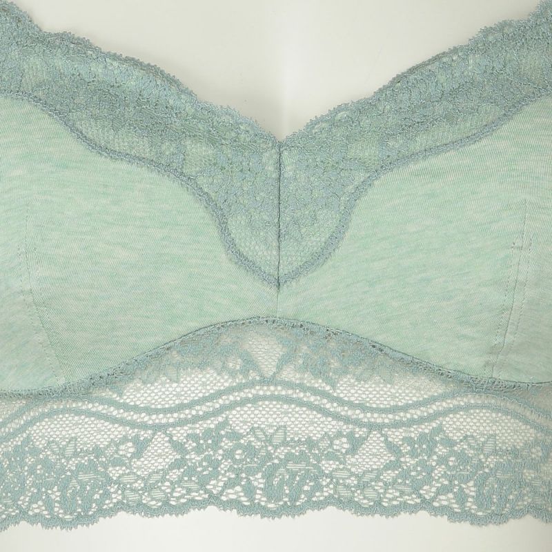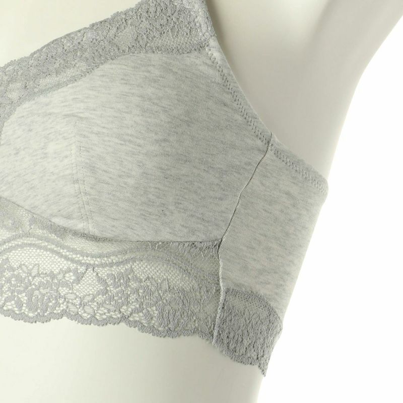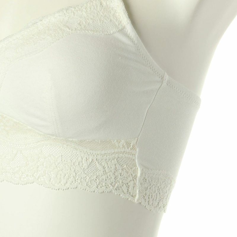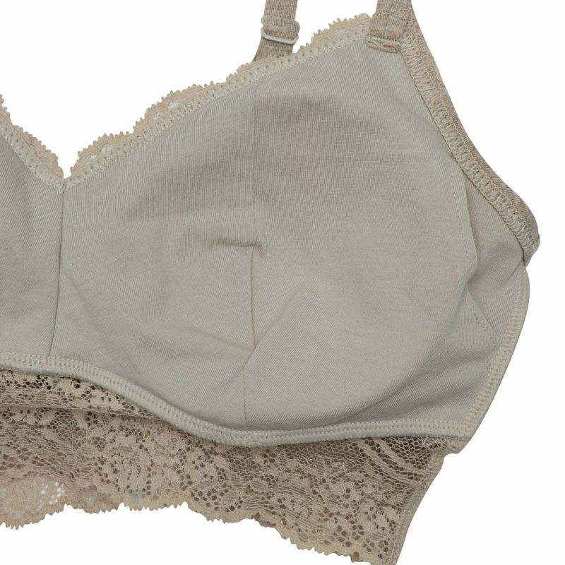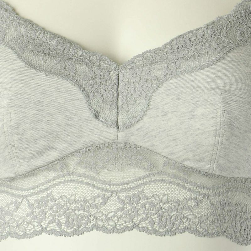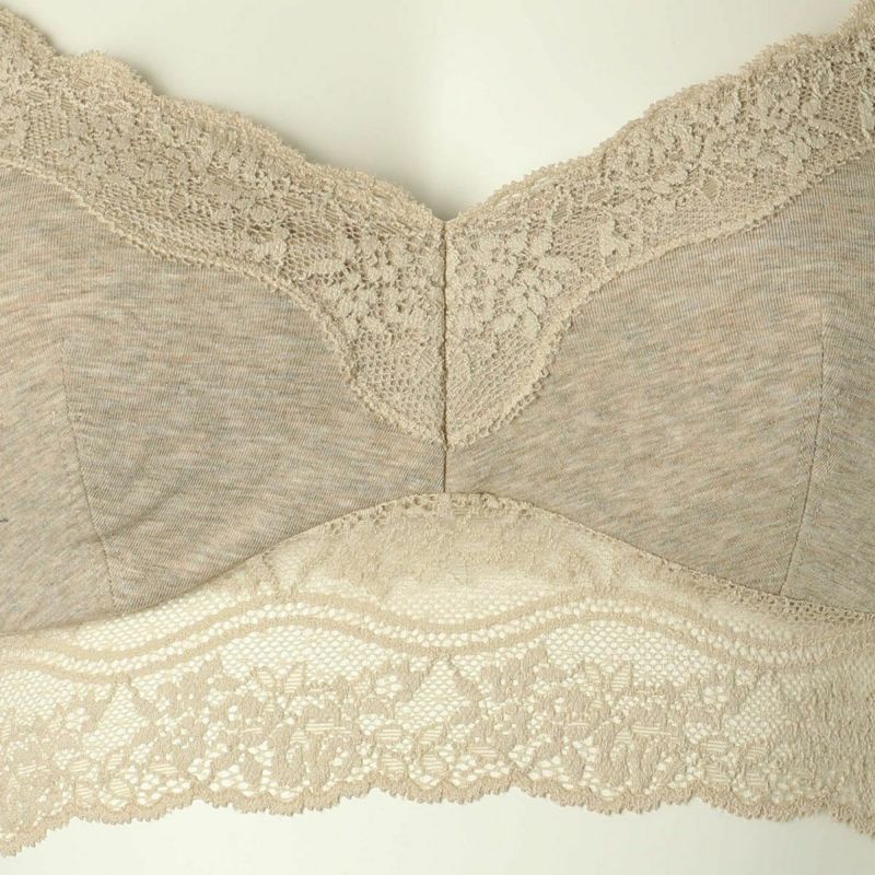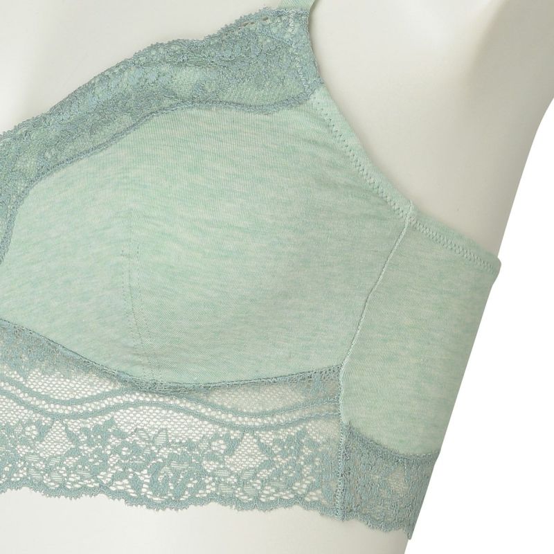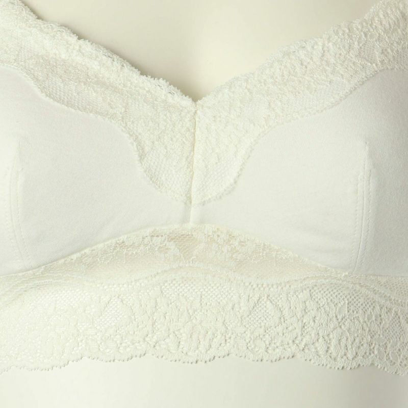 フックのないリラクシーなかぶりタイプのノンワイヤーブラは、綿混レースをたっぷり施しました。マットな綿混レースで華やかな中にもクリーンな品が漂います。レースを活かしたアンダーはキックバックがありフィット感もよく定評あるタイプ。肩ストラップは共地の無縫製タイプで薄く肩への負担が少ない仕様。カップ肌側は綿天竺。