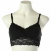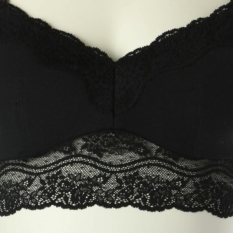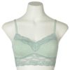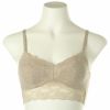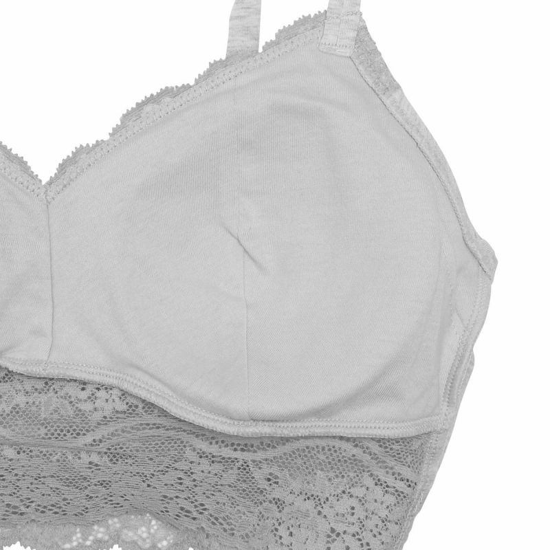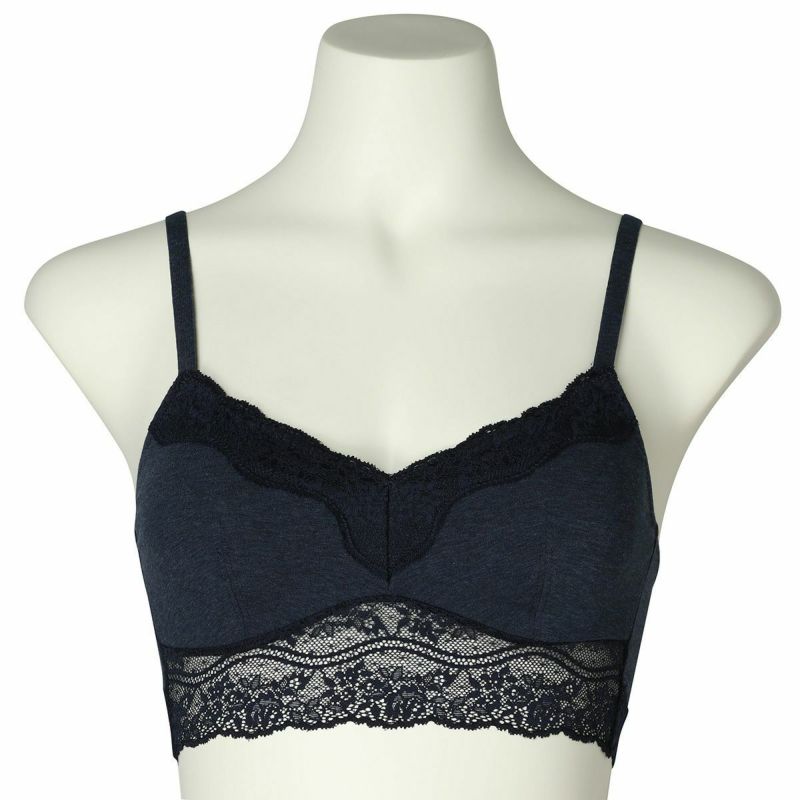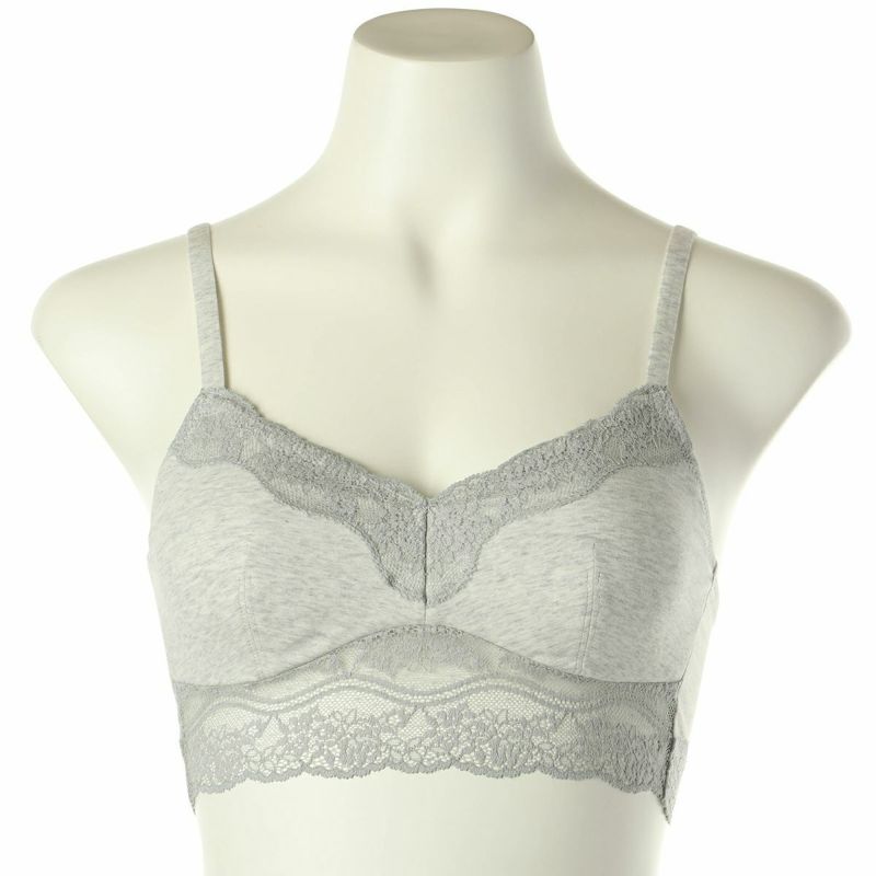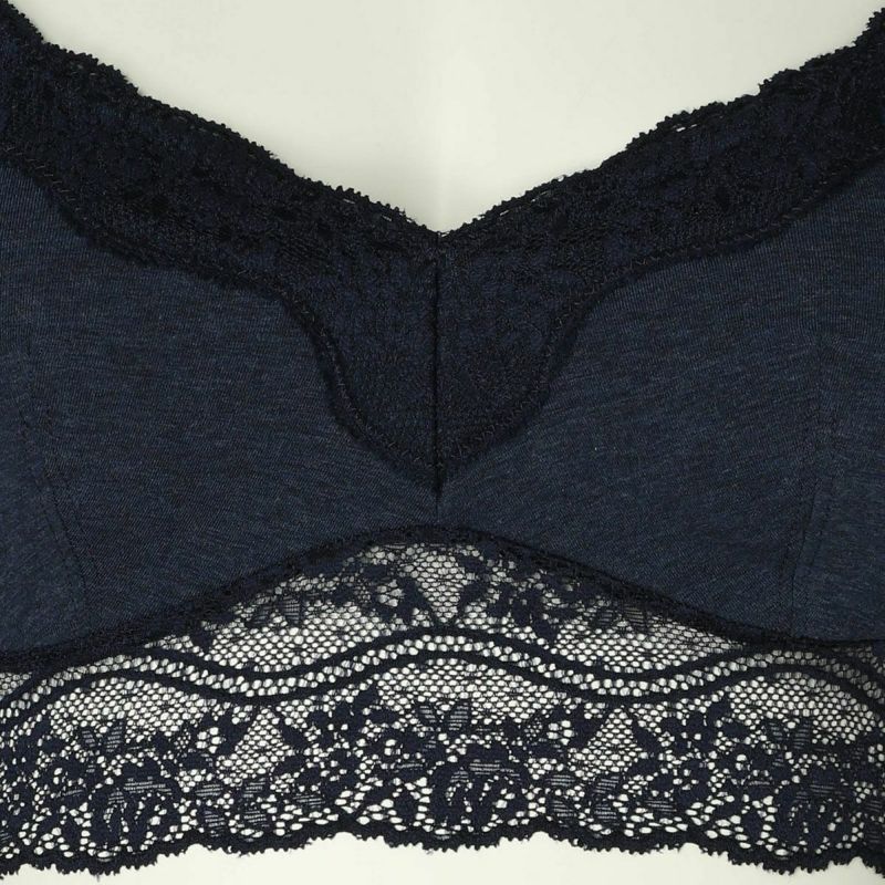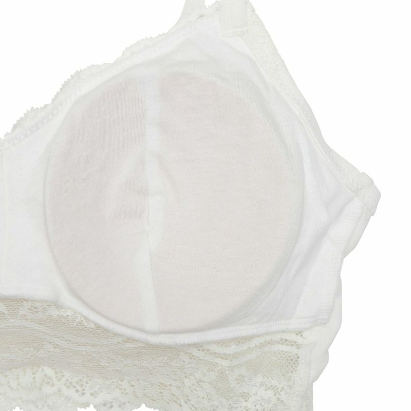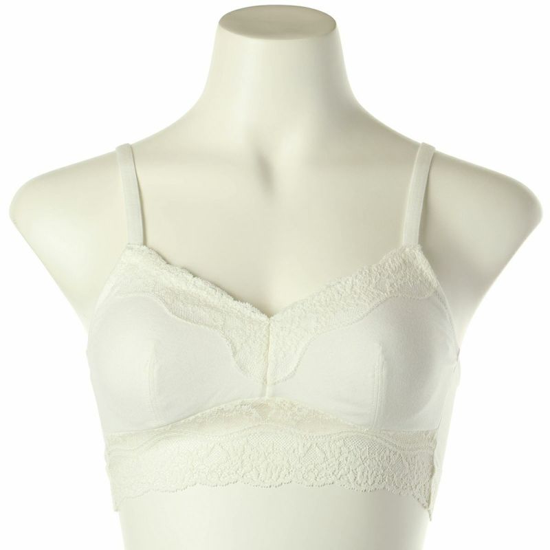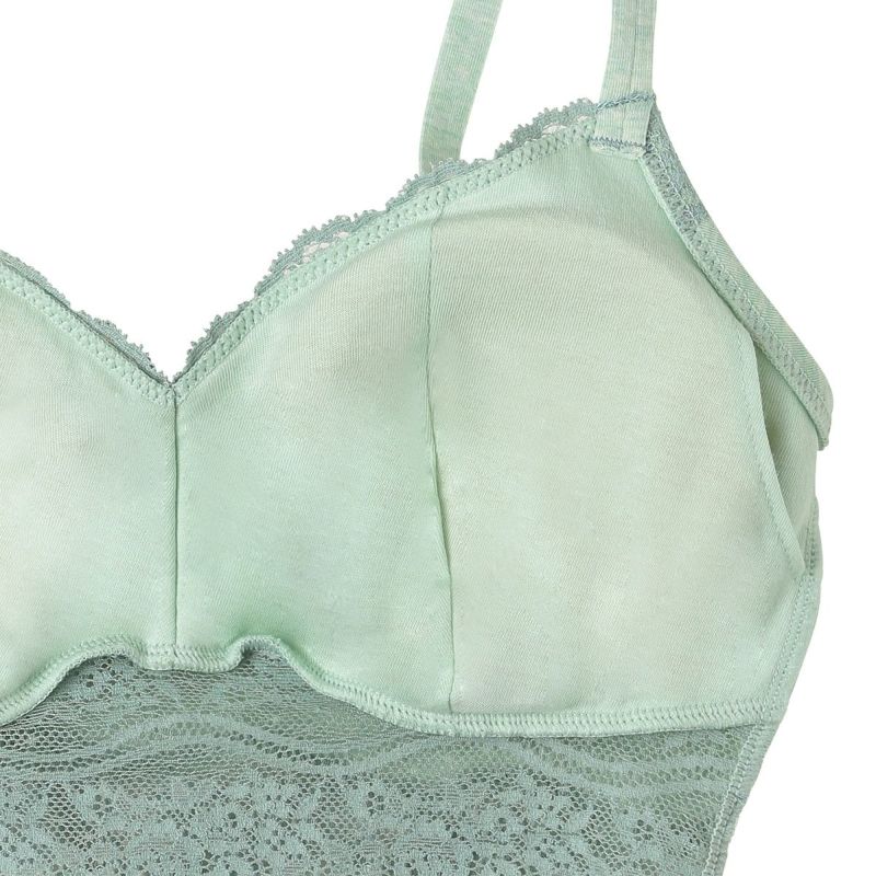 フックのないリラクシーなかぶりタイプのノンワイヤーブラは、綿混レースをたっぷり施しました。マットな綿混レースで華やかな中にもクリーンな品が漂います。レースを活かしたアンダーはキックバックがありフィット感もよく定評あるタイプ。肩ストラップは共地の無縫製タイプで薄く肩への負担が少ない仕様。カップ肌側は綿天竺。
