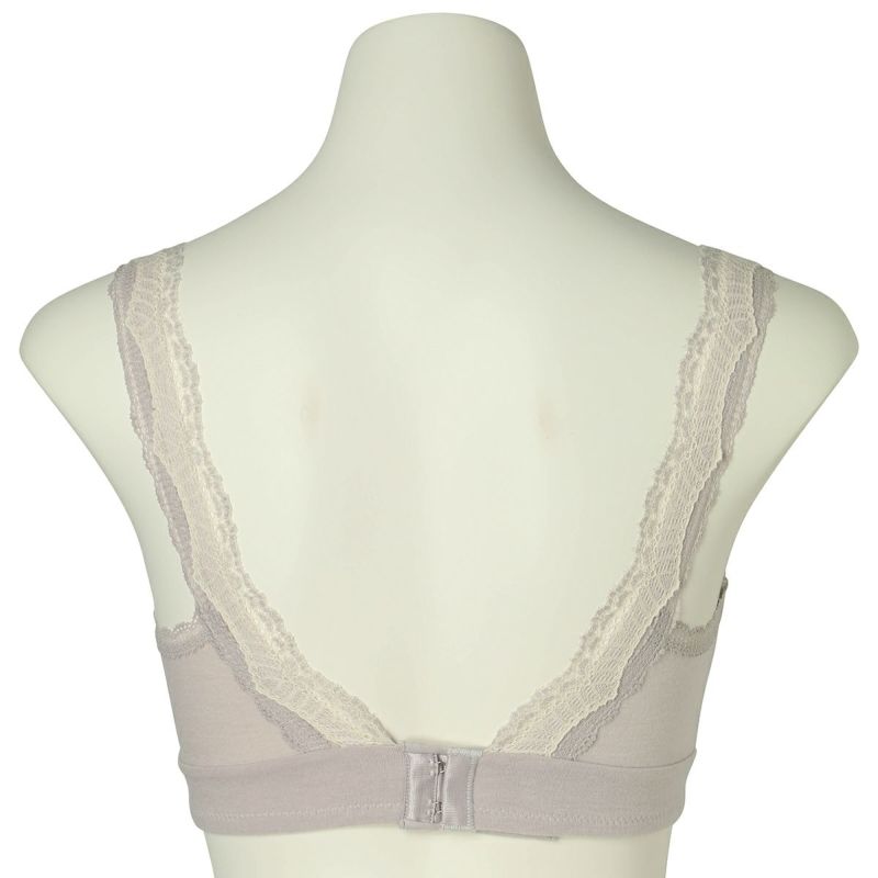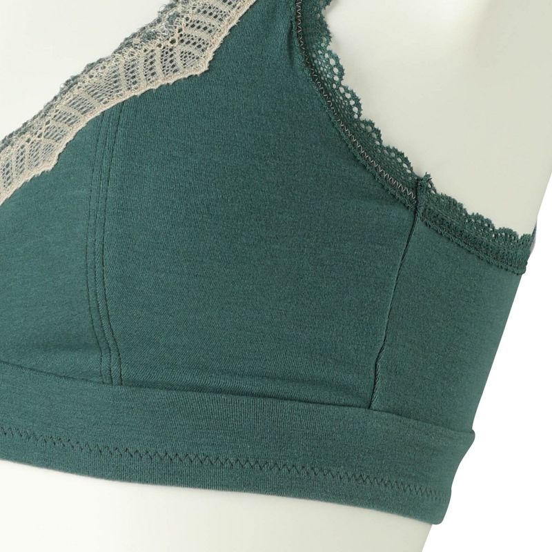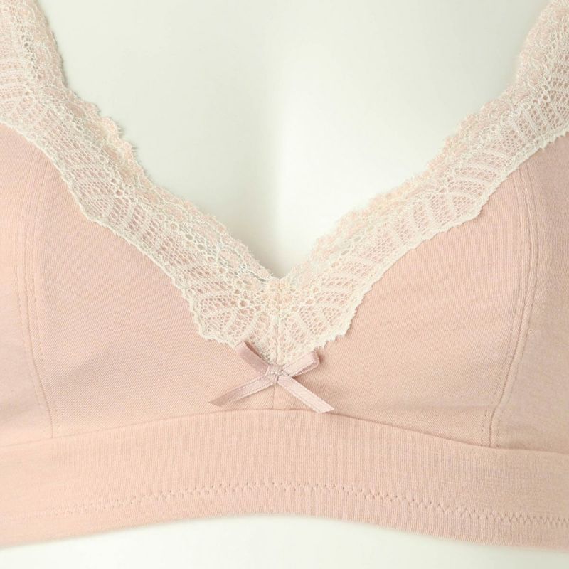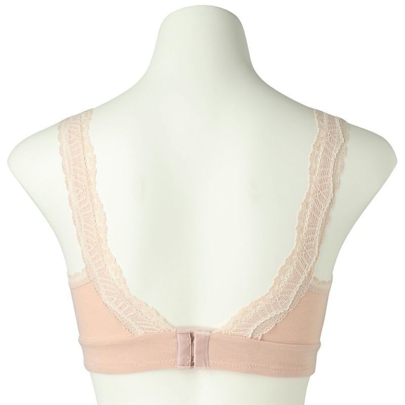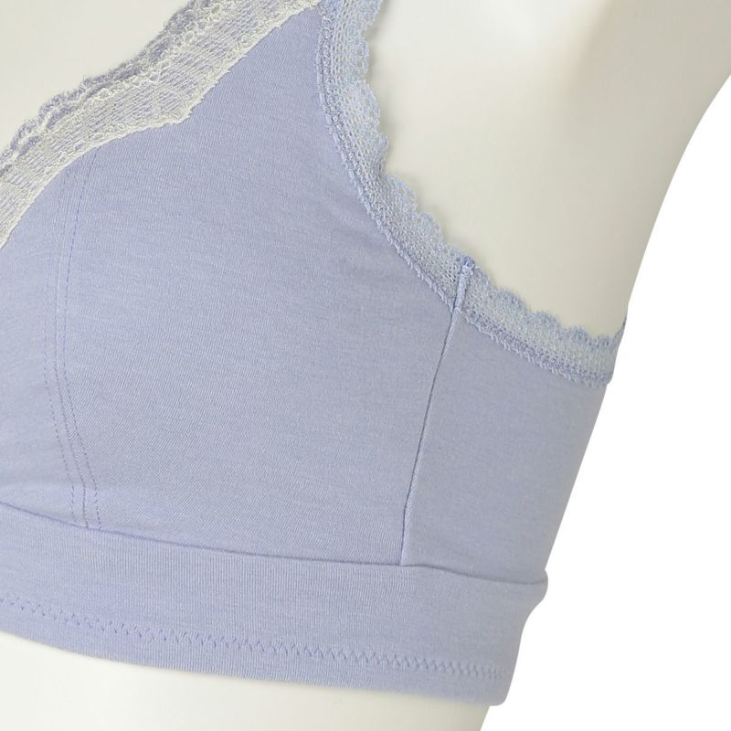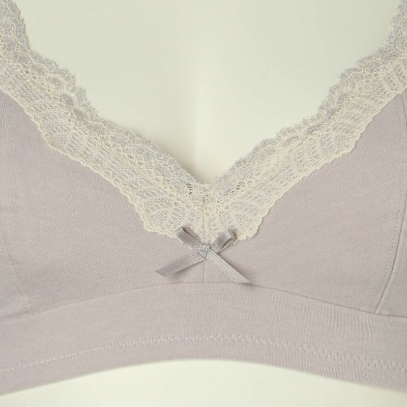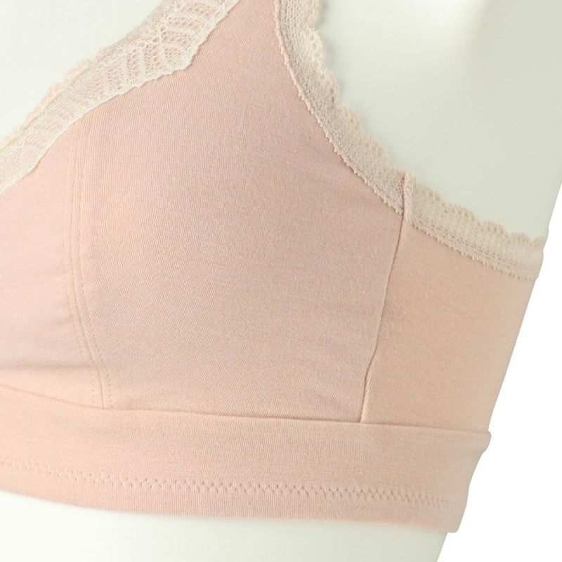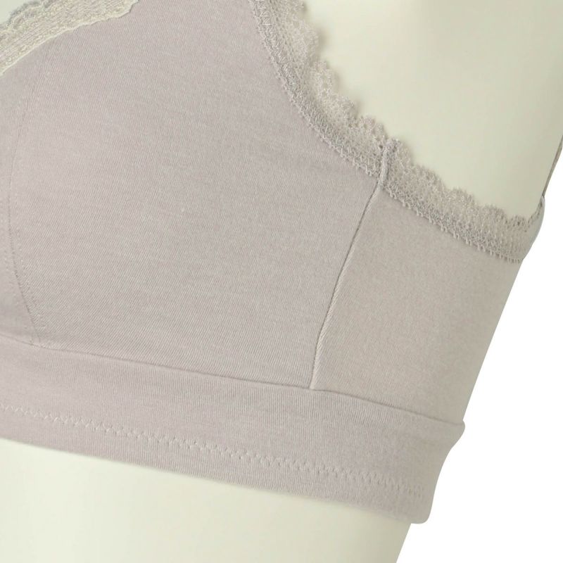 フックアイタイプのノンワイヤーブラジャーは、ナチュラルなシルエットの三角パッドタイプ。脇のボーンが無く楽な着用感ながらサイドの幅があるので安定感あり。フロントから背中まで続くレースが華やかです。カップ肌側は綿天竺。肌に当たるフックアイの部分は、綿ベア天でくるんだ特許仕様。できるだけ肌への優しさにこだわりました。