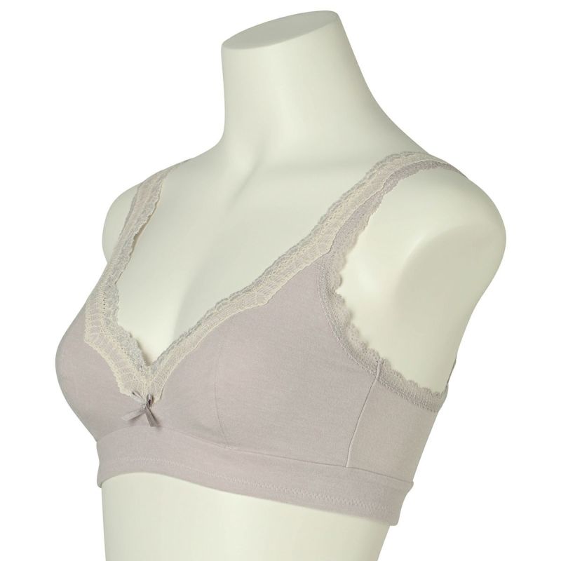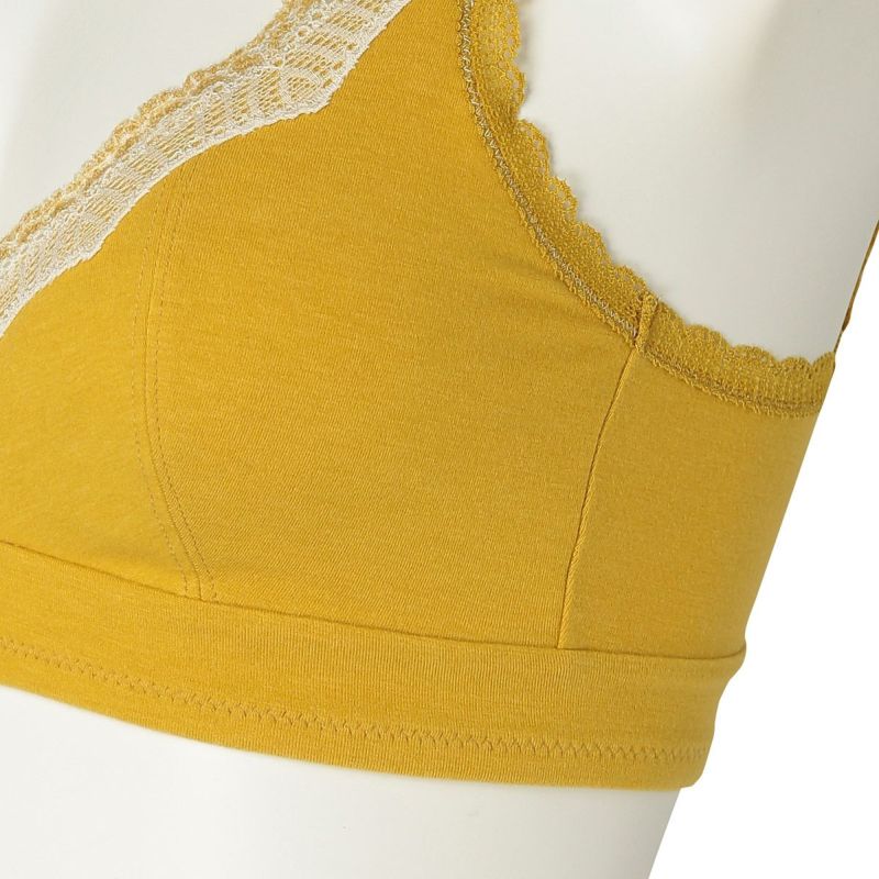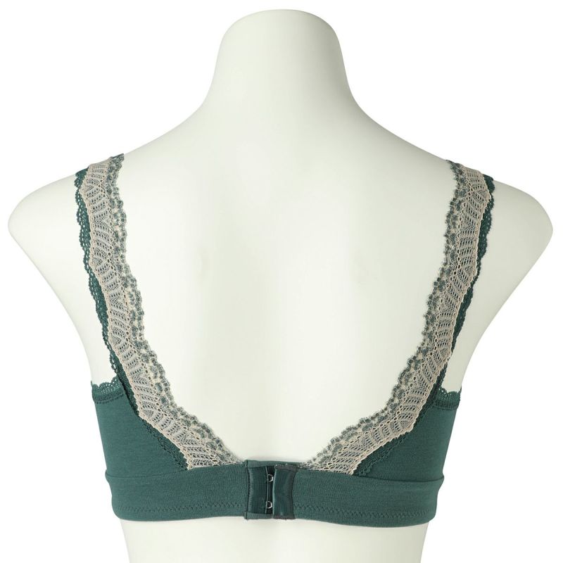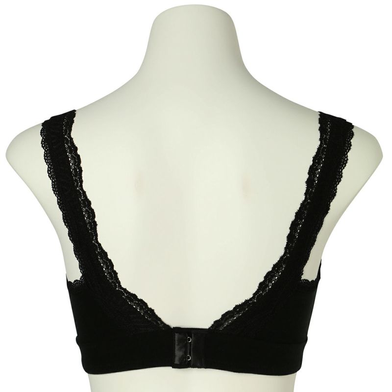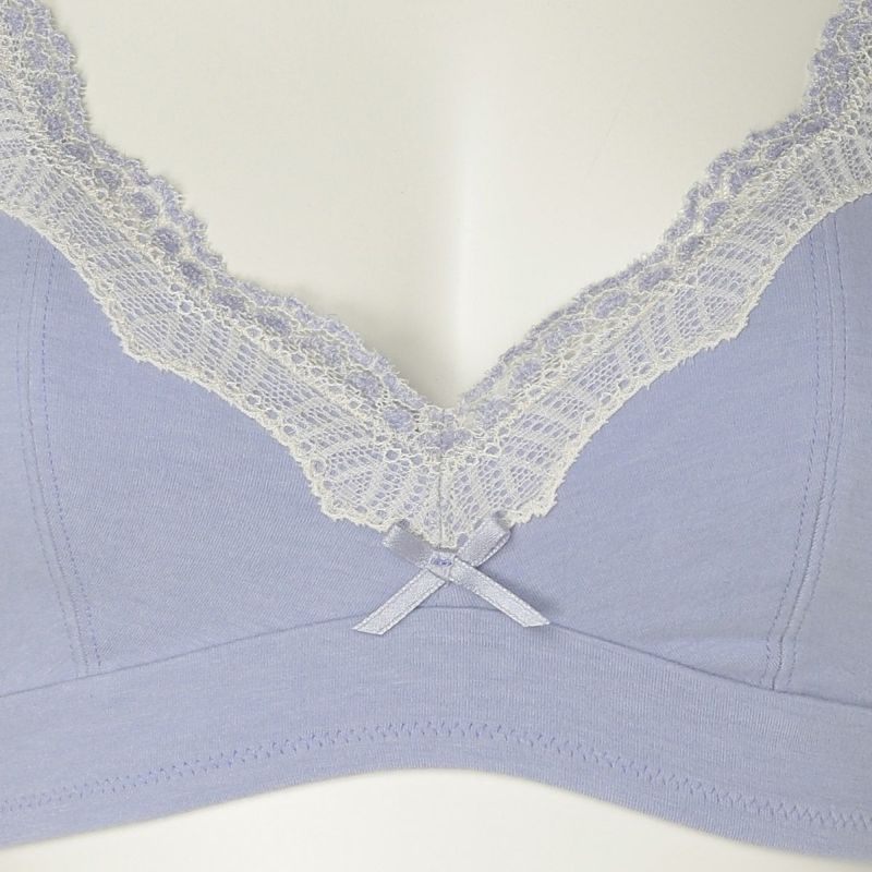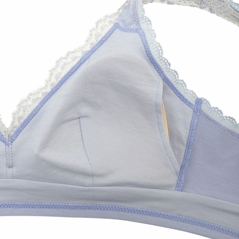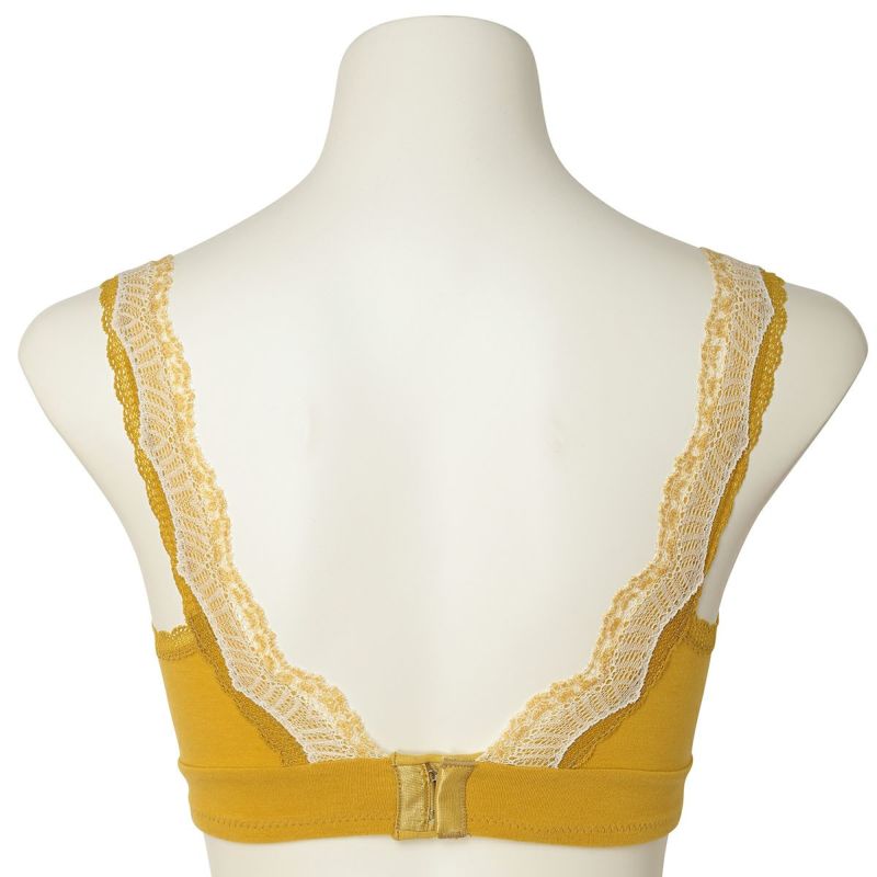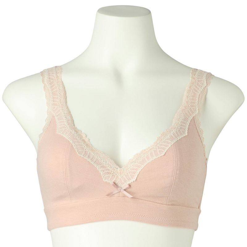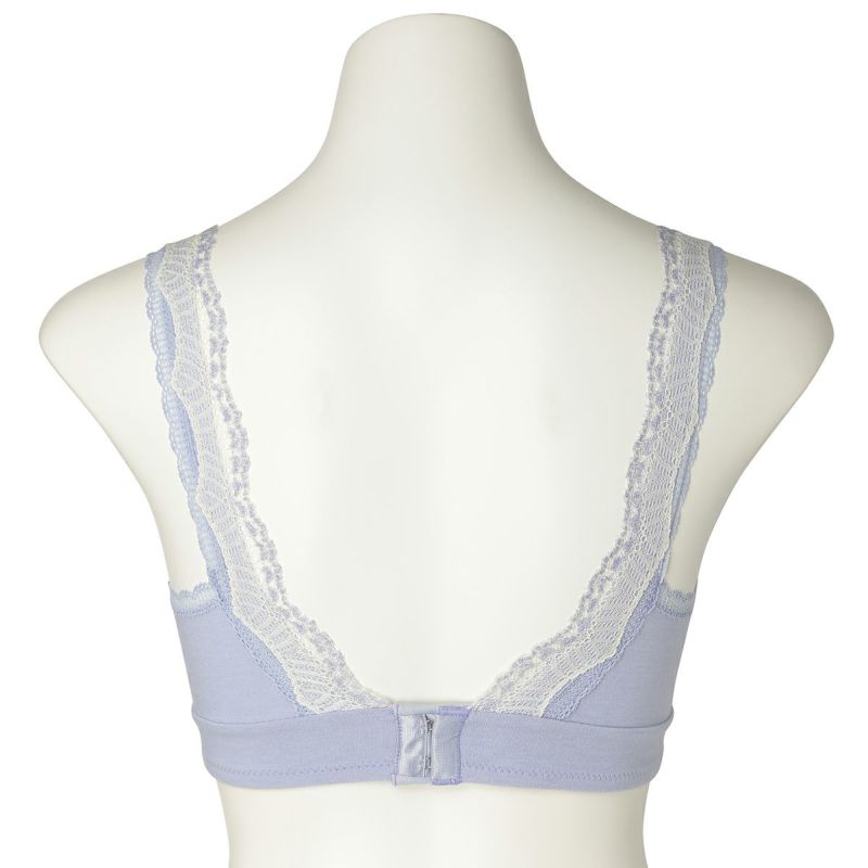 フックアイタイプのノンワイヤーブラジャーは、ナチュラルなシルエットの三角パッドタイプ。脇のボーンが無く楽な着用感ながらサイドの幅があるので安定感あり。フロントから背中まで続くレースが華やかです。カップ肌側は綿天竺。肌に当たるフックアイの部分は、綿ベア天でくるんだ特許仕様。できるだけ肌への優しさにこだわりました。