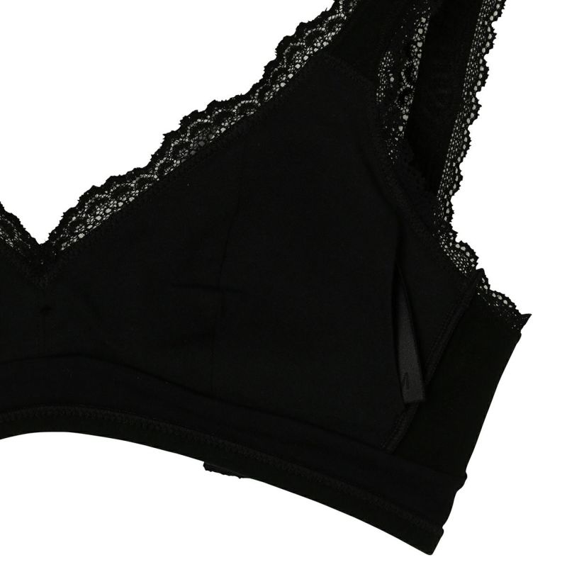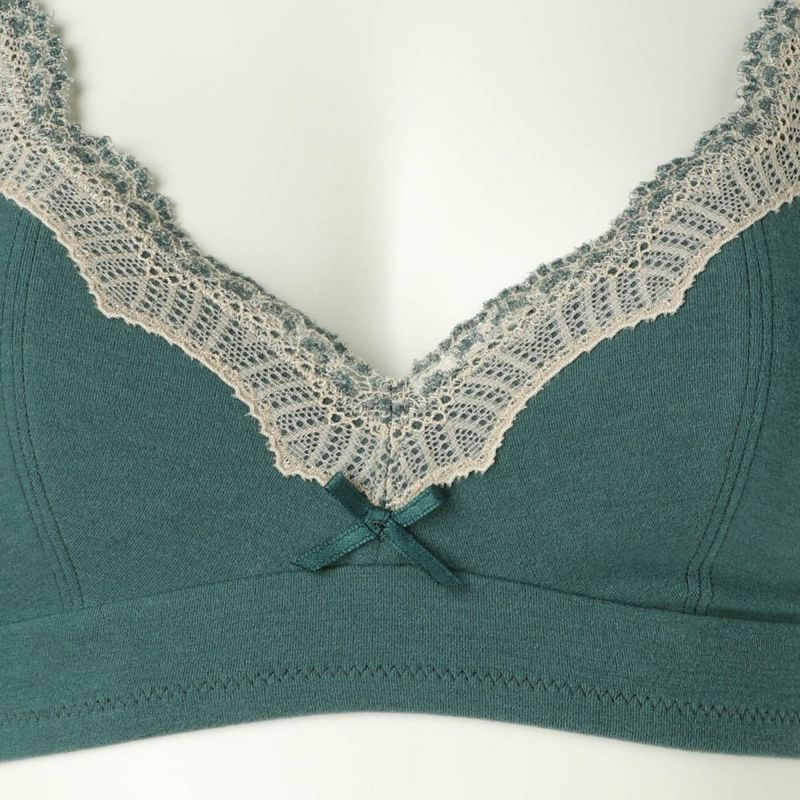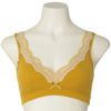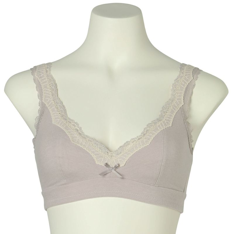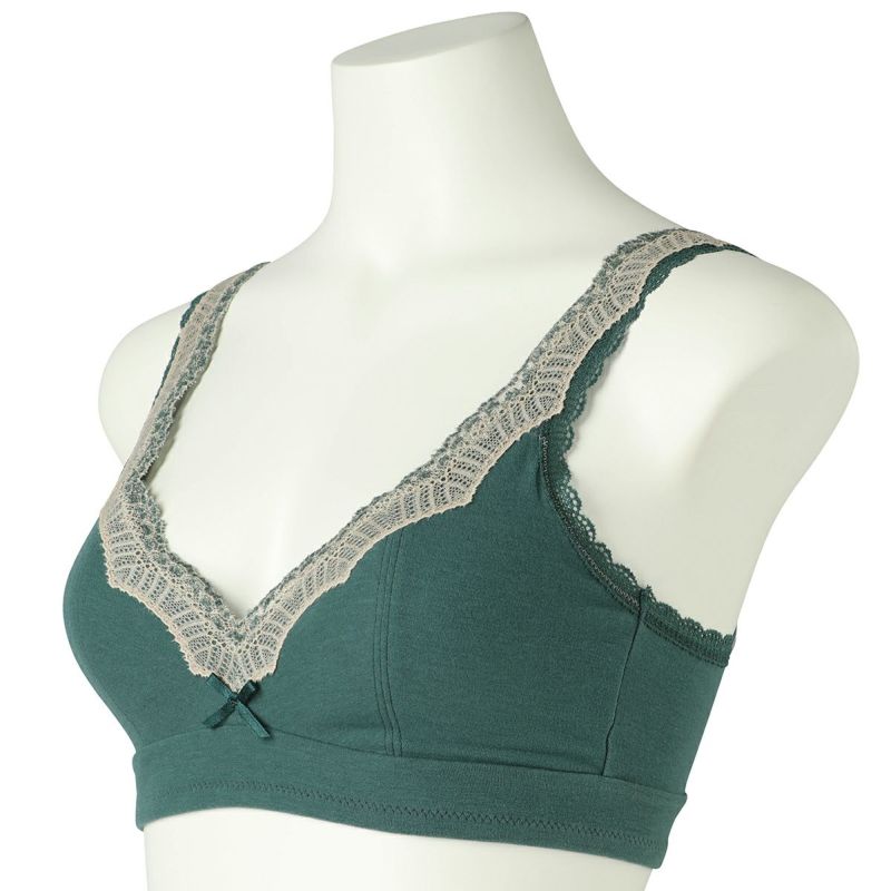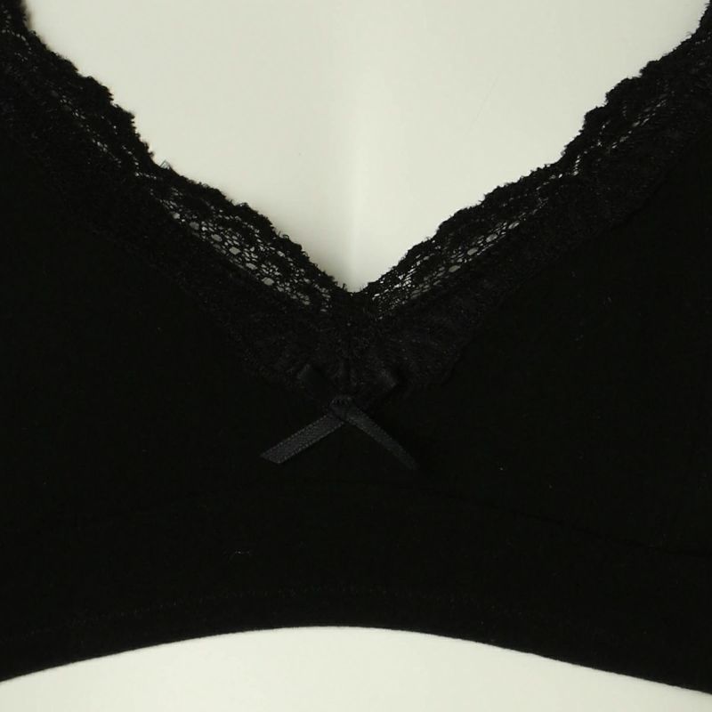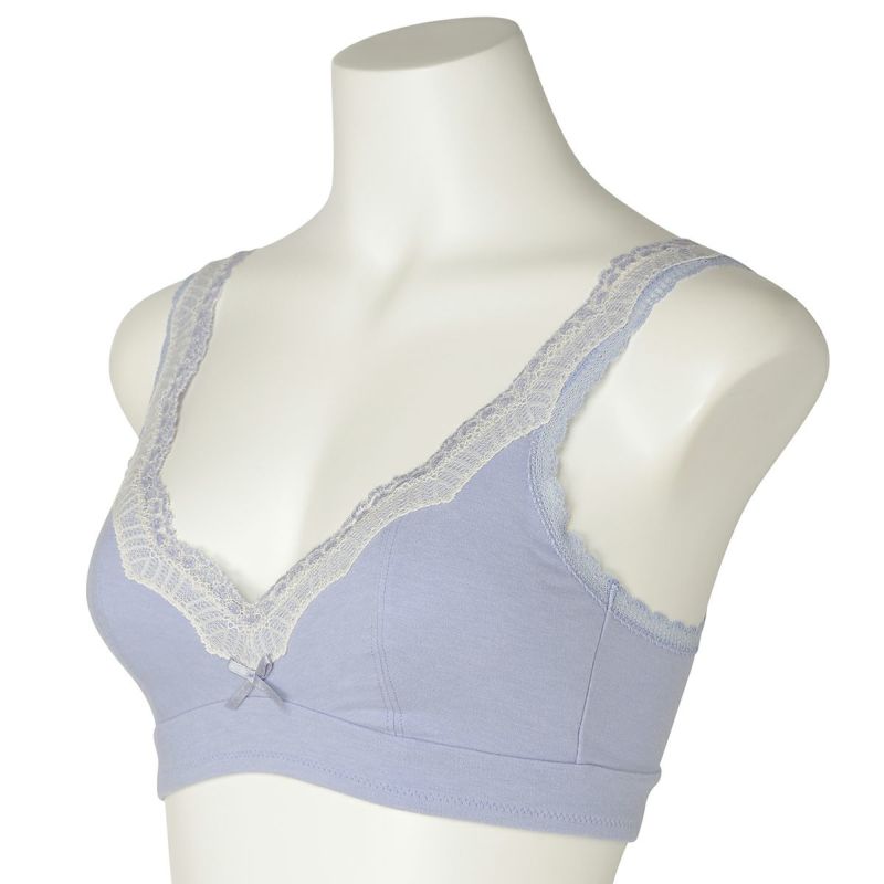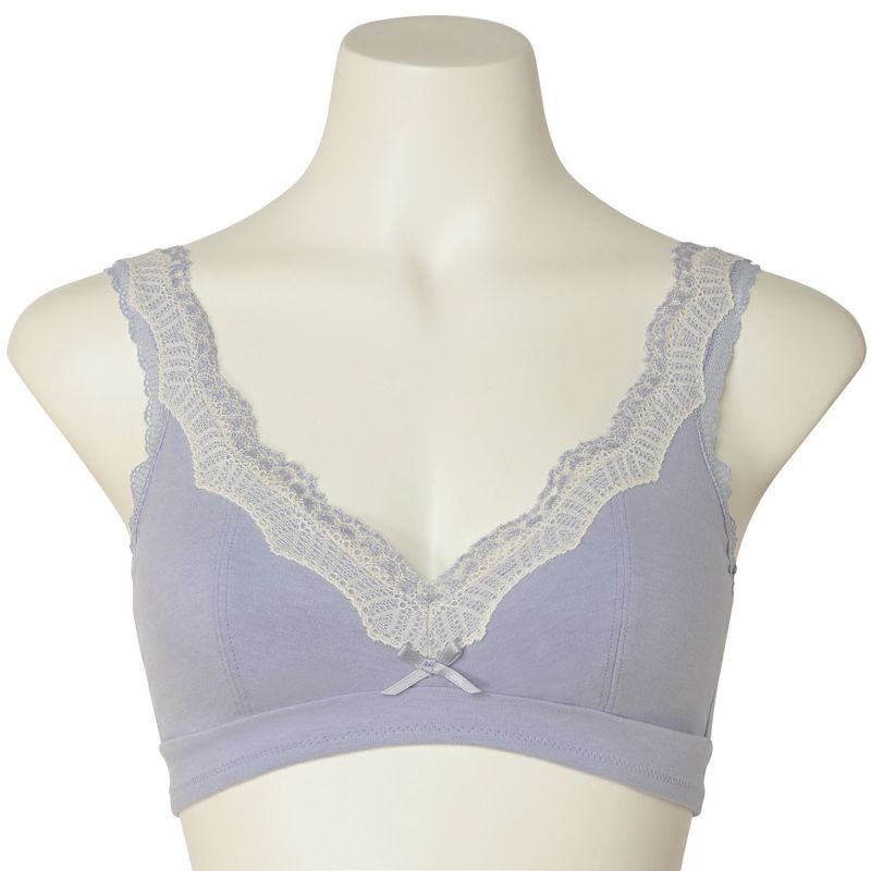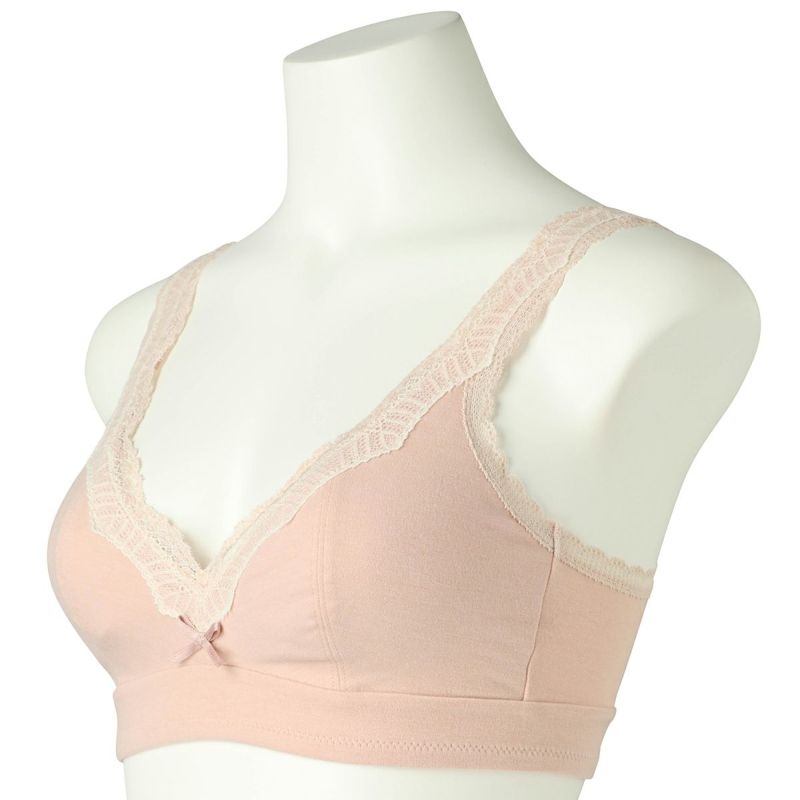 フックアイタイプのノンワイヤーブラジャーは、ナチュラルなシルエットの三角パッドタイプ。脇のボーンが無く楽な着用感ながらサイドの幅があるので安定感あり。フロントから背中まで続くレースが華やかです。カップ肌側は綿天竺。肌に当たるフックアイの部分は、綿ベア天でくるんだ特許仕様。できるだけ肌への優しさにこだわりました。