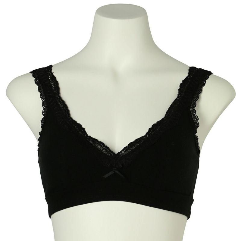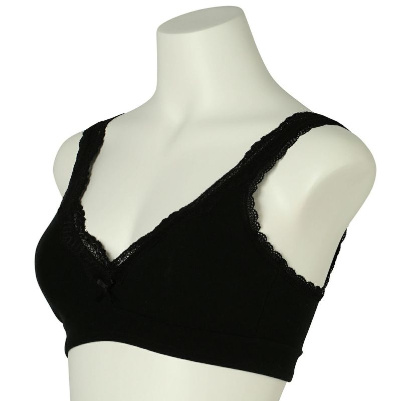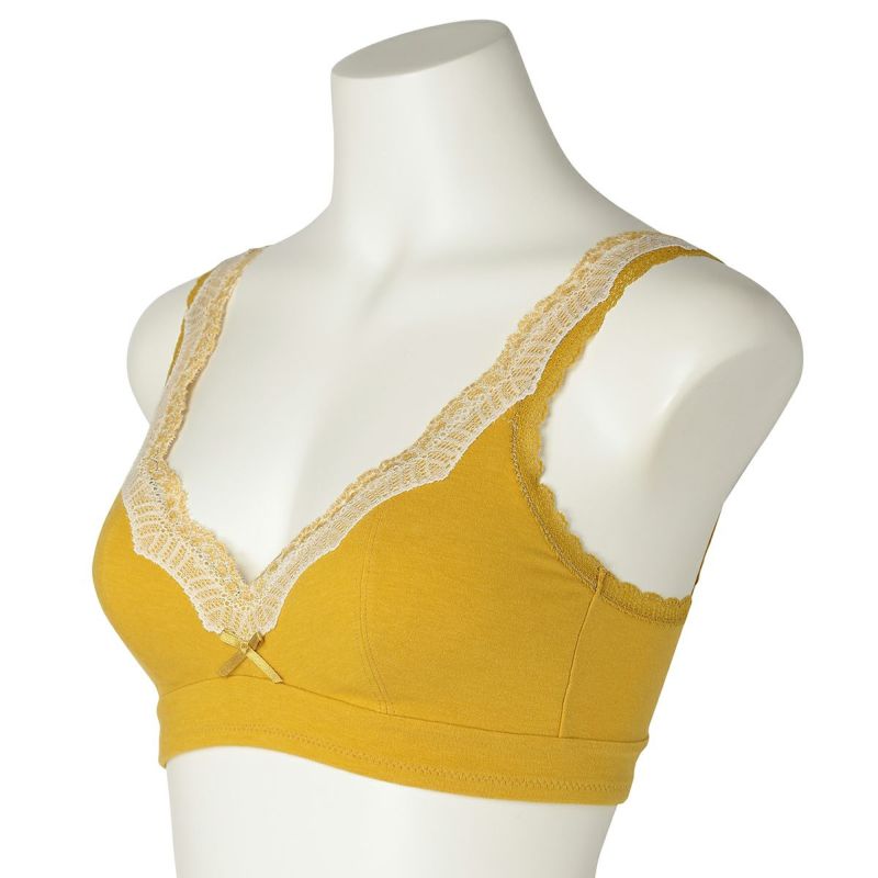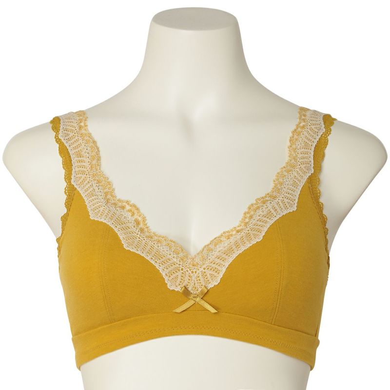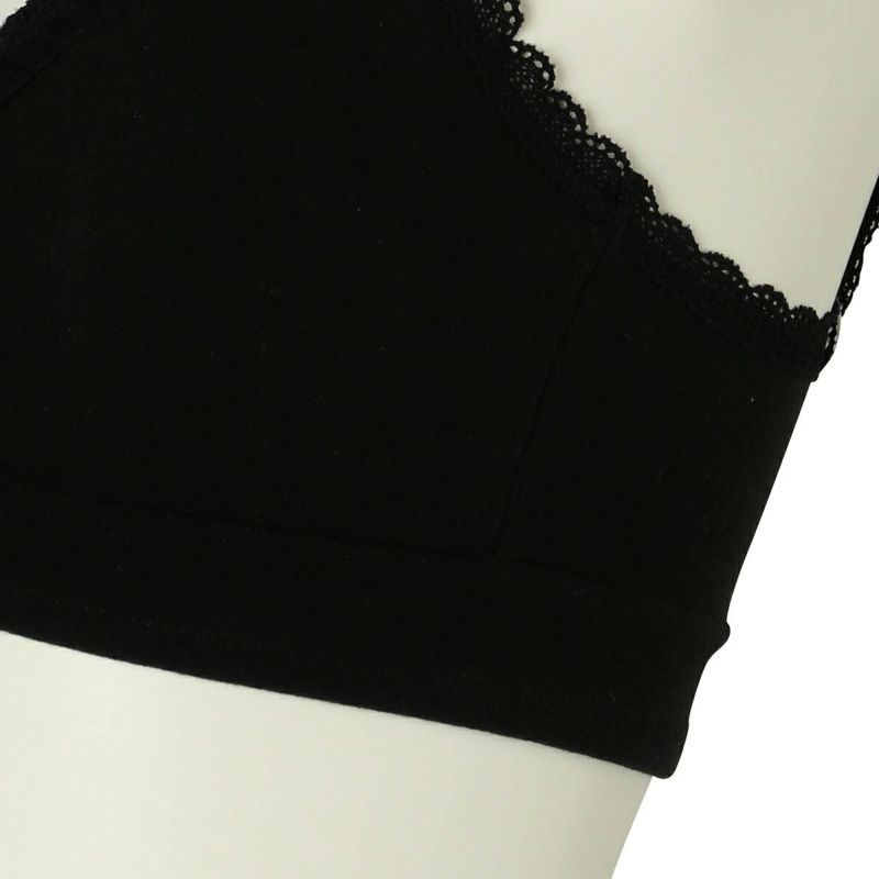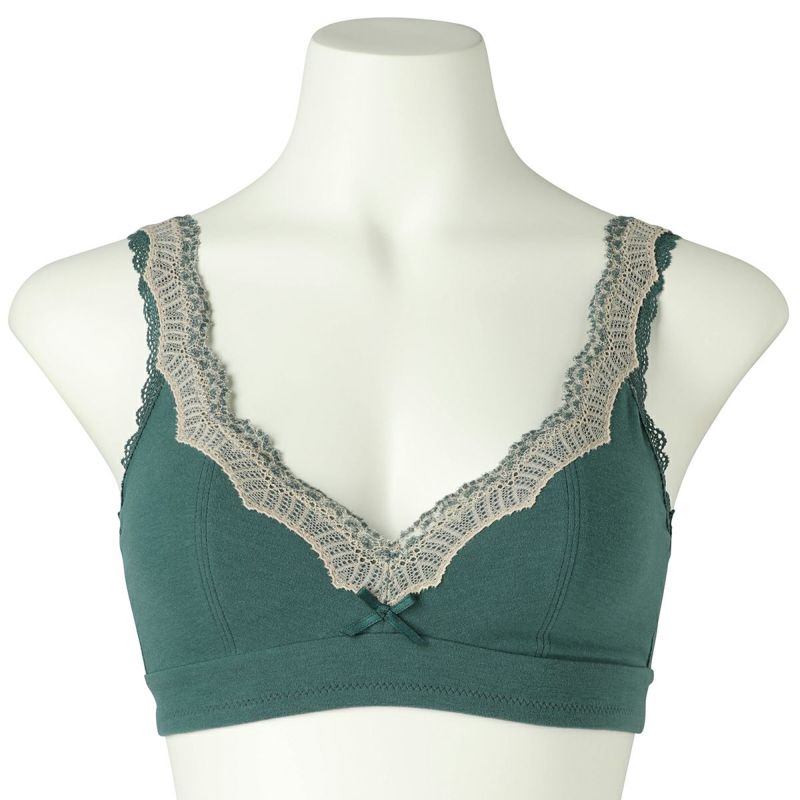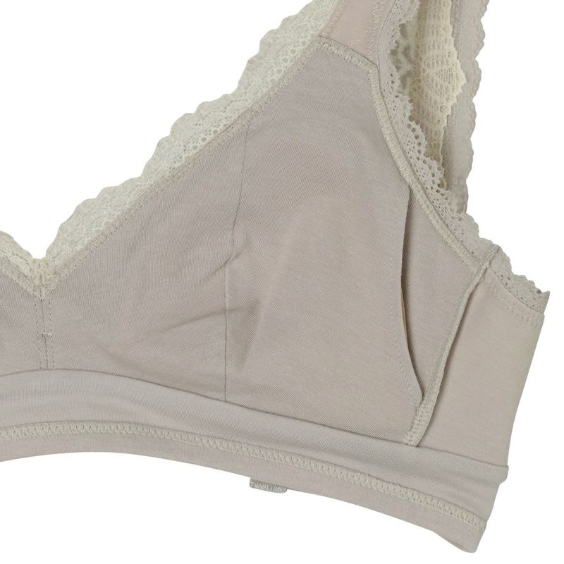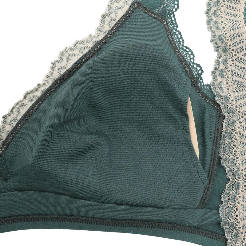 フックアイタイプのノンワイヤーブラジャーは、ナチュラルなシルエットの三角パッドタイプ。脇のボーンが無く楽な着用感ながらサイドの幅があるので安定感あり。フロントから背中まで続くレースが華やかです。カップ肌側は綿天竺。肌に当たるフックアイの部分は、綿ベア天でくるんだ特許仕様。できるだけ肌への優しさにこだわりました。