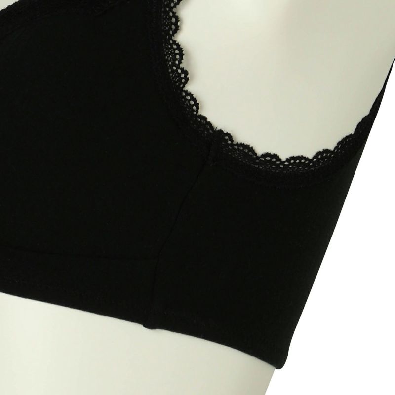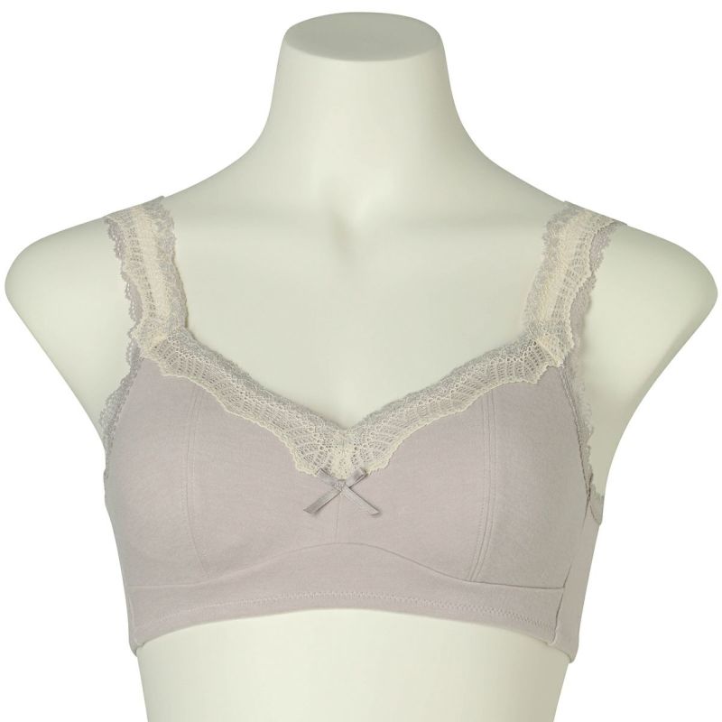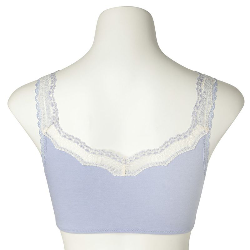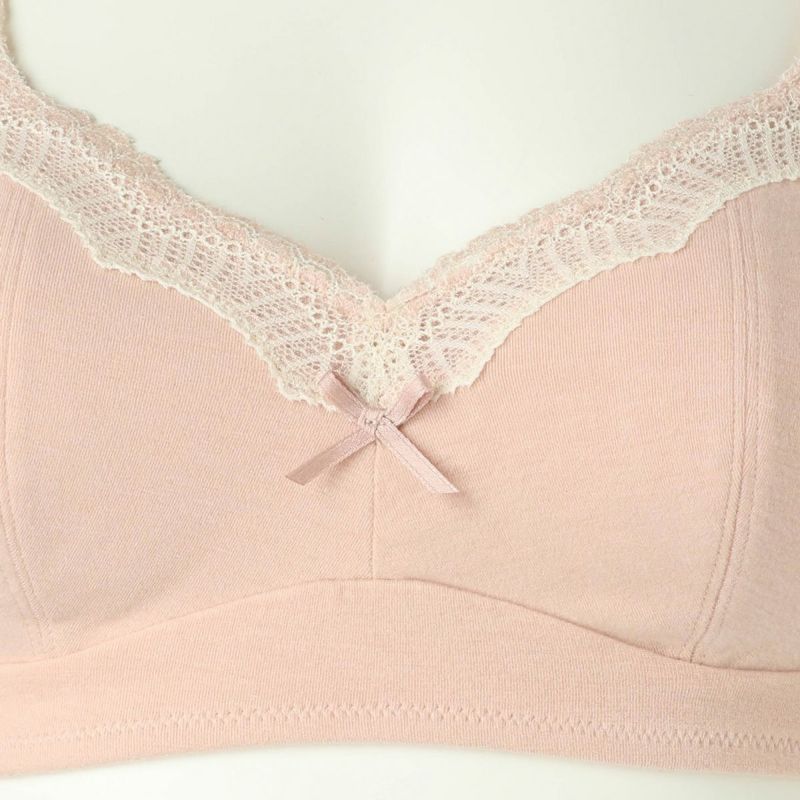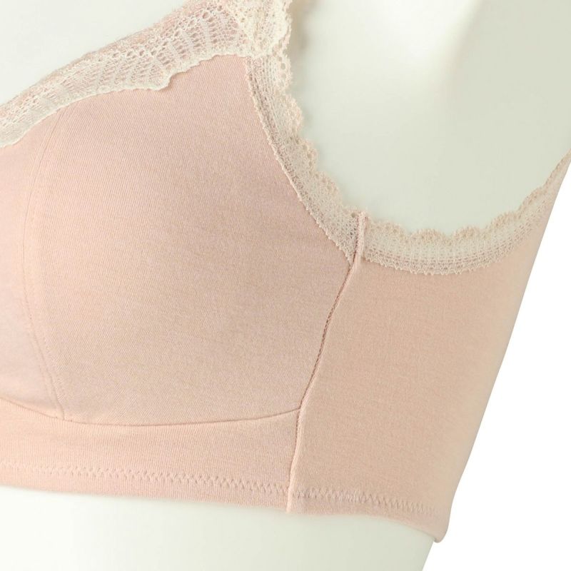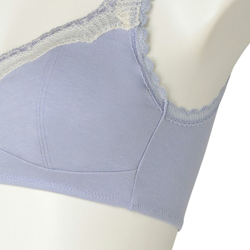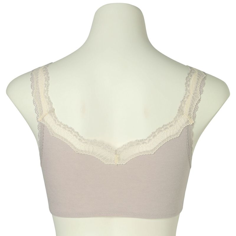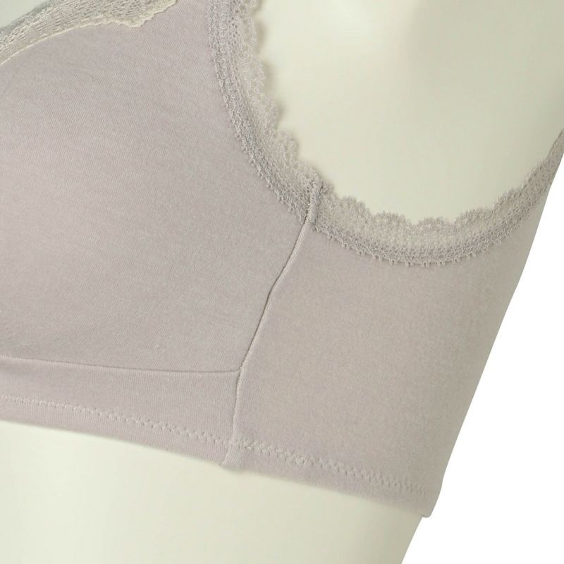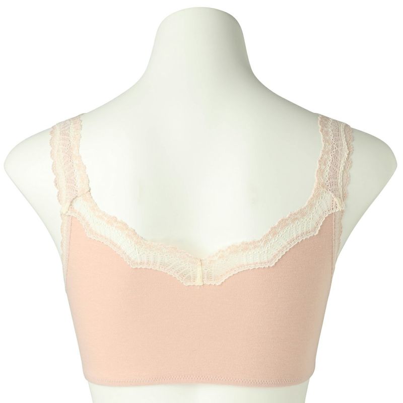着脱のしやすさが人気のホックなしかぶりタイプのノンワイヤーブラジャー。背中にもレースを施しかわいらしいポイントに。サイドや肩紐、背中上辺までゴムを使わずレースのストレッチがあるため、肩回りもソフトで快適な着心地。カップ肌側は綿天竺。できるだけ肌への優しさにこだわりました。