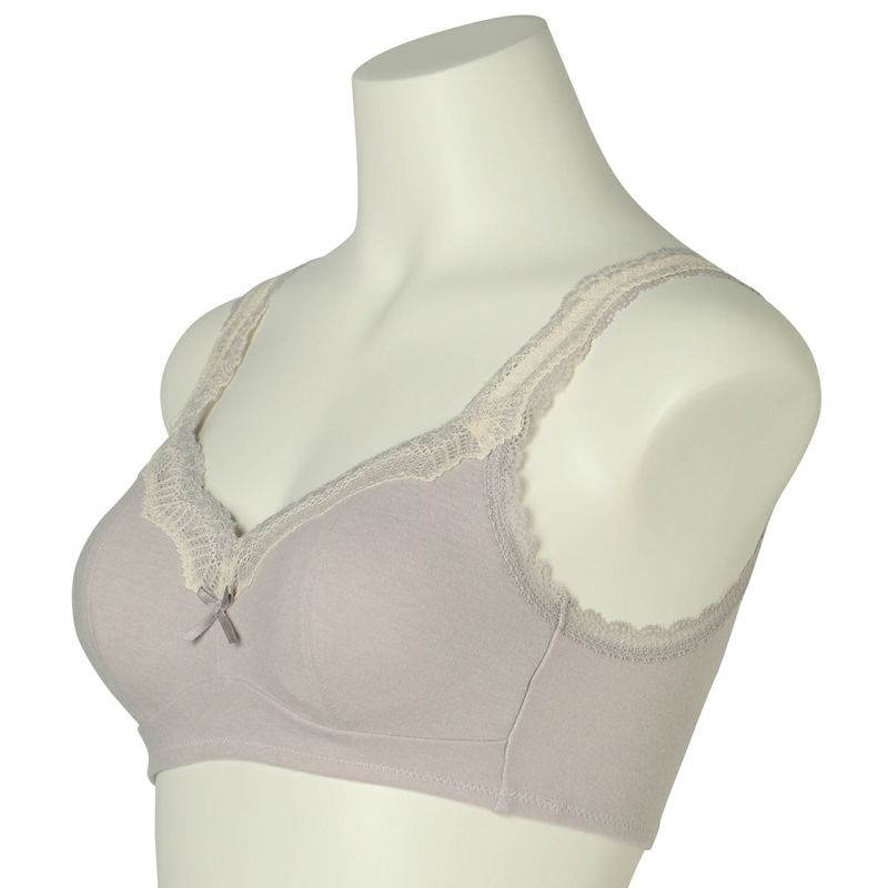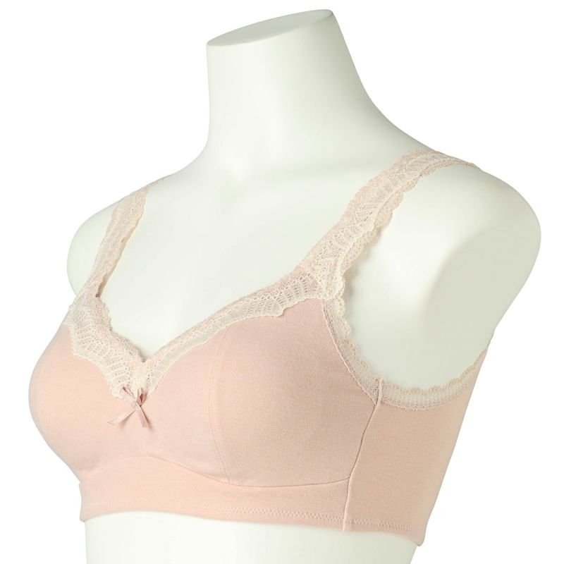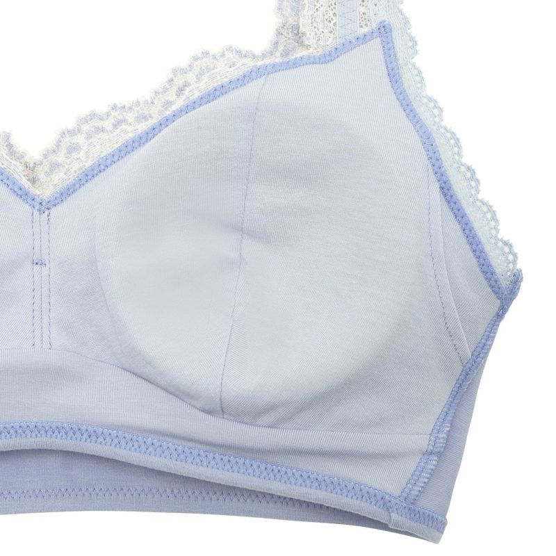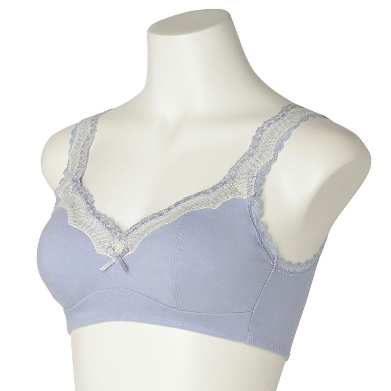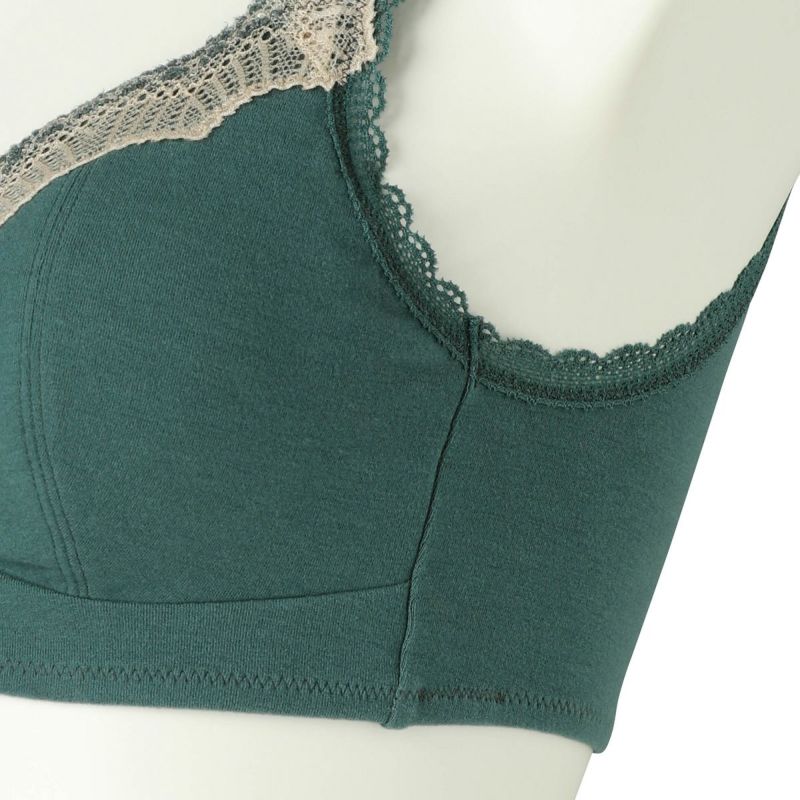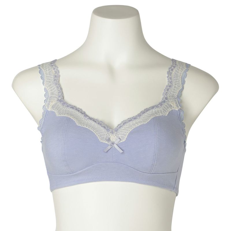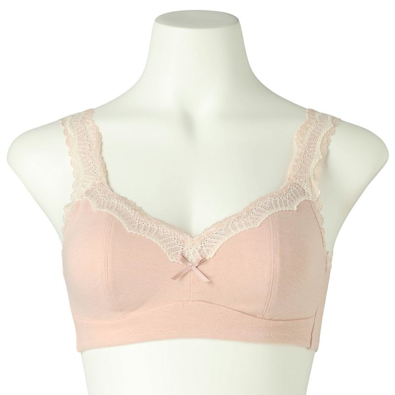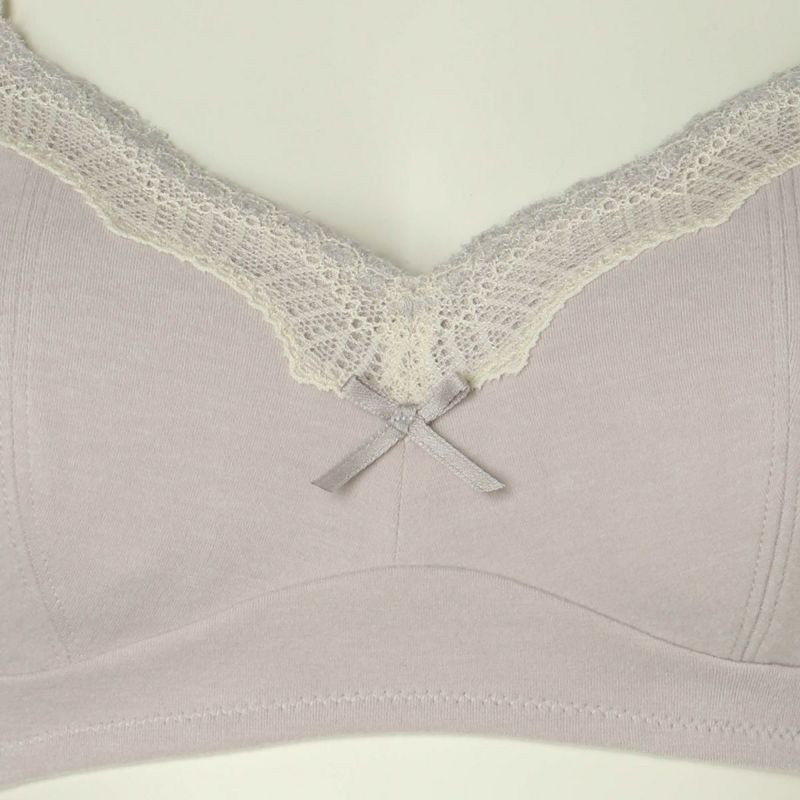 着脱のしやすさが人気のホックなしかぶりタイプのノンワイヤーブラジャー。背中にもレースを施しかわいらしいポイントに。サイドや肩紐、背中上辺までゴムを使わずレースのストレッチがあるため、肩回りもソフトで快適な着心地。カップ肌側は綿天竺。できるだけ肌への優しさにこだわりました。
