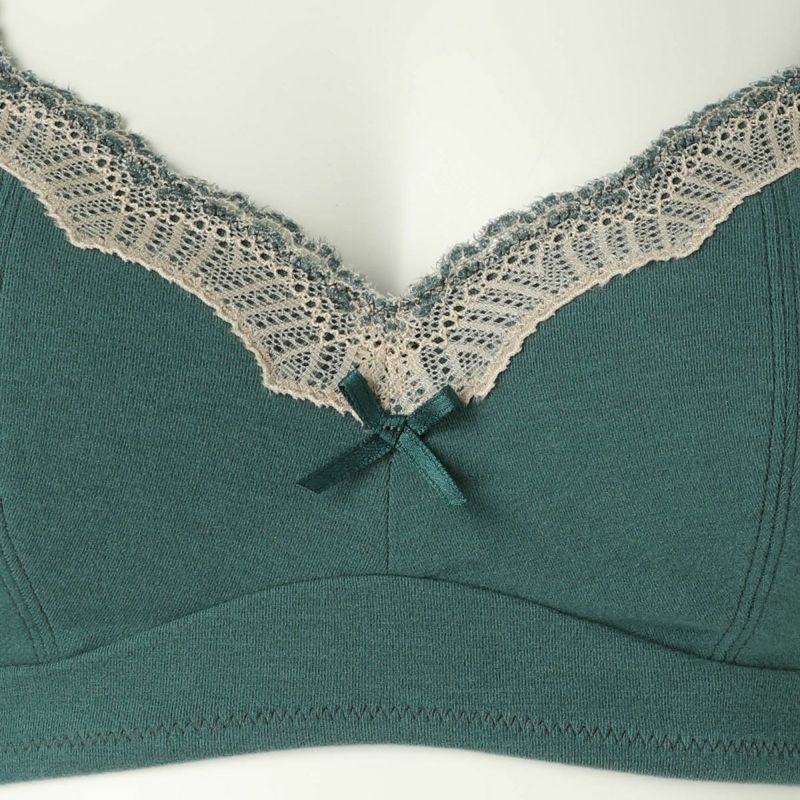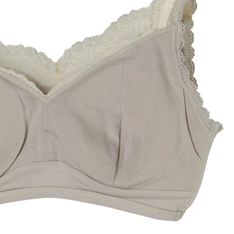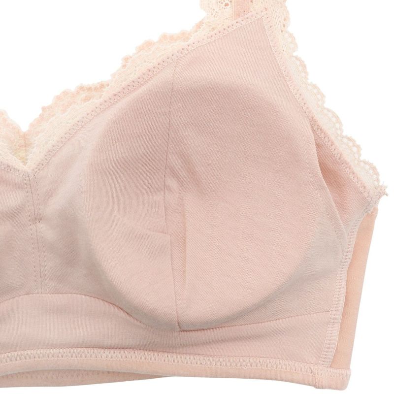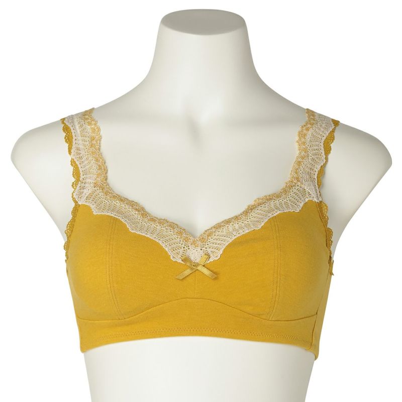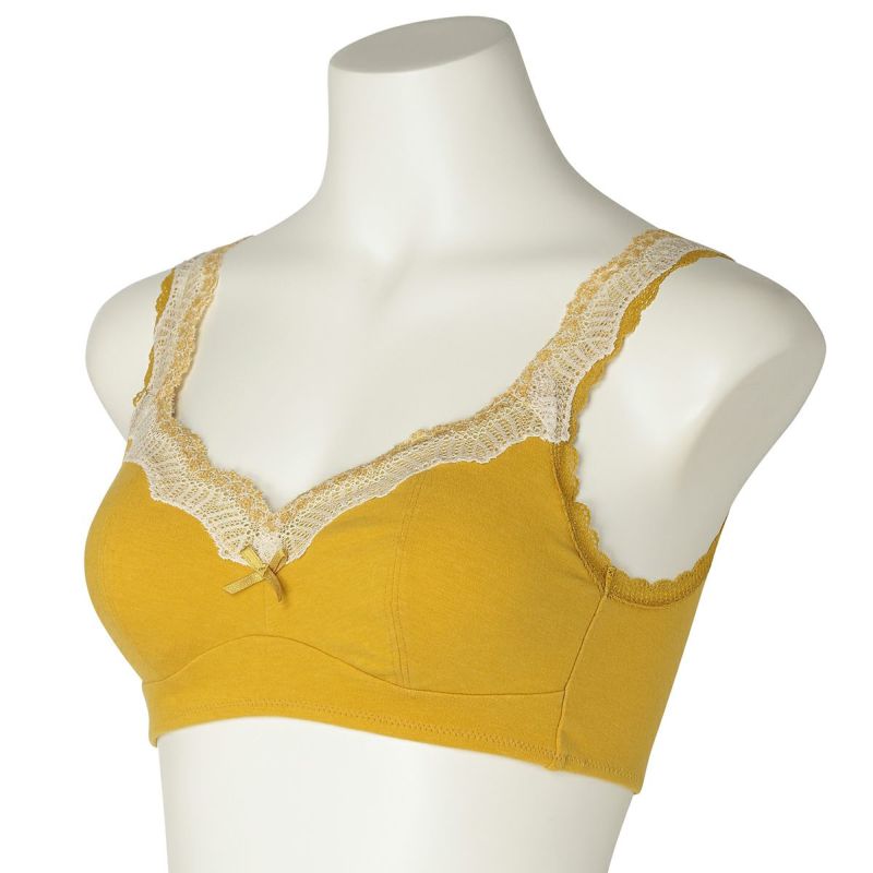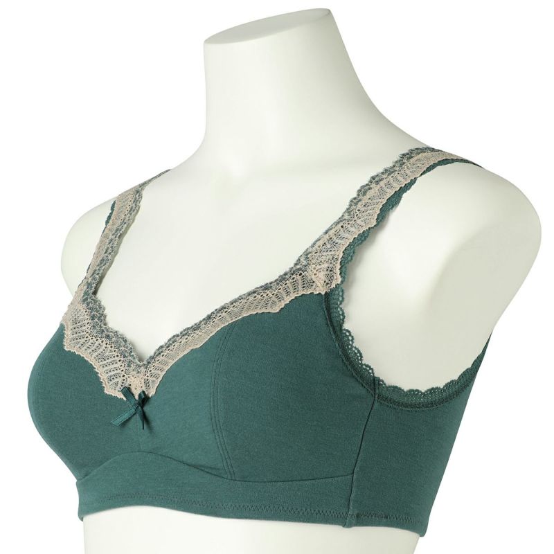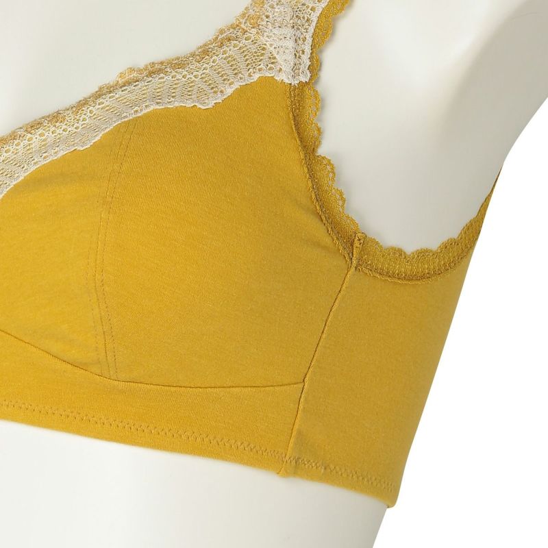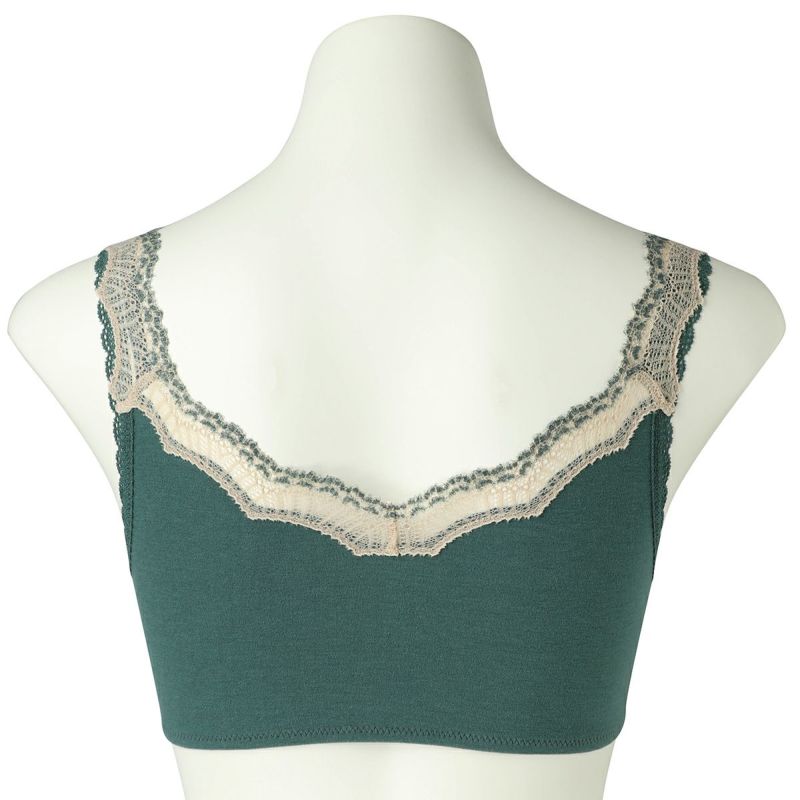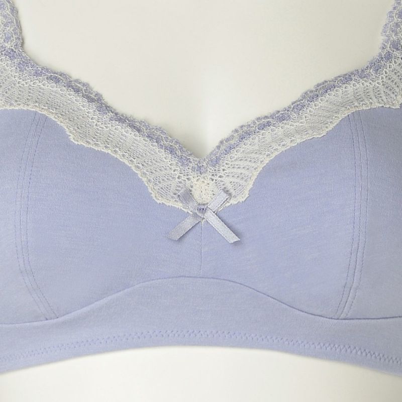 着脱のしやすさが人気のホックなしかぶりタイプのノンワイヤーブラジャー。背中にもレースを施しかわいらしいポイントに。サイドや肩紐、背中上辺までゴムを使わずレースのストレッチがあるため、肩回りもソフトで快適な着心地。カップ肌側は綿天竺。できるだけ肌への優しさにこだわりました。