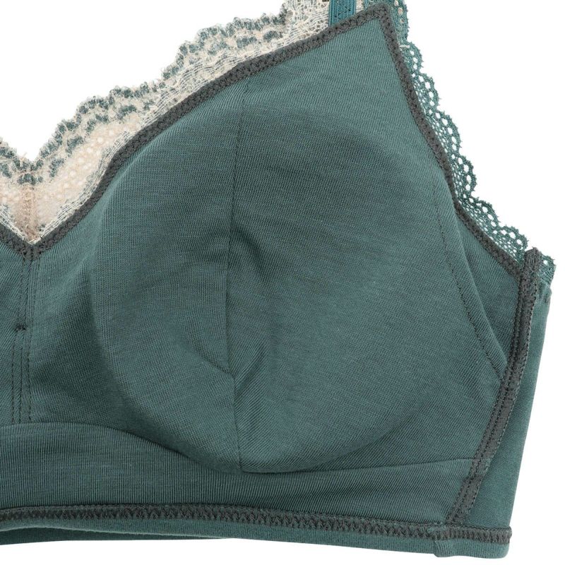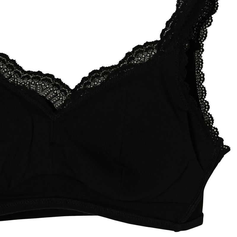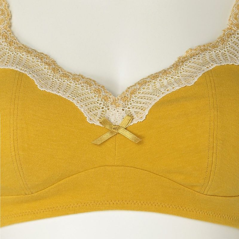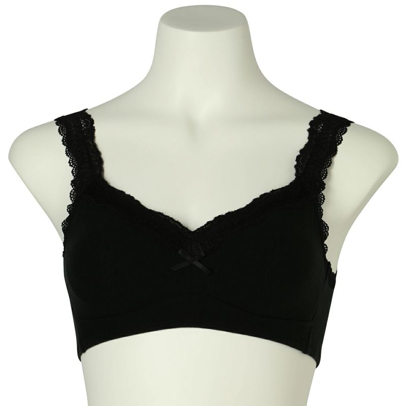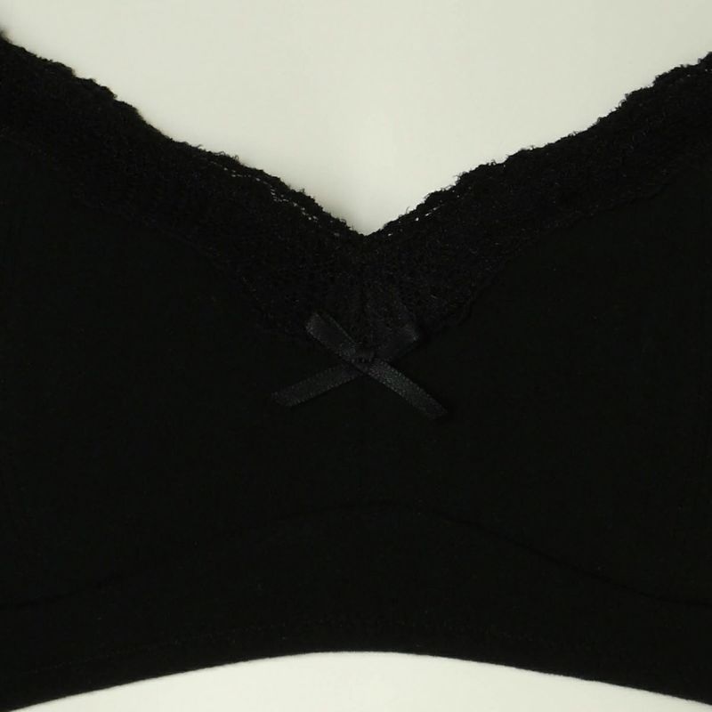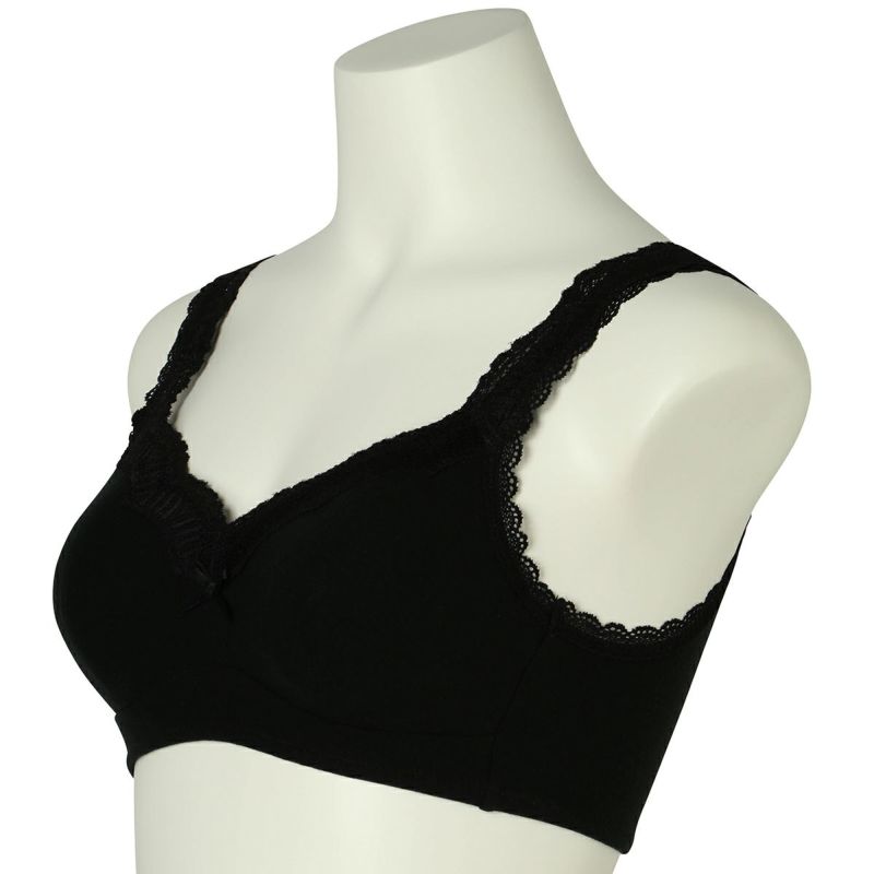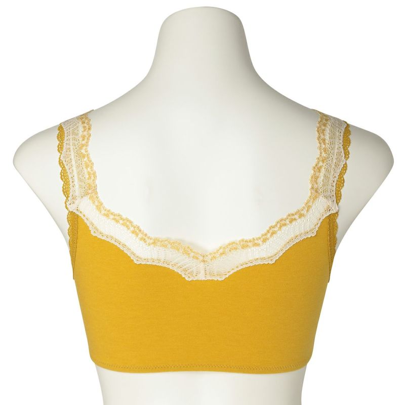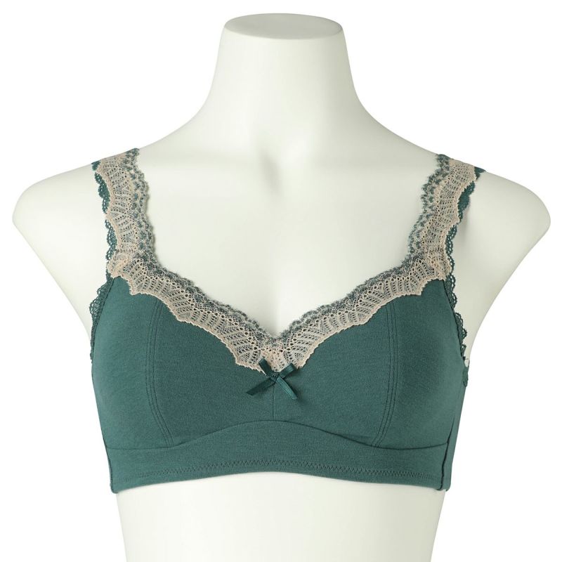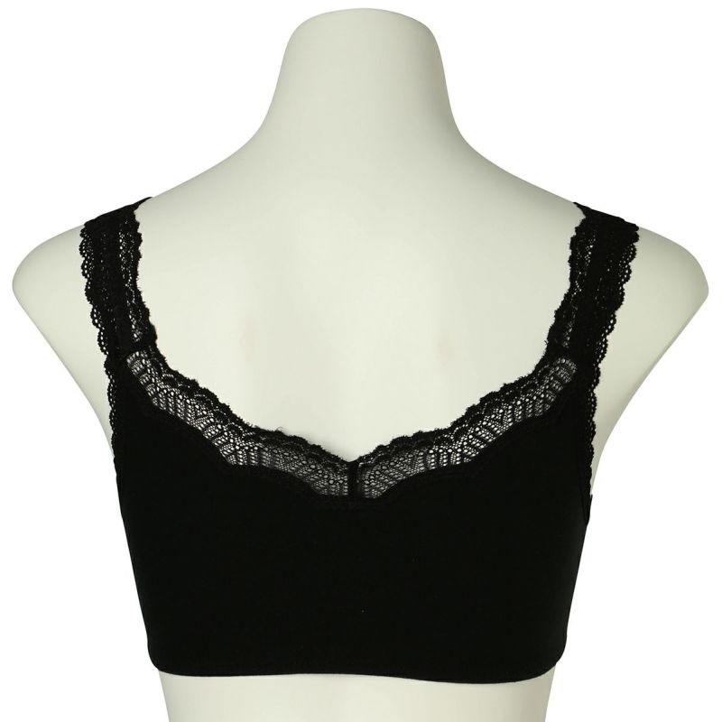 着脱のしやすさが人気のホックなしかぶりタイプのノンワイヤーブラジャー。背中にもレースを施しかわいらしいポイントに。サイドや肩紐、背中上辺までゴムを使わずレースのストレッチがあるため、肩回りもソフトで快適な着心地。カップ肌側は綿天竺。できるだけ肌への優しさにこだわりました。