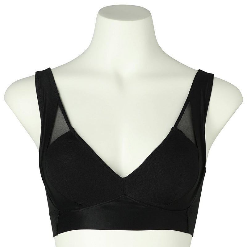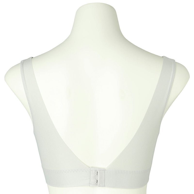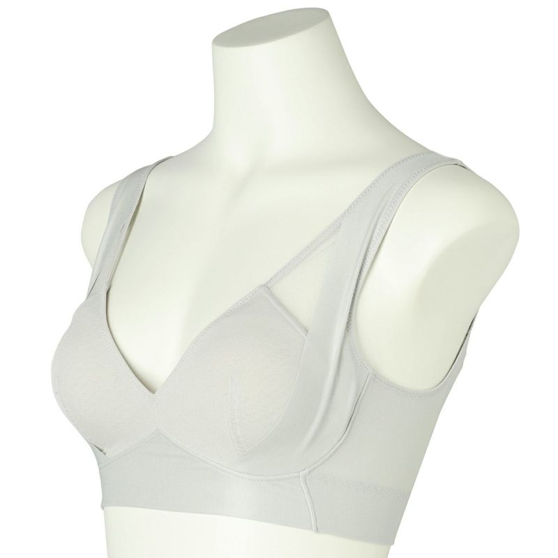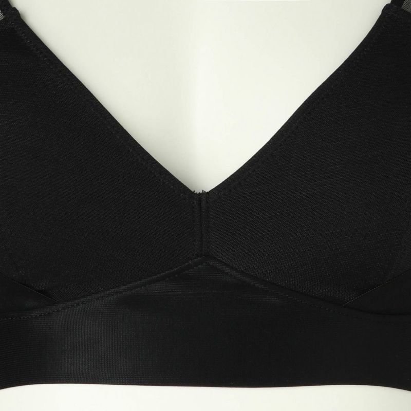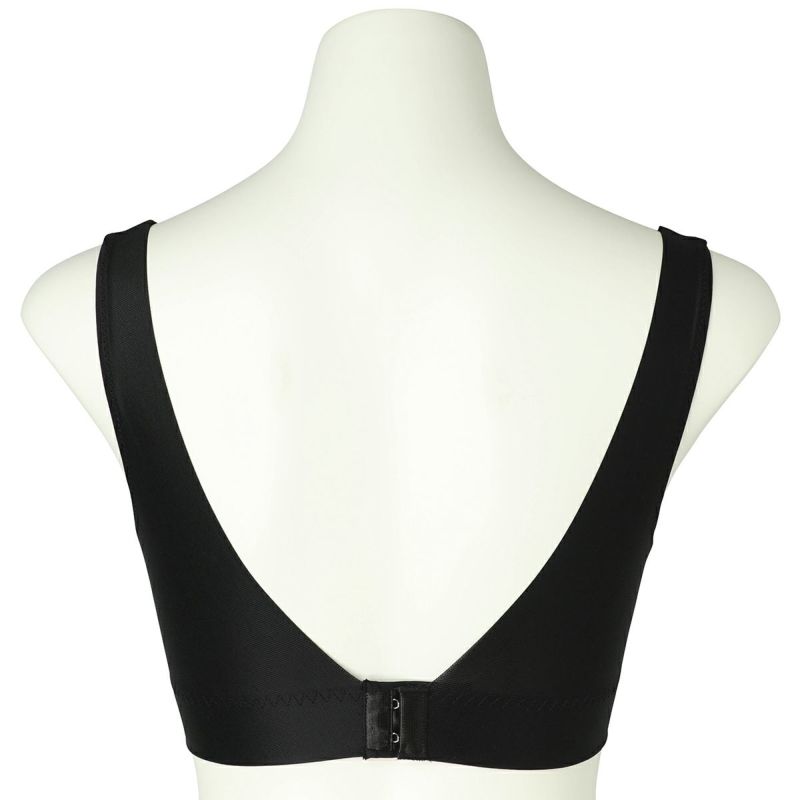 フックアイタイプのノンワイヤーブラジャーは、バストの流れを防ぎ、シルエットを整える脇高設計。フックアイは共地くるみの特許仕様。
