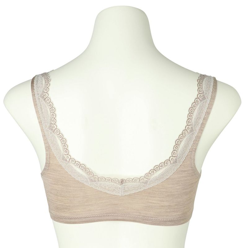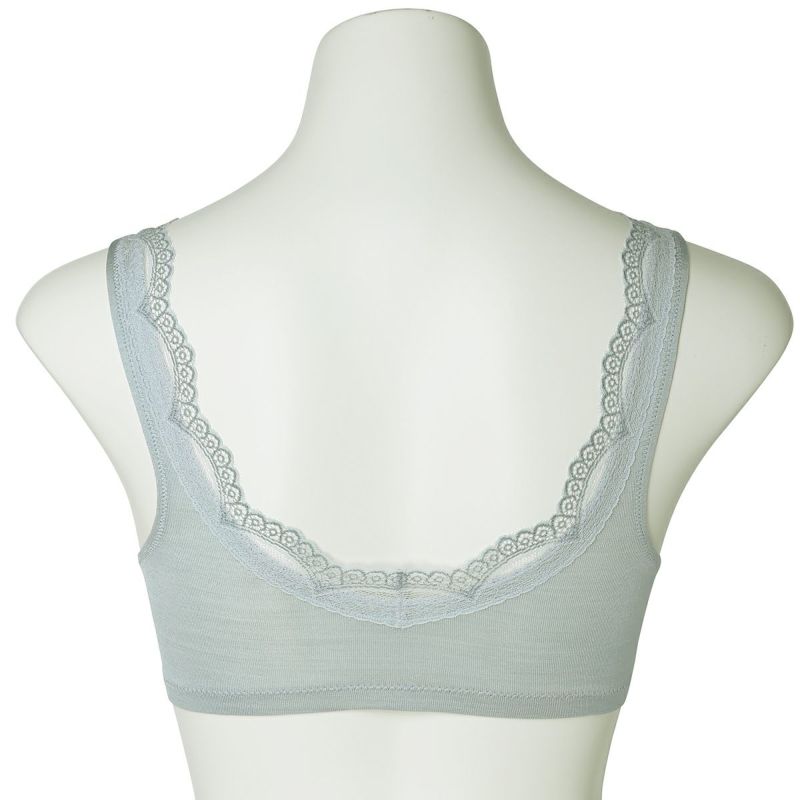 すっきりとしたフロントV。スカラーがかわいらしいレースを背中までたっぷりあしらいました。ストレッチが効いたレースで肌に馴染むのでカップが浮きにくい仕様です。ホックや肩紐の調整も無しなのでずれにくく安心の着用感。