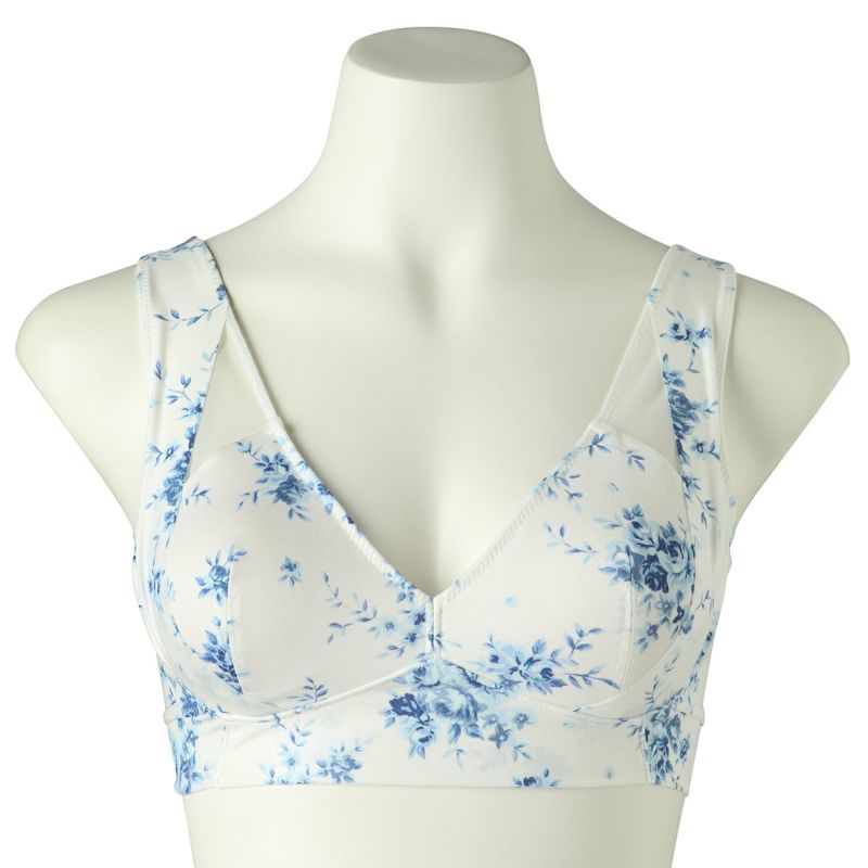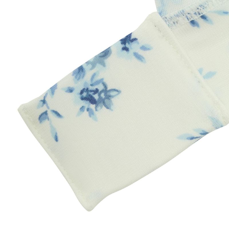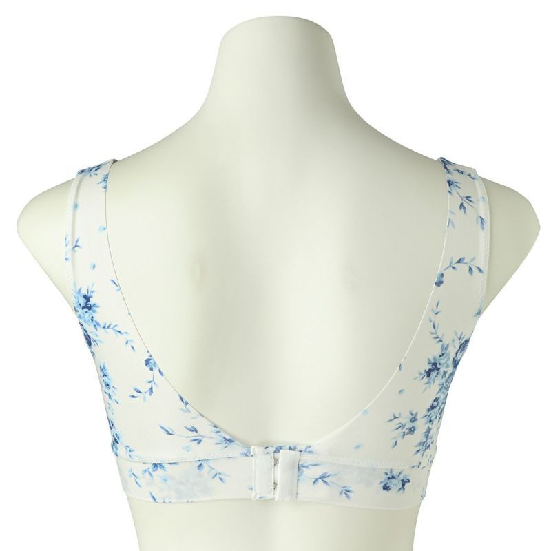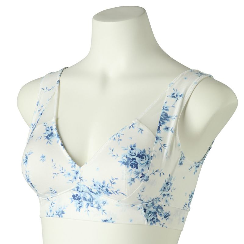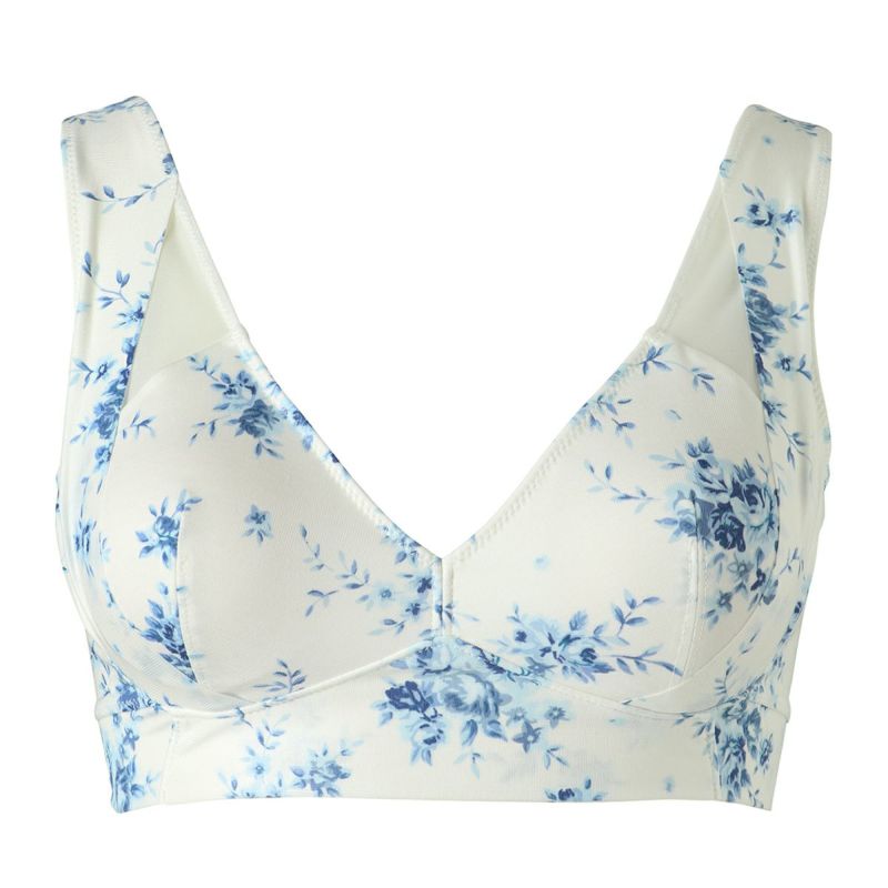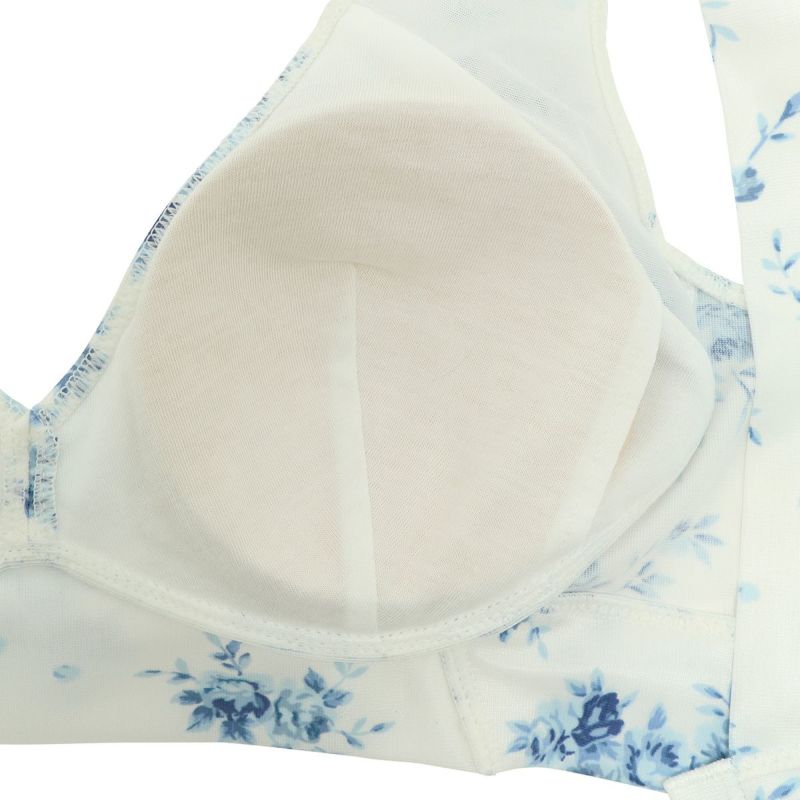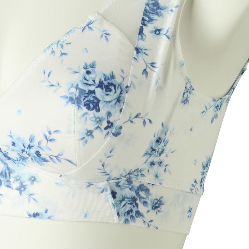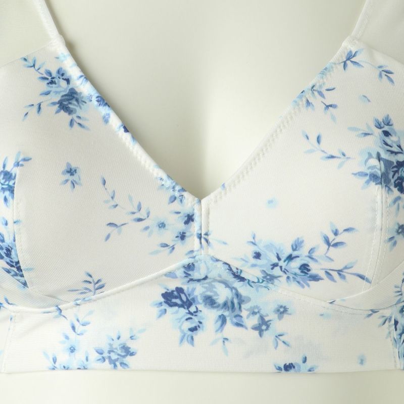 肌側綿混でふちに縫い目のないヘム素材を活かしたシリーズ。肌との段差が出にくくなめらかなシルエットに。キッドブルーのオリジナルの華やかなブラッサムプリントを施しました。