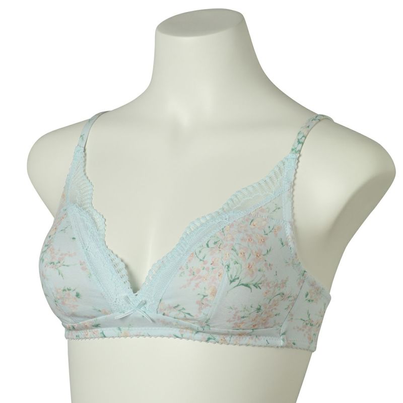 レースと透明感のあるリボンがかわいさを添える総柄のフックタイプノンワイヤーブラジャー。ストラップまで花柄なので見えても下着見えしないタイプ。三角パッドタイプでバストにレースが馴染むのでカップが浮きにくい。サイドボーンが無いので楽に着られる。カップ肌側は綿天竺。アンダーバスト肌側も綿混素材、品質表示タグもカップ内側に入れ直接肌に当たらない仕様にし、肌への優しさにこだわりました。