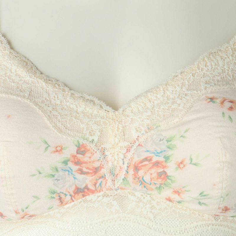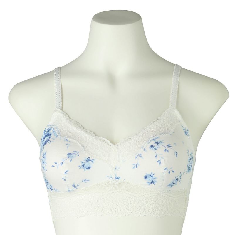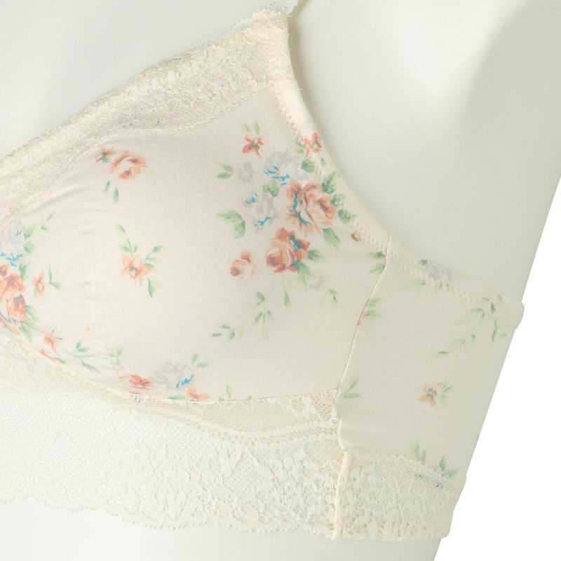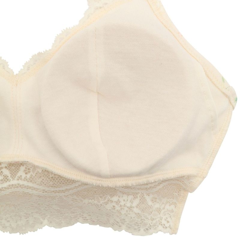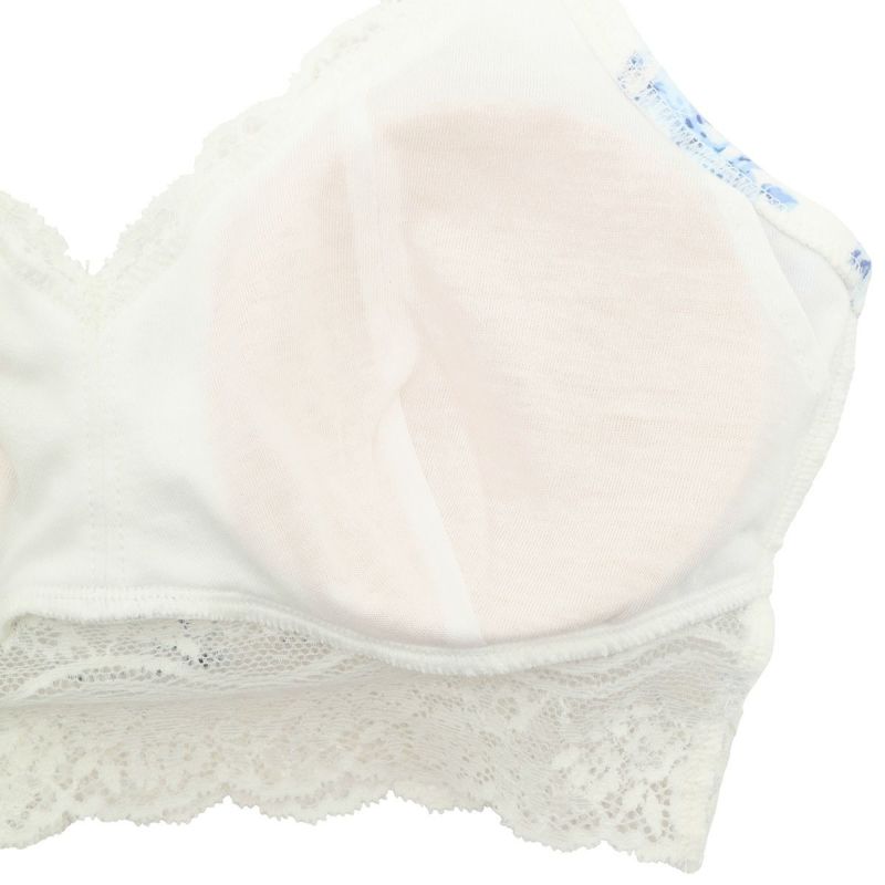 取り外し可能な丸パッド入りでナチュラルなラインのノンワイヤーブラジャー。上カップとアンダー部分に綿混レースをあしらいよりフェミニンに。ホックがなくかぶるタイプなので背中のごろつきもなく、リラクシーな着用感。