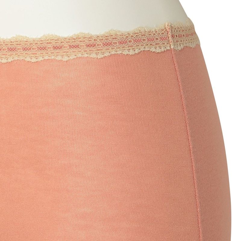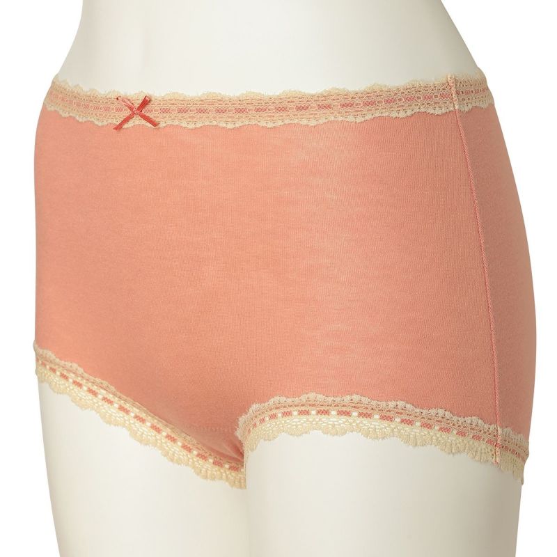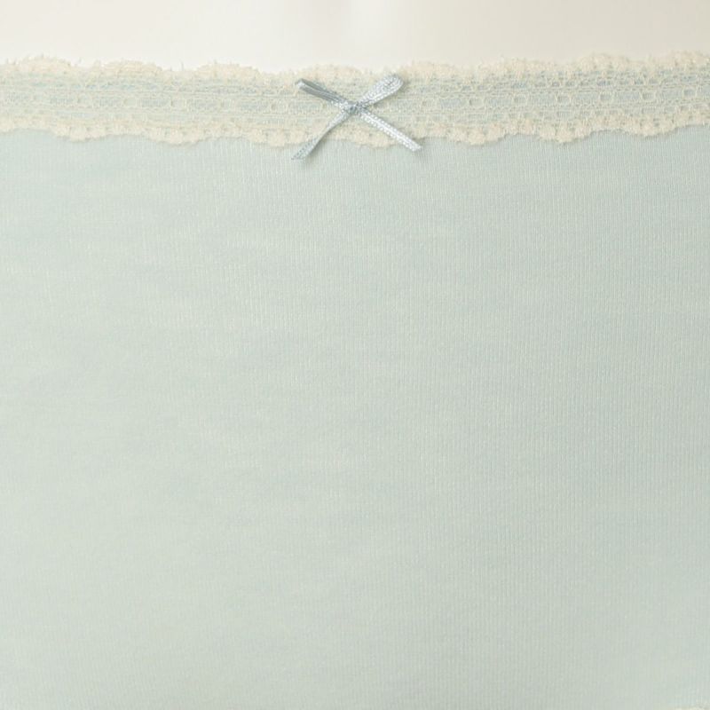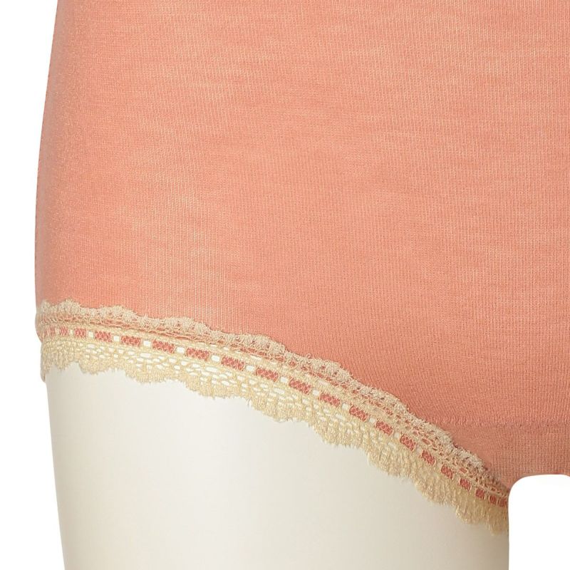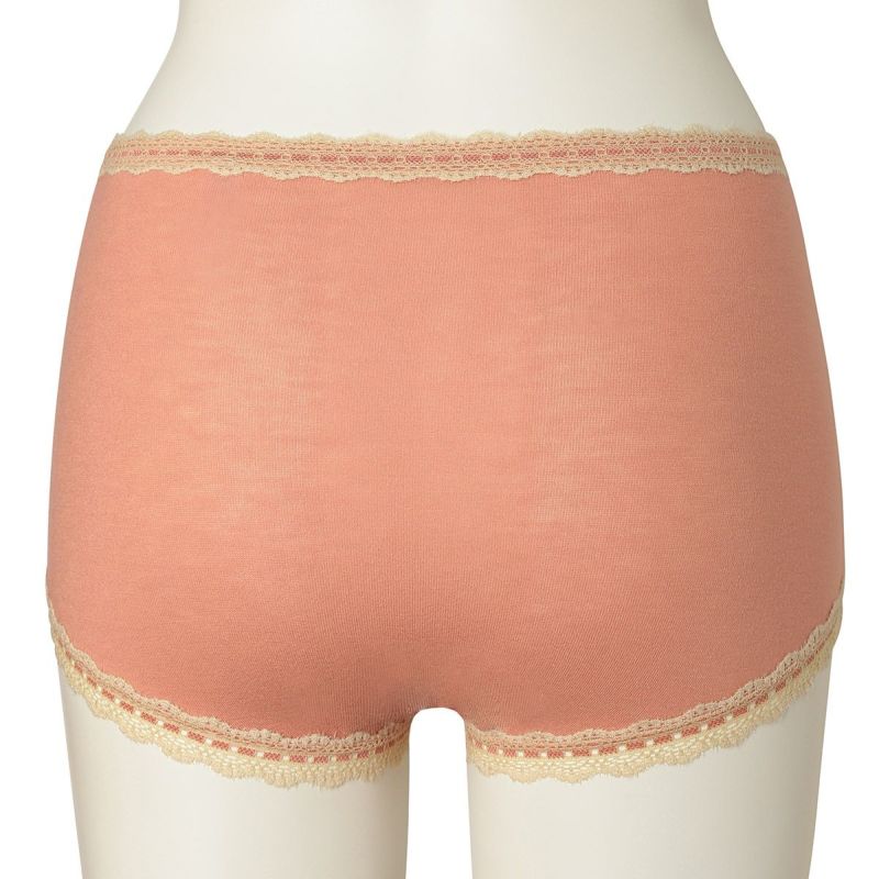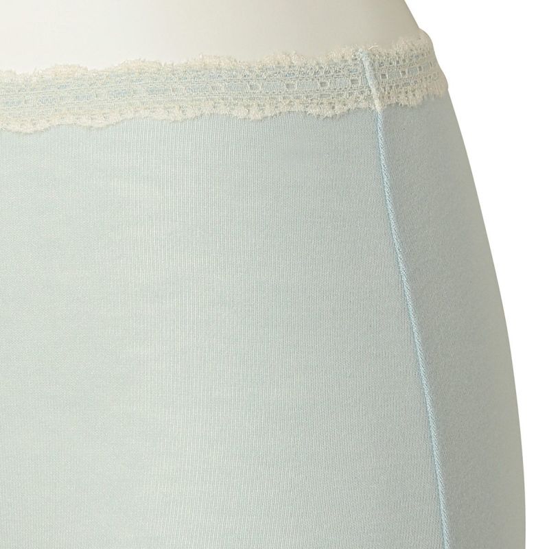 やや深めの丈でヒップの包み込みがよく安心感のある履き心地が人気のショートカルソン。ウエストと足ぐりにもリボンを通したようなレースを施しかわいらしく仕上げました。